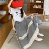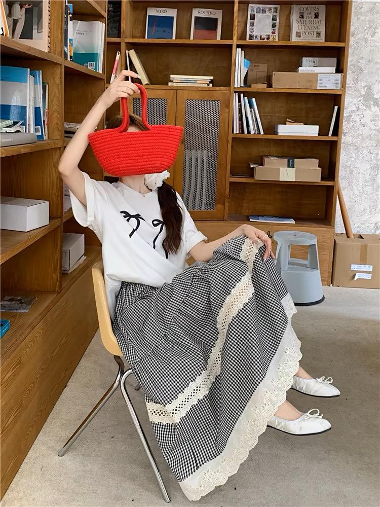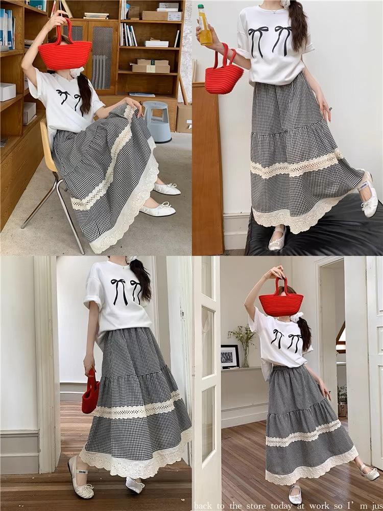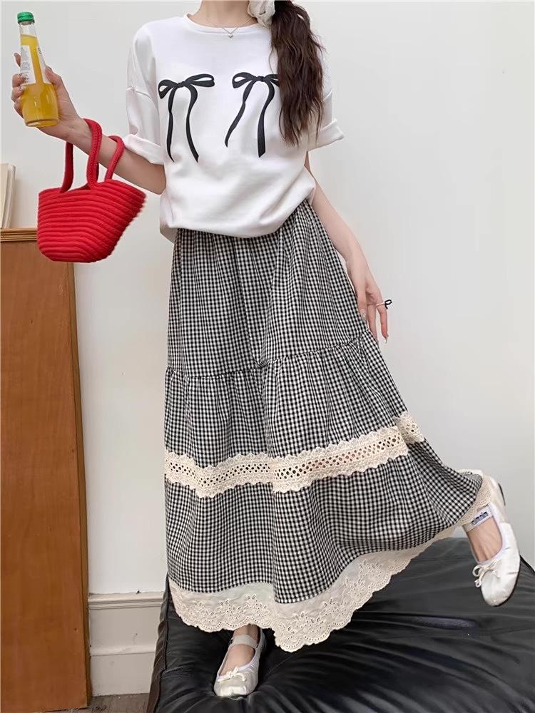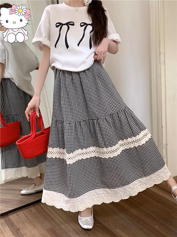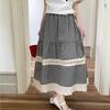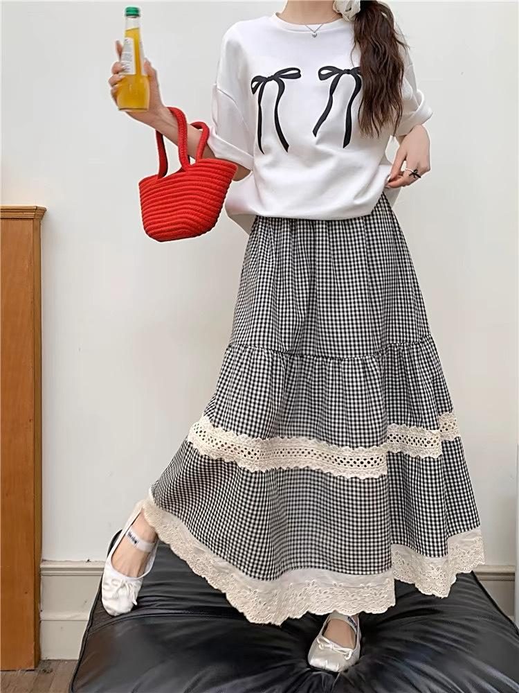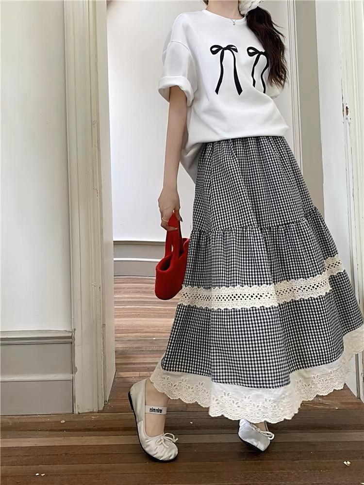 Falda Escocesa Retro para Mujer Primavera y Verano Nueva Falda Versátil A-Line de Cintura Alta Elástica Empalme de Encaje en Contraste Falda Midi