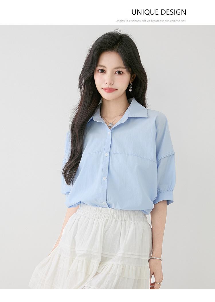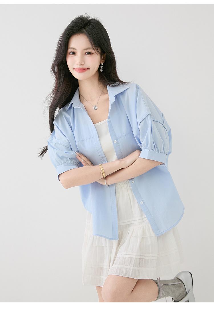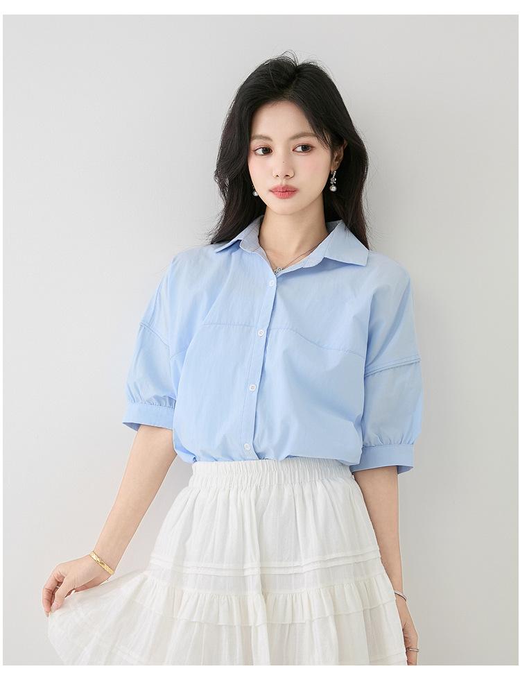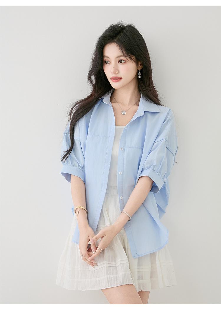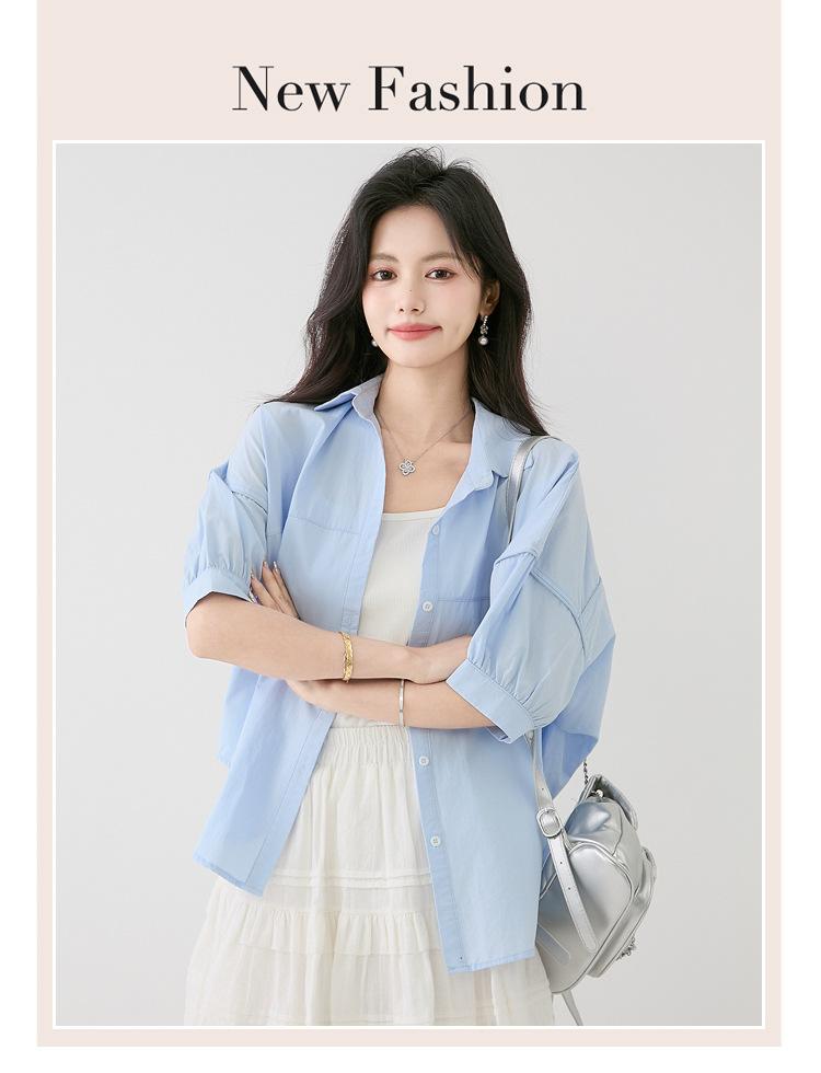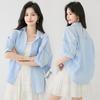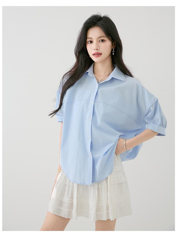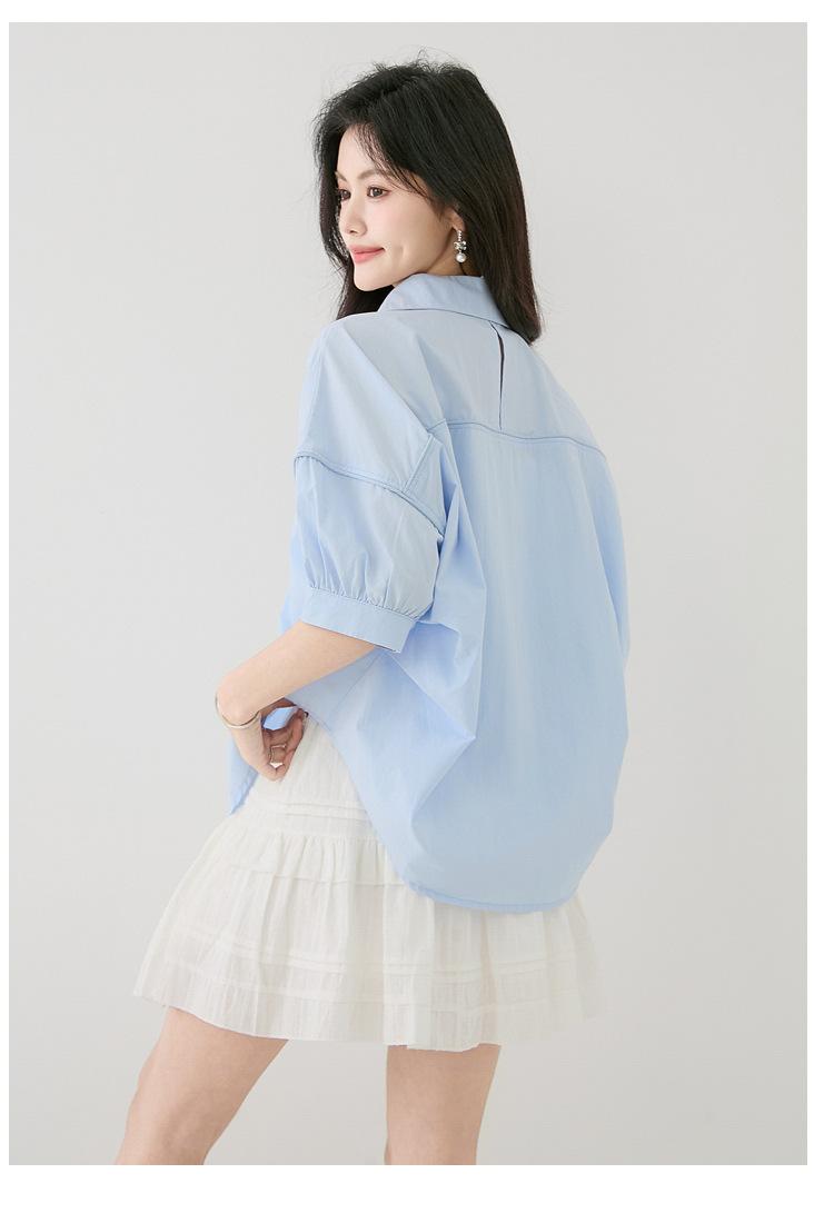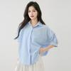 2025 Nuevo Verano Estilo Coreano Casual Versátil Holgado Diseño Azul de Manga Corta Camisa de Algodón Puro para Mujer