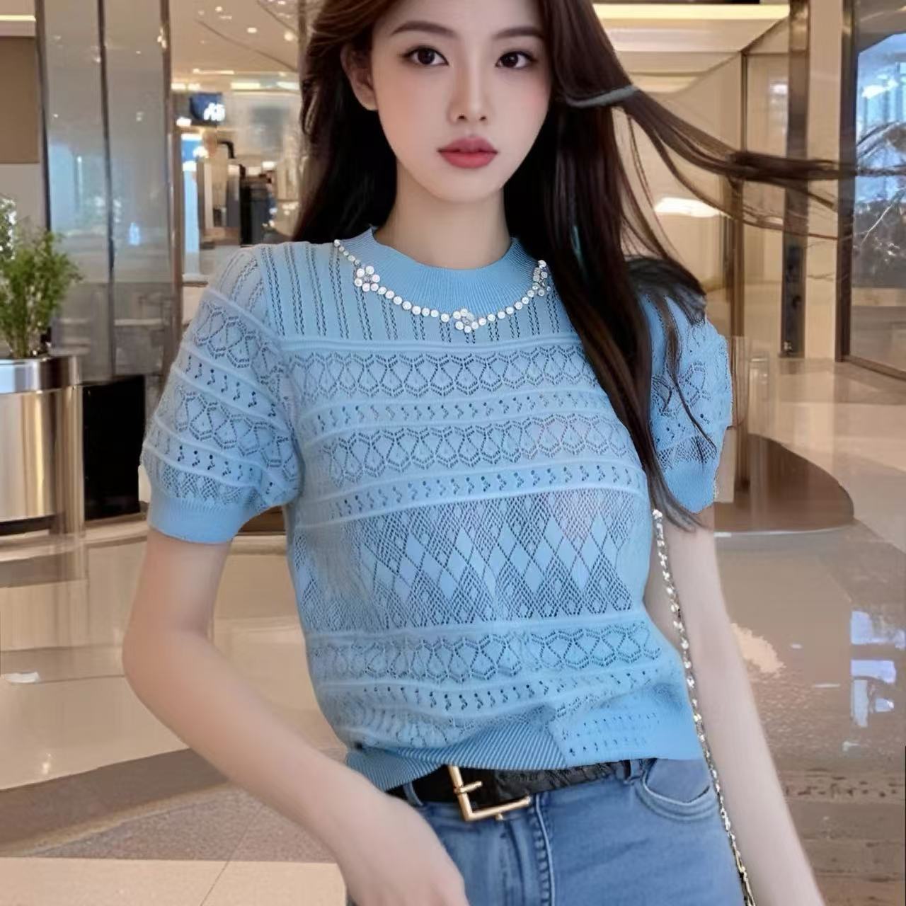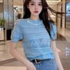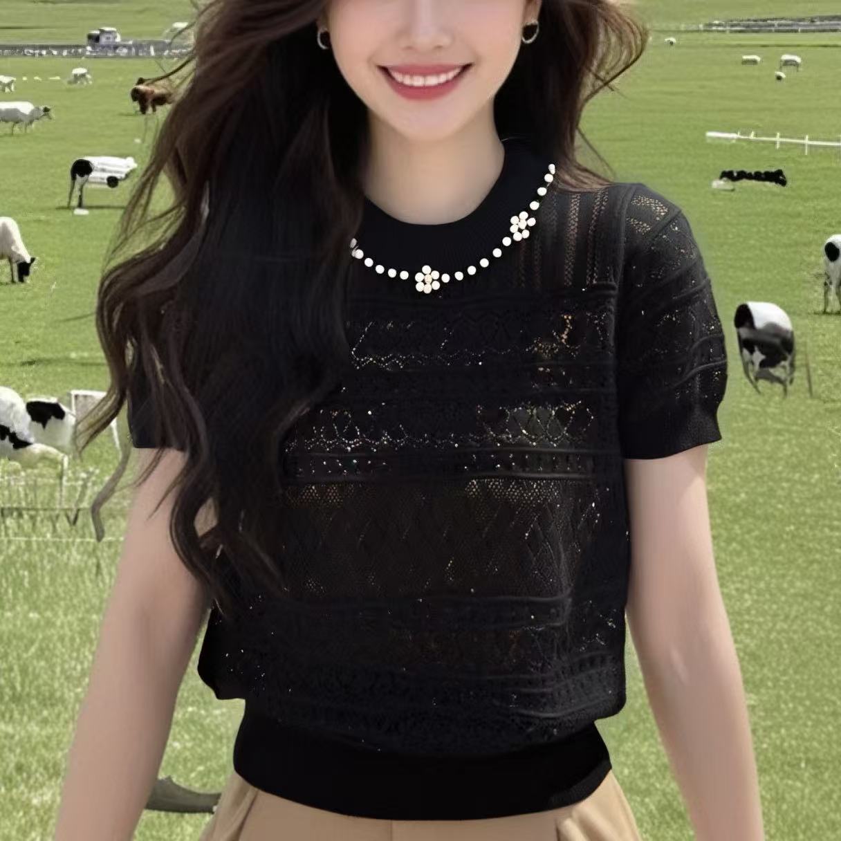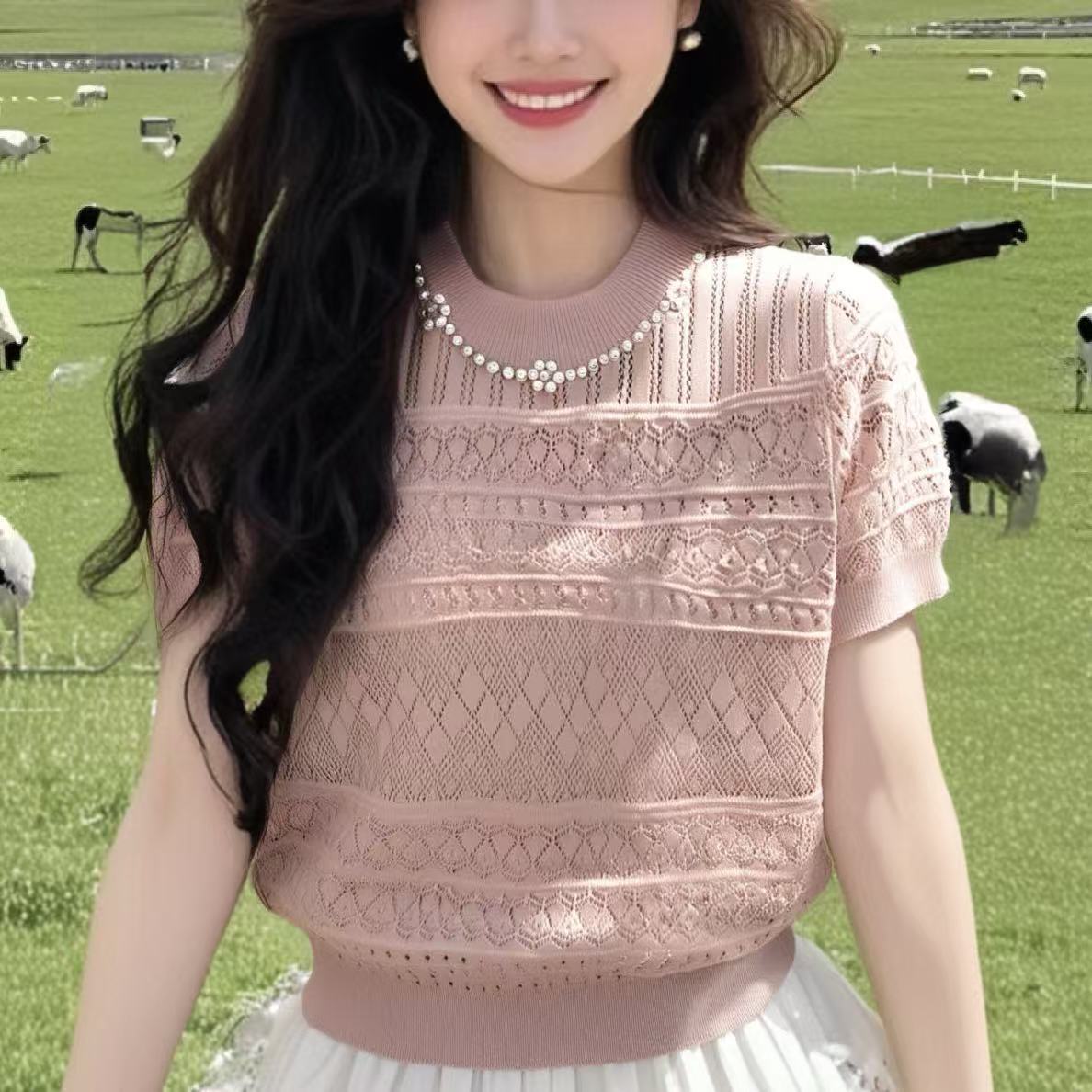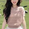 Suéter corto de punto con temperamento calado de diseño veraniego, camiseta de manga corta dulce y chic de nicho francés, prenda exterior