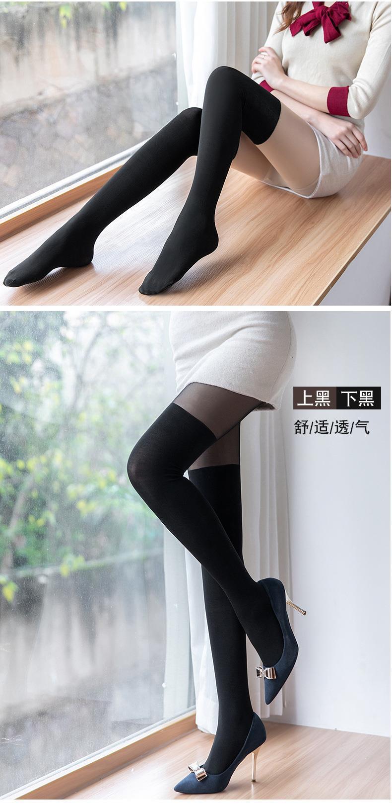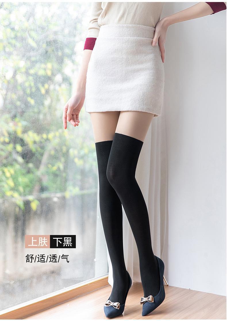 Calcetines Largos de Verano y Primavera Falsos hasta el Muslo, Medias Empalmadas de Dos Piezas para Mujer, Delgadas de Color Sólido Artefacto Pierna Desnuda, Anti-Desgarro Negro