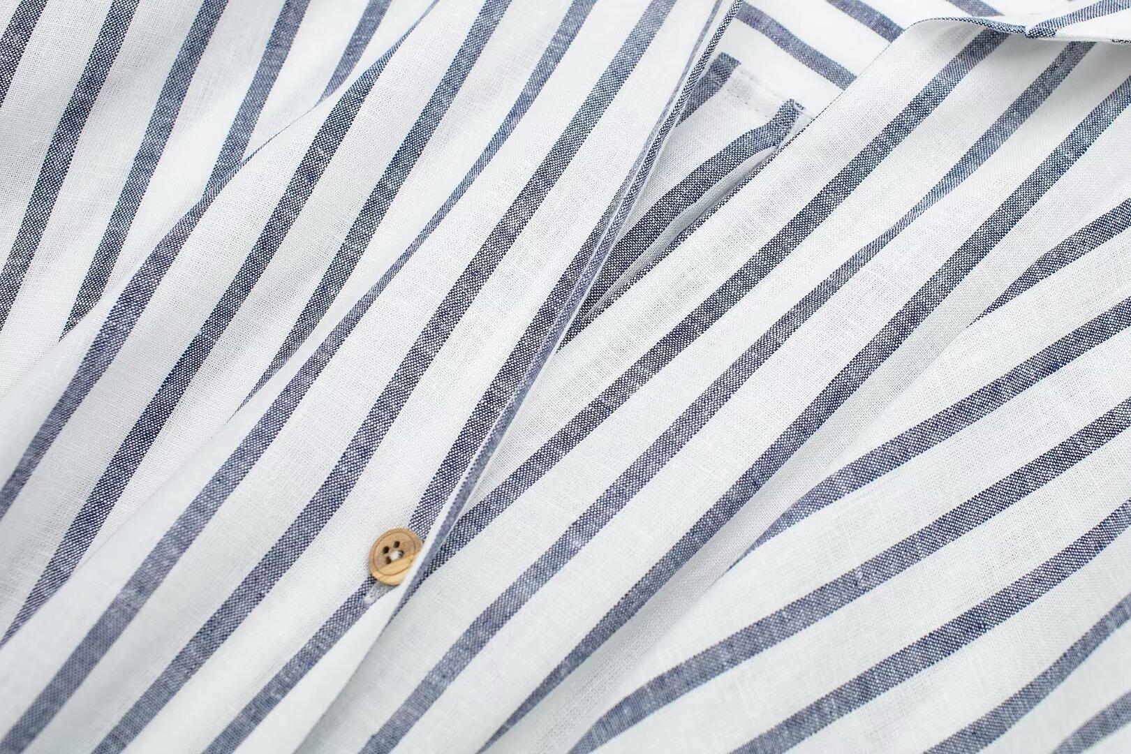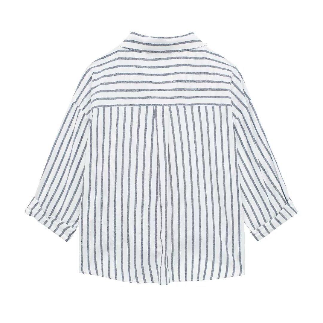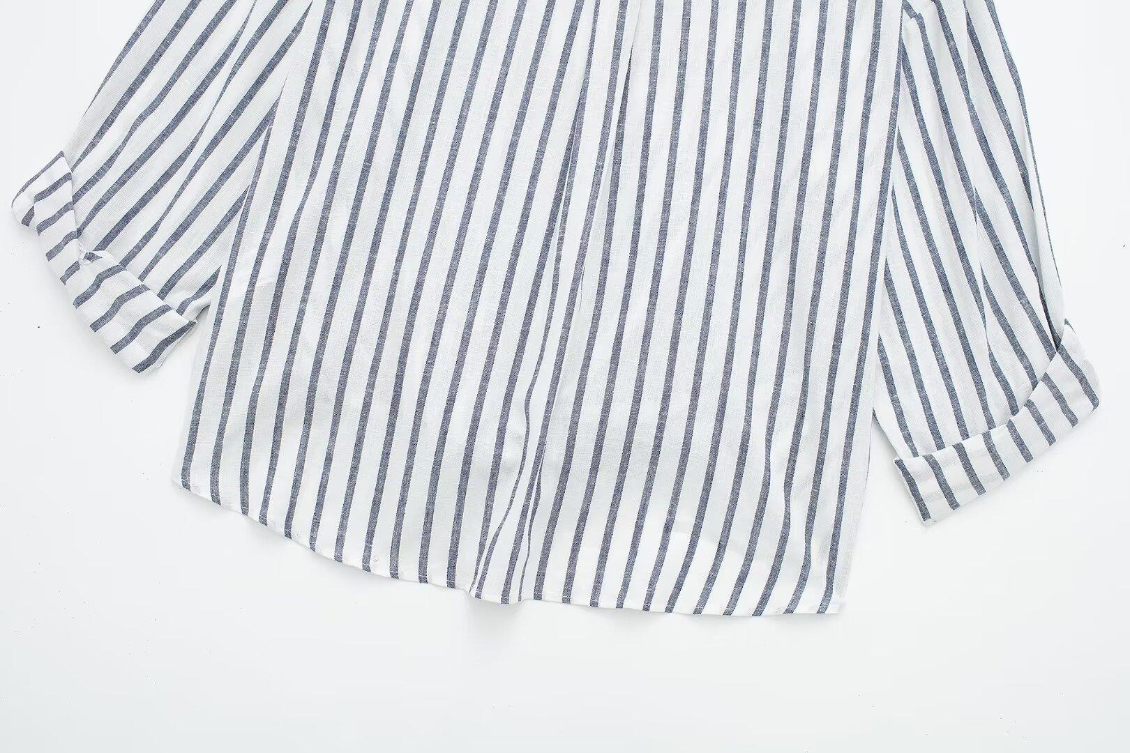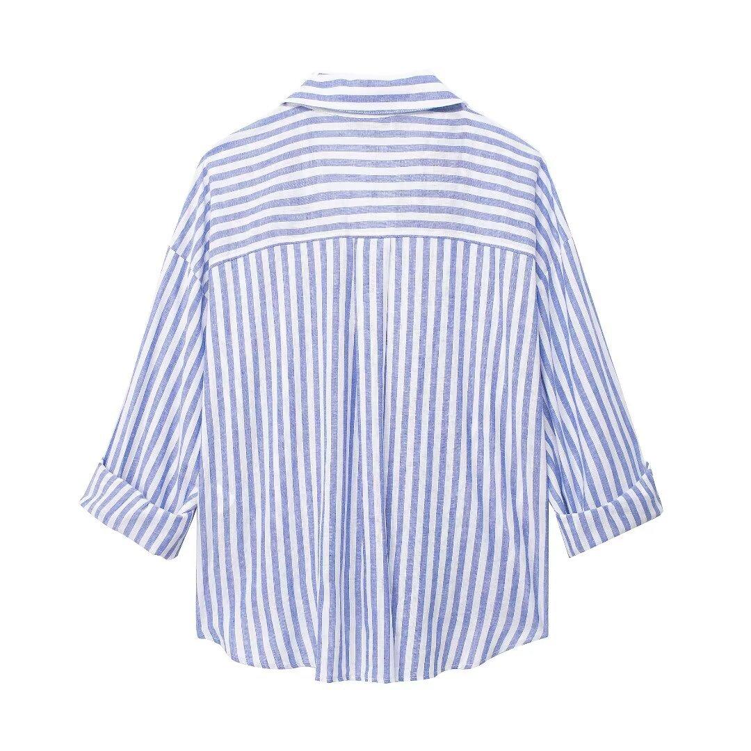 Camisa de Mezcla de Lino a Rayas de Manga Media con Solapa y Borde Enrollado de Nuevo Estilo para Mujer al Mayoreo 2024 3035787