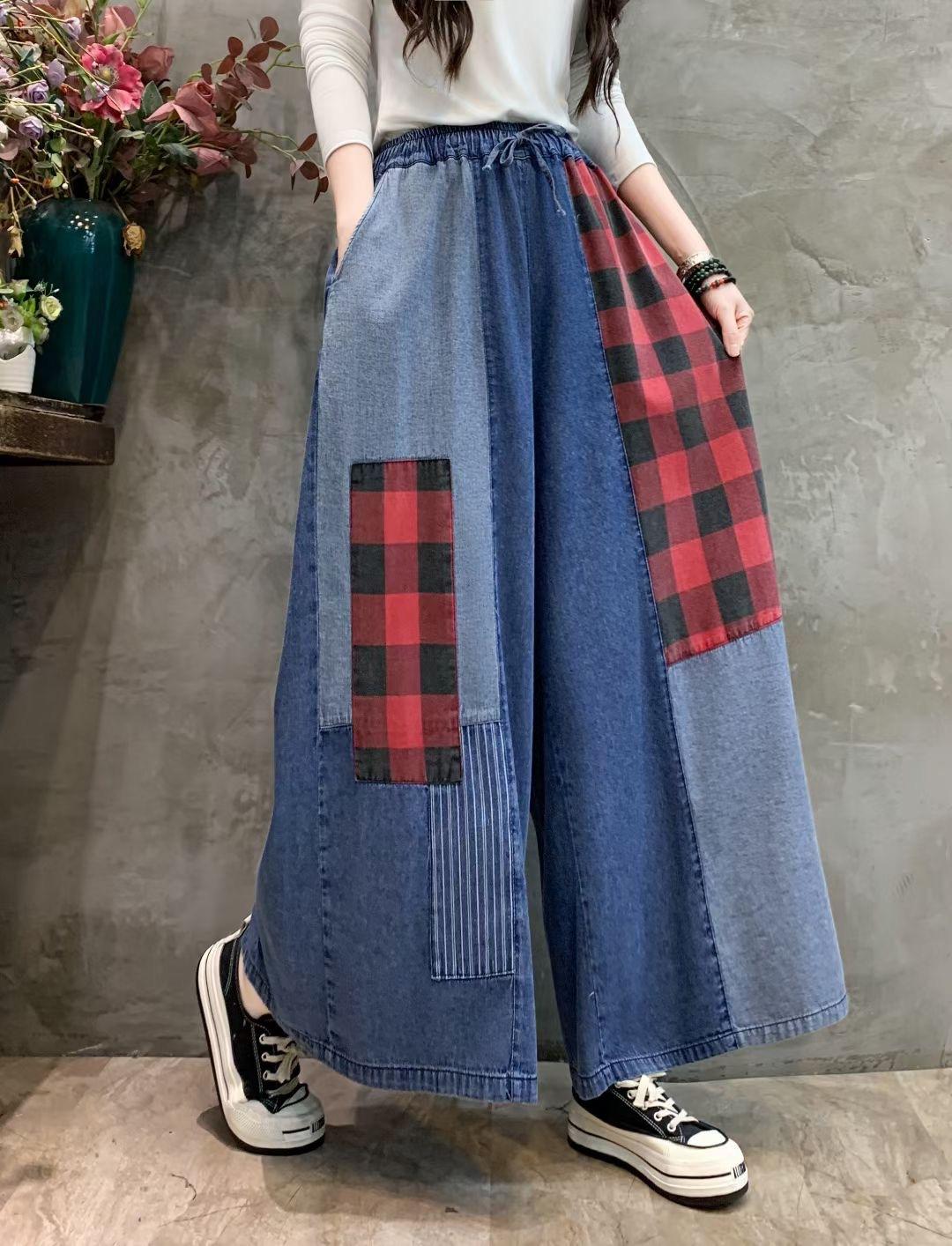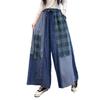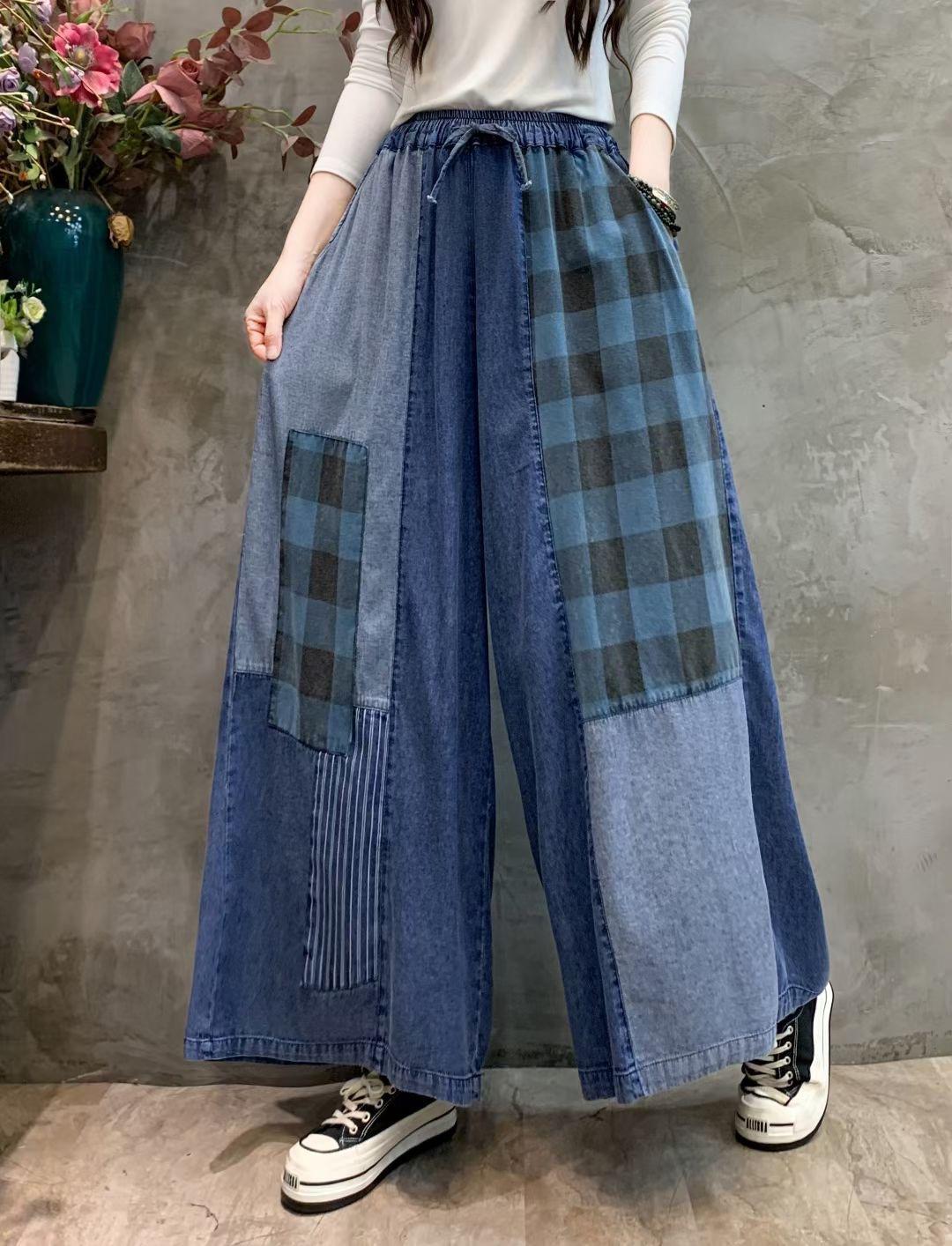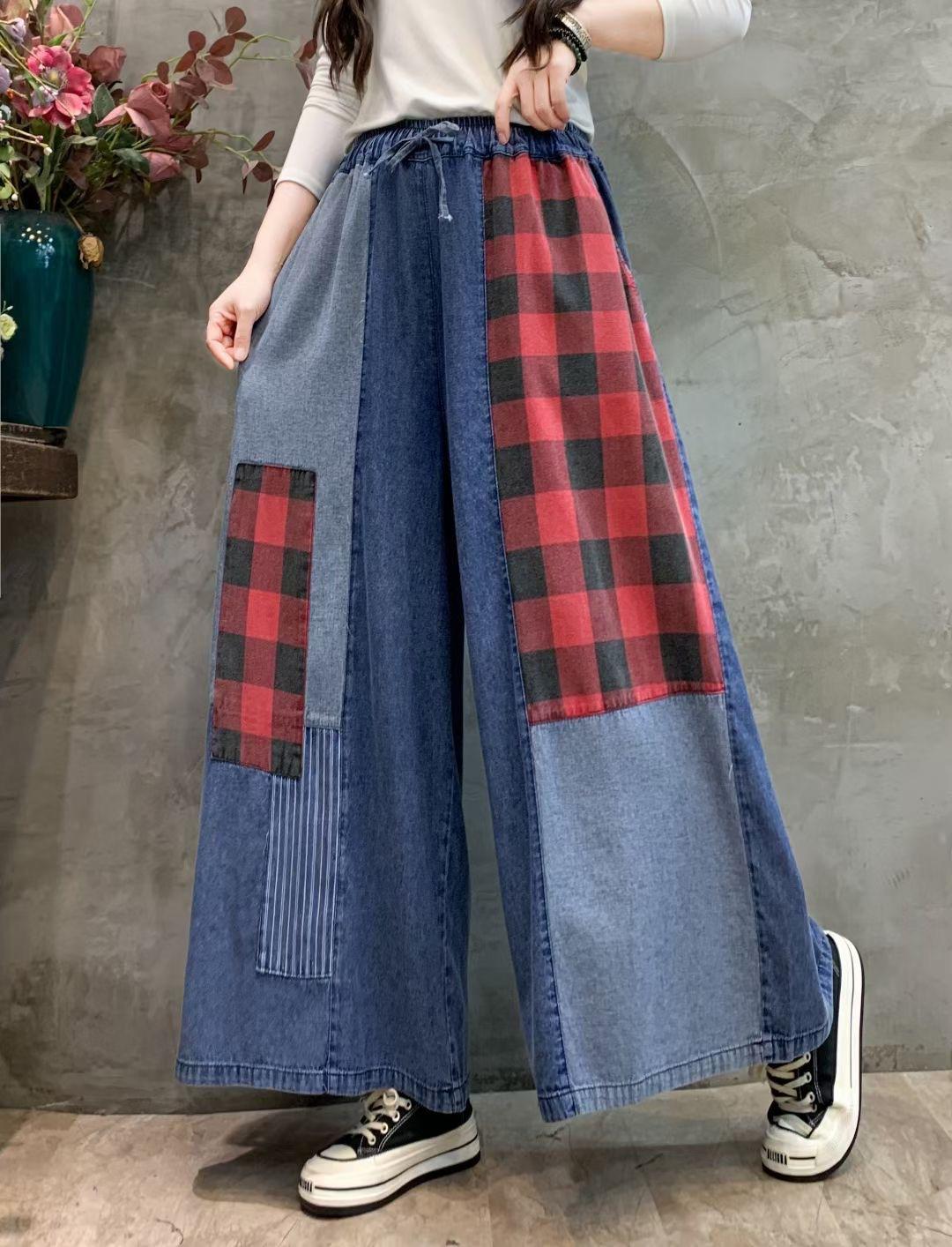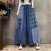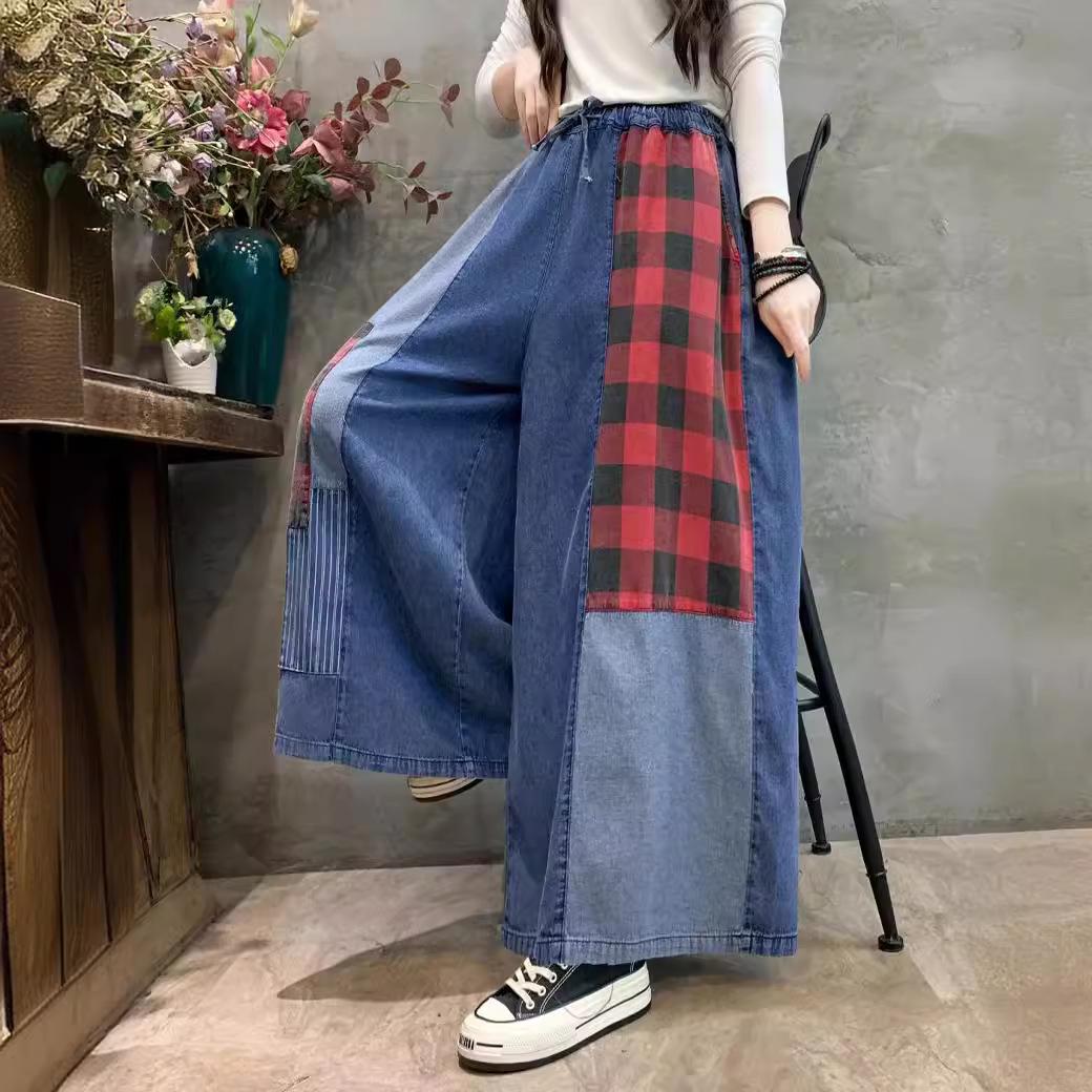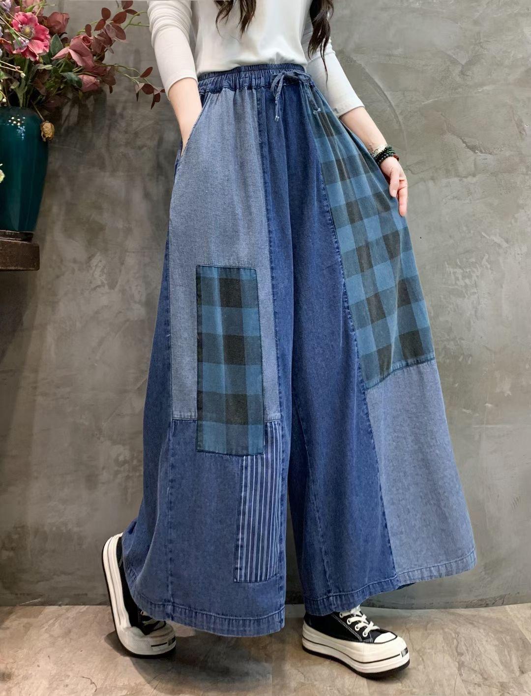 Pantalones de Mezclilla Patchwork de Pierna Ancha para Mujer Primavera 2025, Cintura Elástica, Artísticos Retro Holgados Adelgazantes Casuales Largos