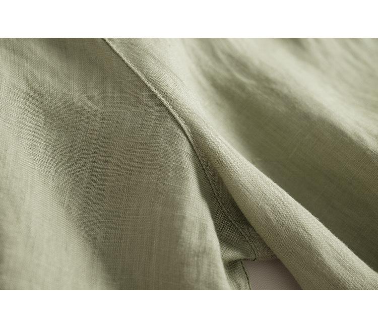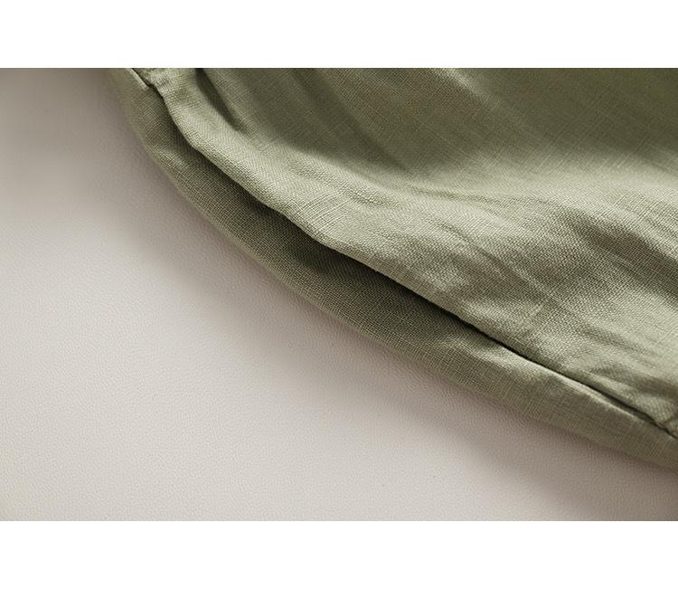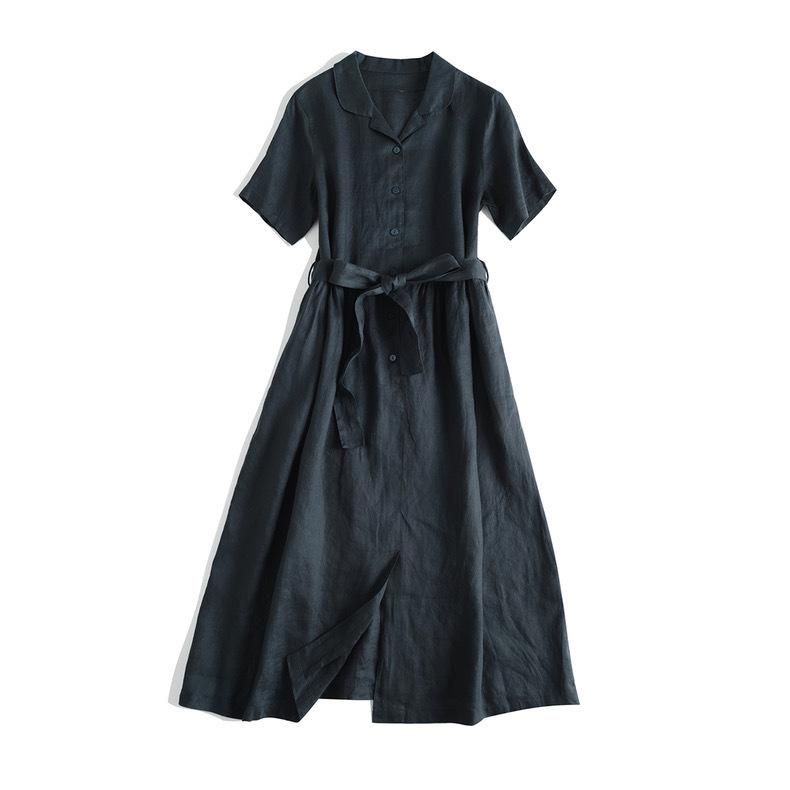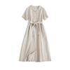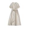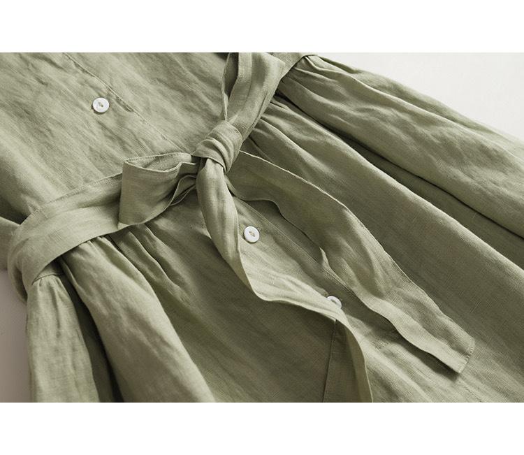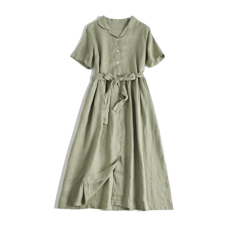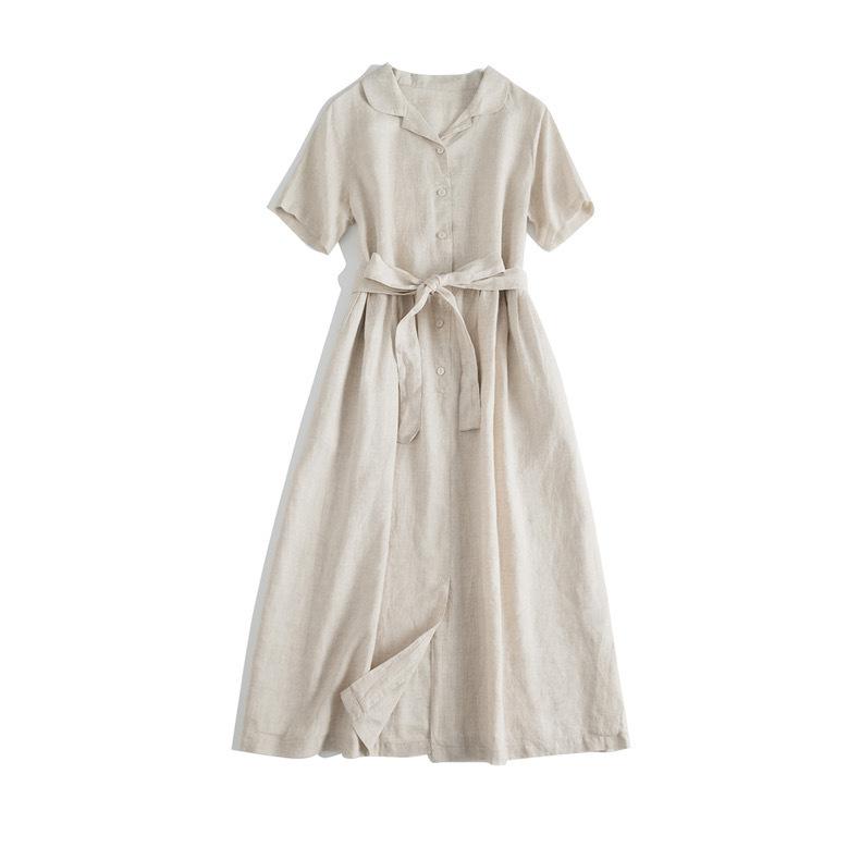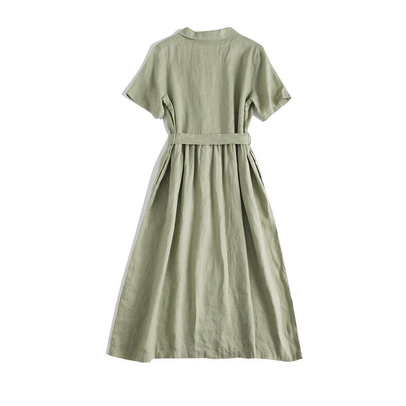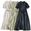 Vestido Nuevo de Verano 2023 para Mujer Artístico Retro Color Puro Algodón y Lino Falda Elegante Manga Corta Cinturón Falda Midi