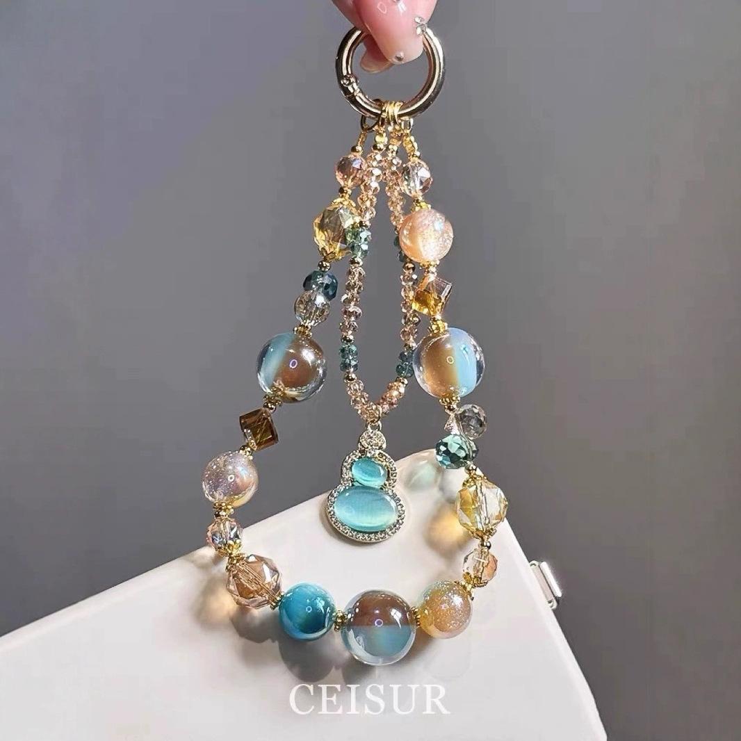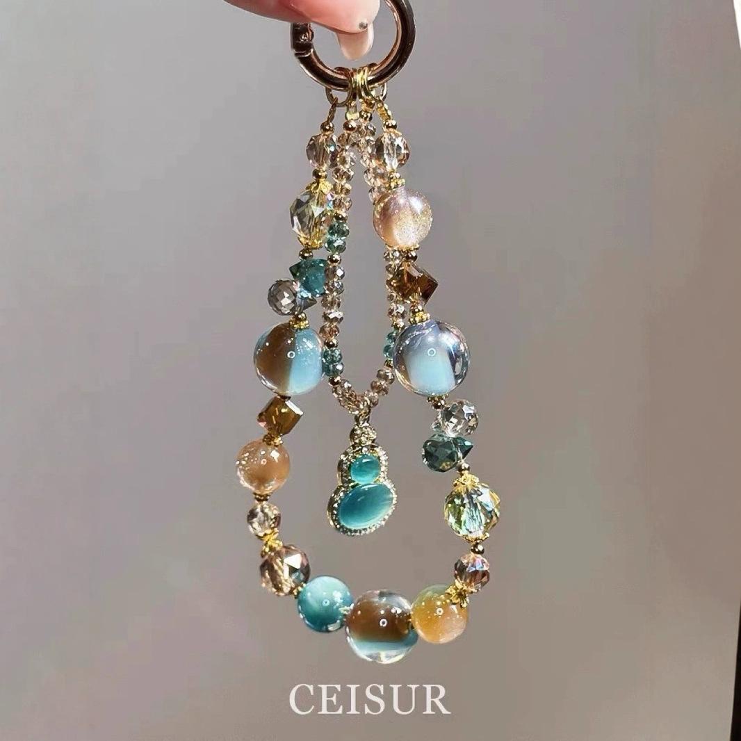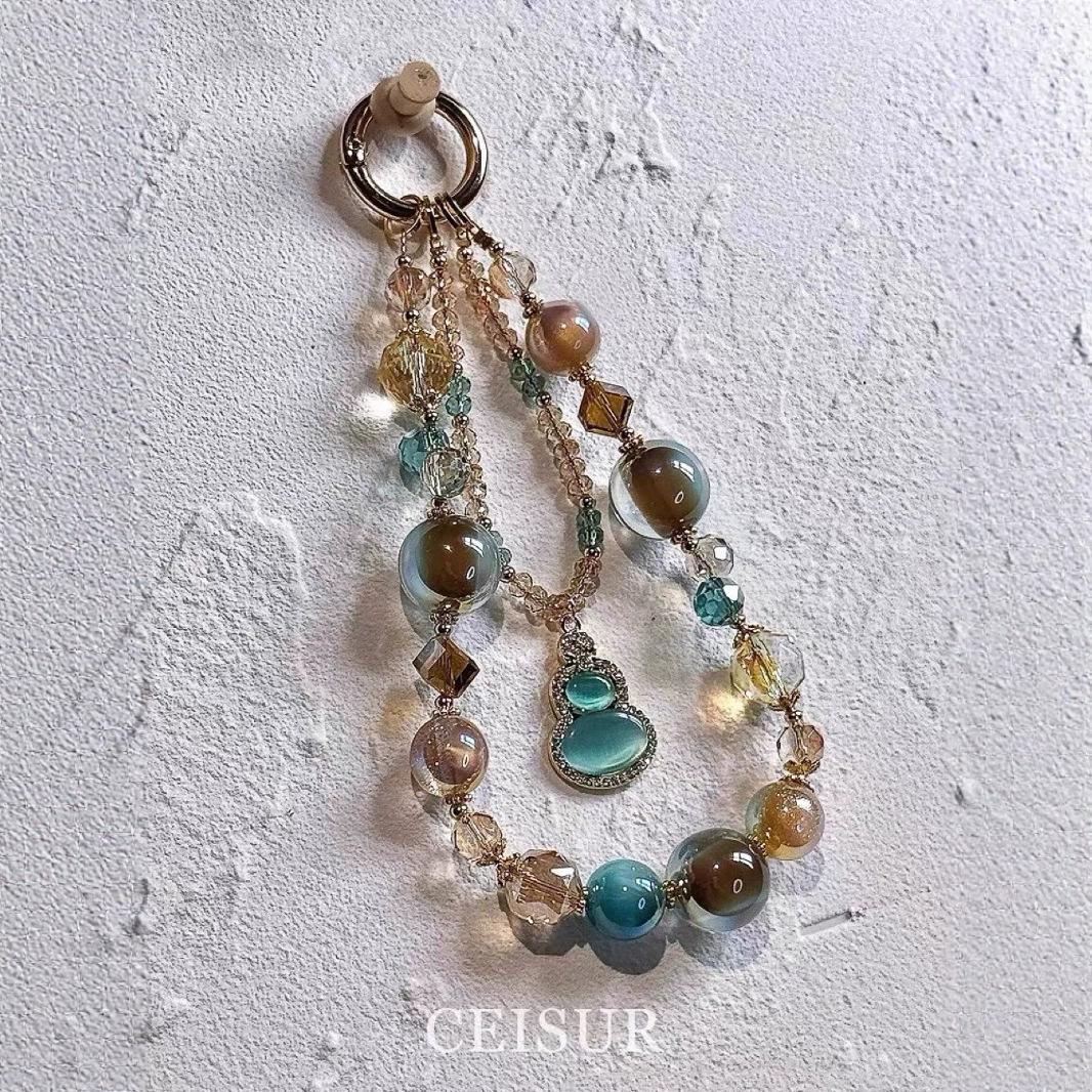 Lleno de Buena Suerte ~ Nuevo Colgante de Calabaza Antigua de Jade Imitación Chinoiserie Cadena para Teléfono Móvil Llavero de Moda con Cuentas de Cristal Maillard