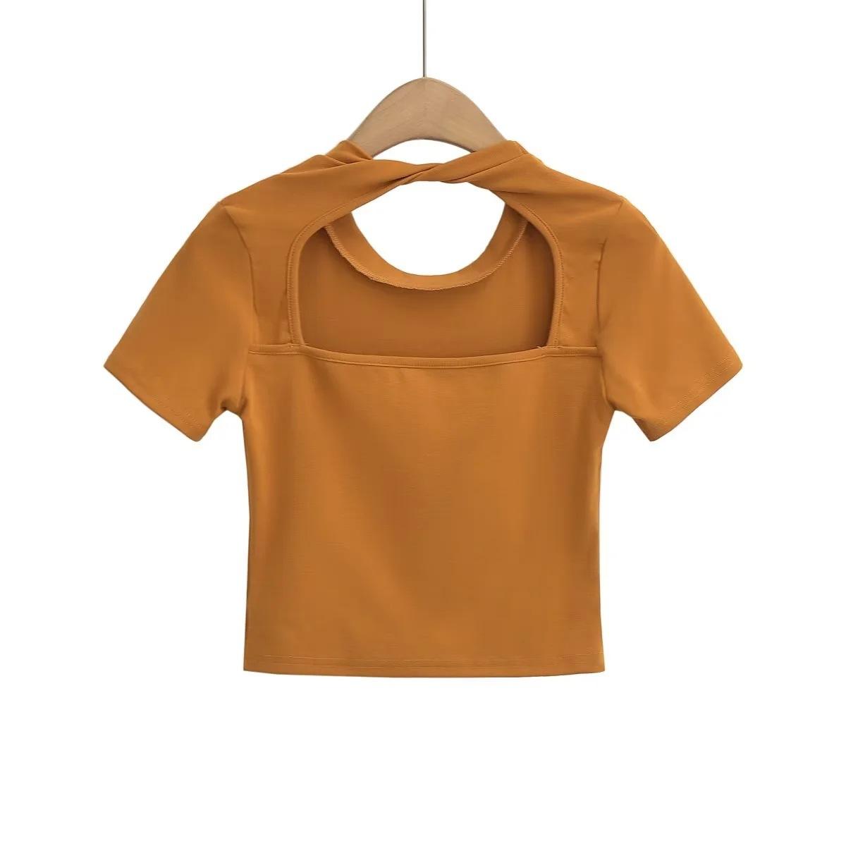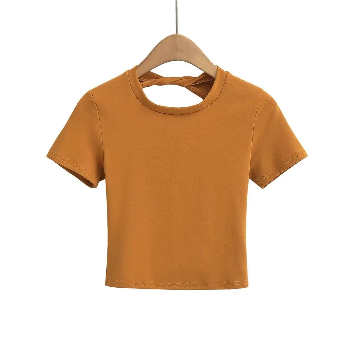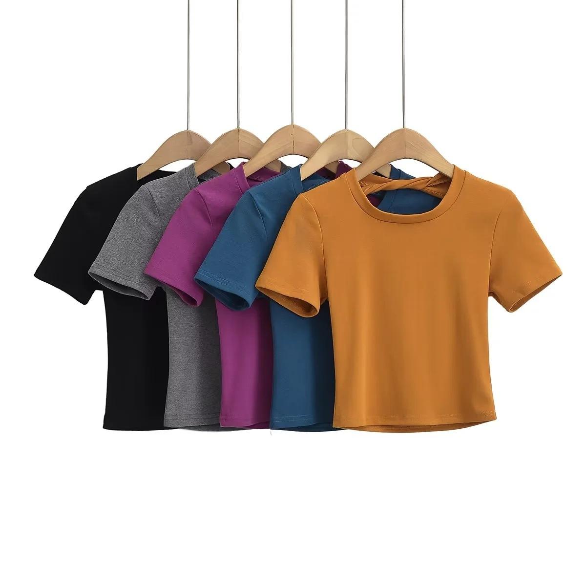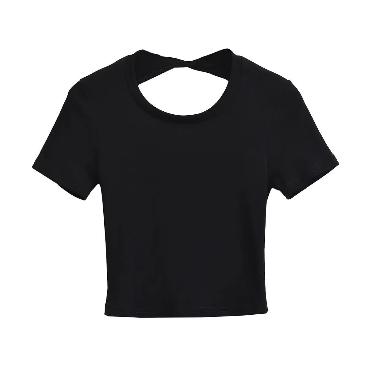 2025 Nuevo Estilo de Verano Estilo Sexy Americano Cuello Redondo Diseño de Botones Espalda Torcida Sin Espalda Cuello Redondo Manga Corta Camiseta Base