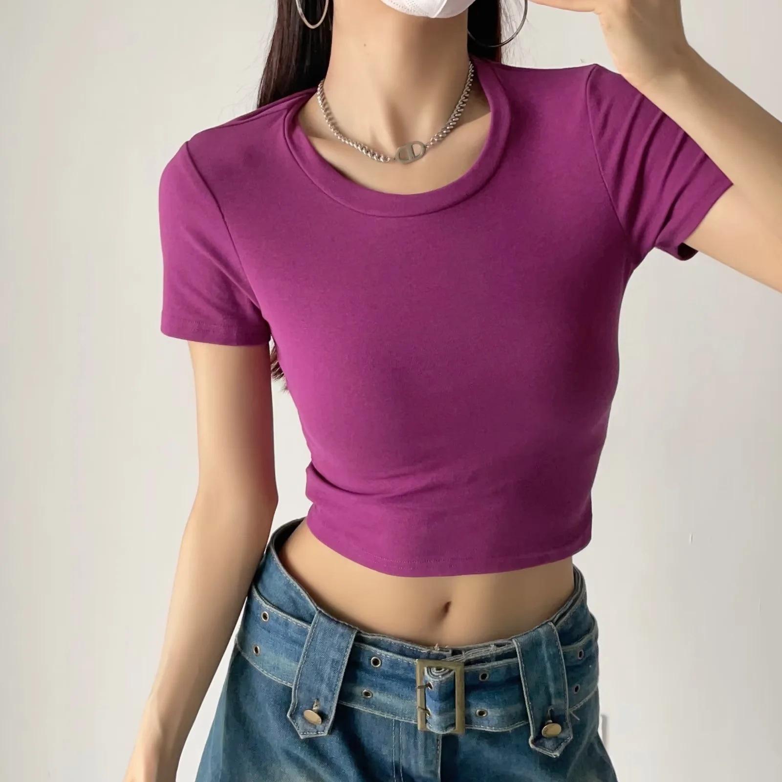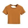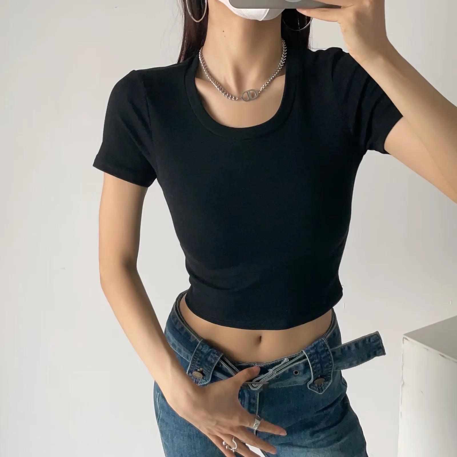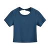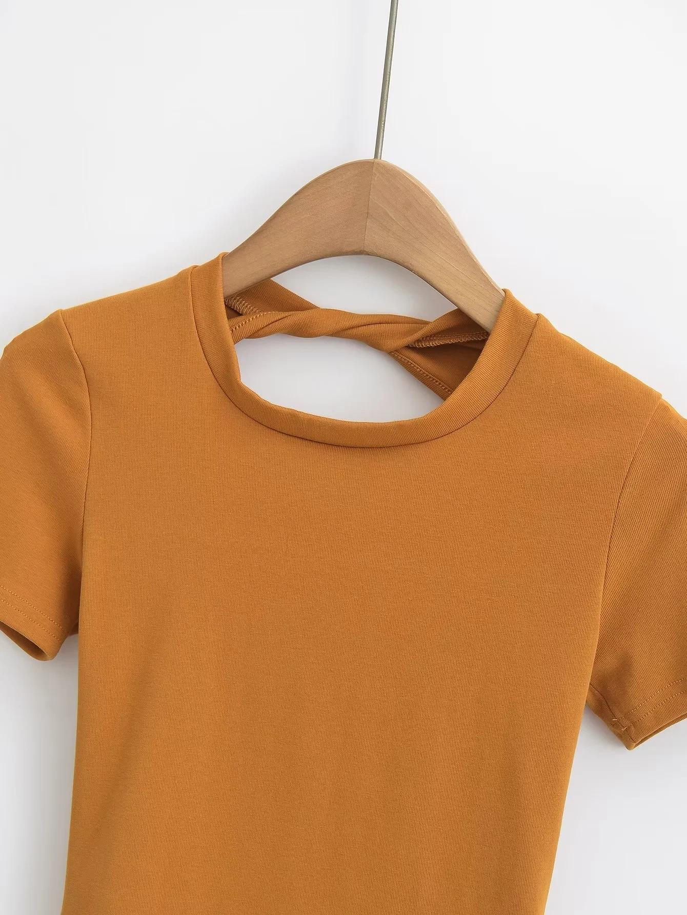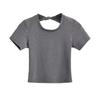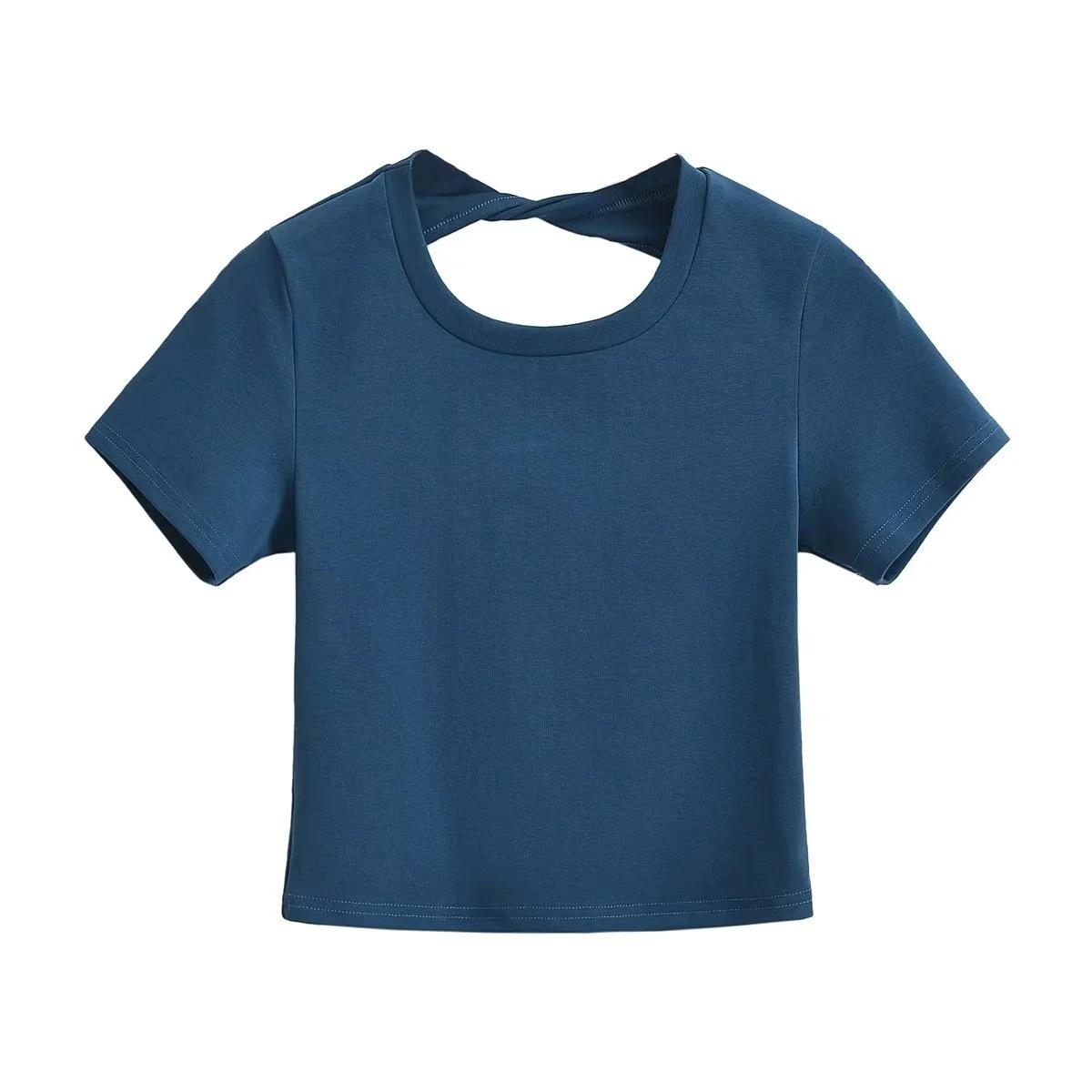 2025 Nuevo Estilo de Verano Estilo Sexy Americano Cuello Redondo Diseño de Botones Espalda Torcida Sin Espalda Cuello Redondo Manga Corta Camiseta Base