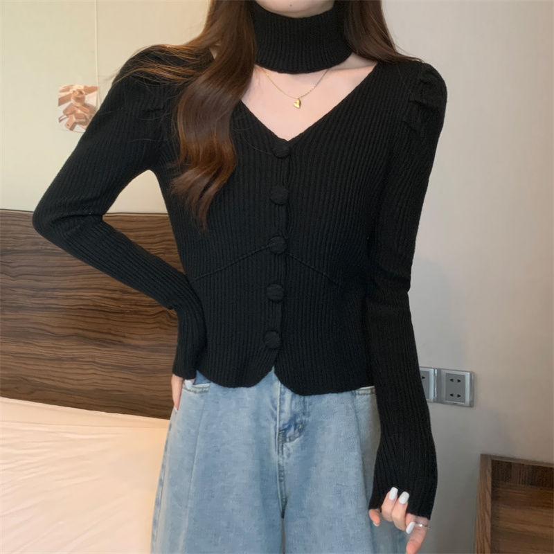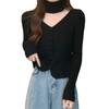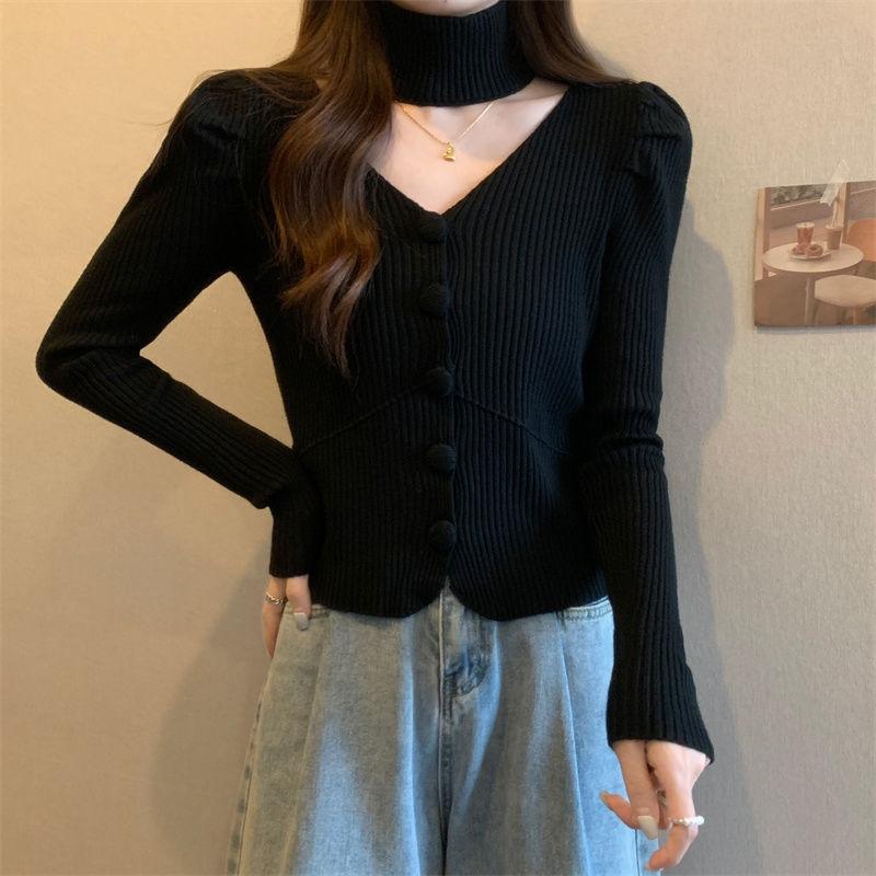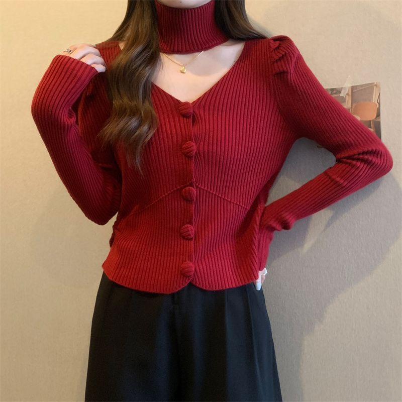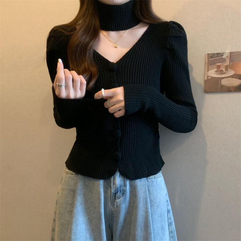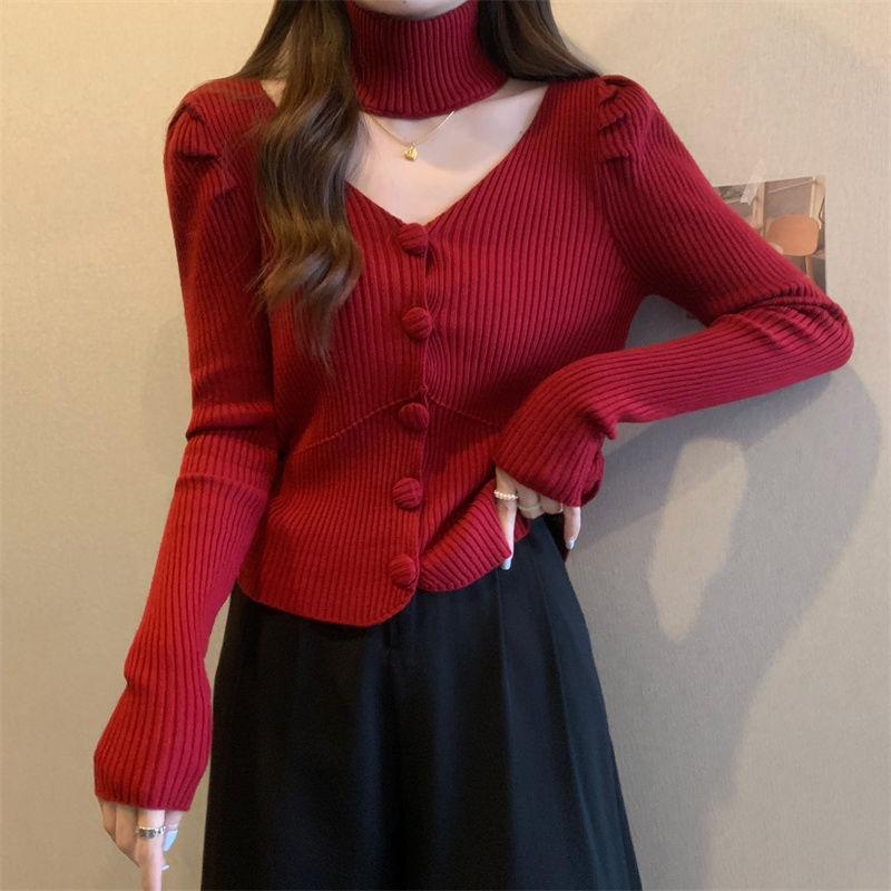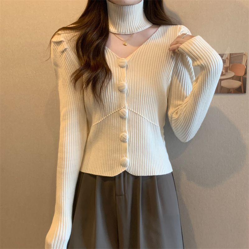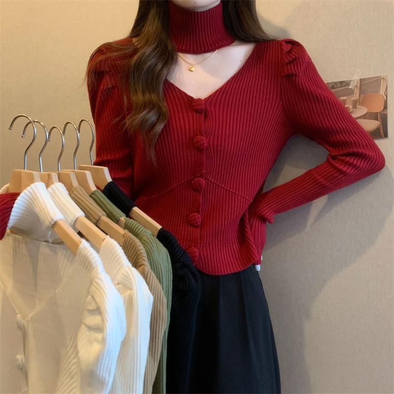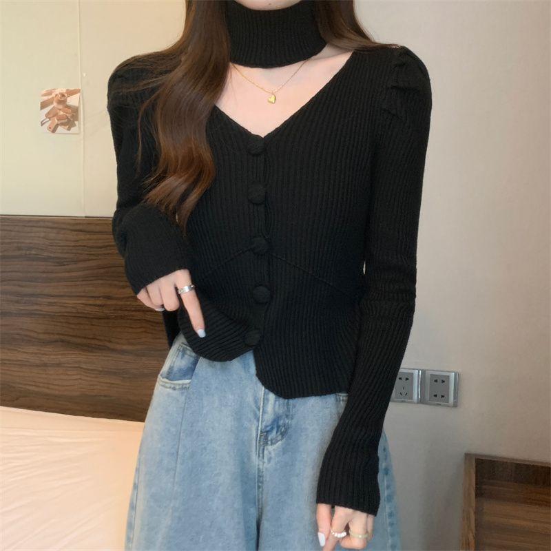 Tejido de punto francés de manga larga para mujer, Tejido de punto para llevar debajo, Estilo transfronterizo de primavera, Estilo nuevo, Top halter de cuello en V, Moderno