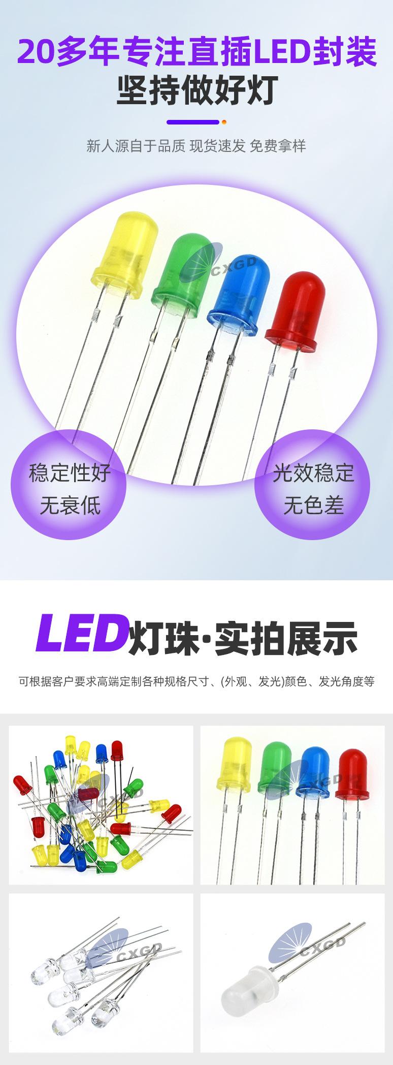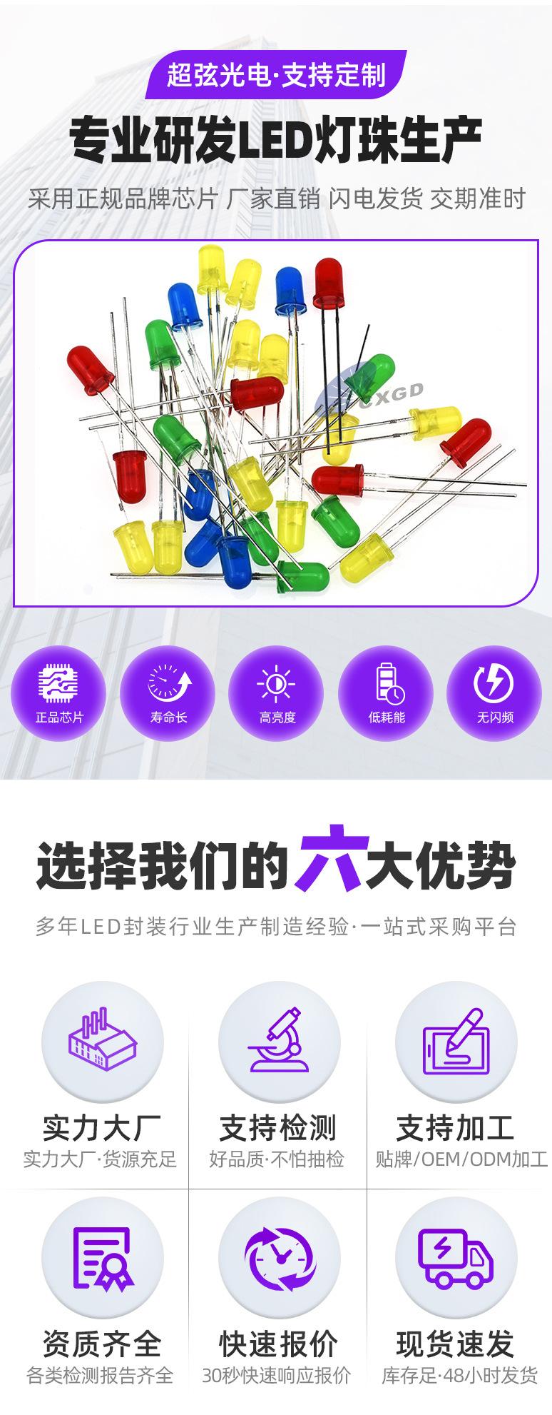 Cuentas de Luz LED de 360° de Ultra Alto Brillo Resistentes a Altas Temperaturas 0.5w Rojo Amarillo Azul Verde Blanco Blanco Cálido Fabricante ¥80.00 Compre ya | diodo emisor de luz blanco-púrpura de 3 mm 5 mm parte superior plana blanco-púrpura doble color alto brillo f3 cabeza redonda doble color ánodo común perlas de lámpara led ¥150.00 Compre ya | Cuentas de lámpara LED de 5 mm sin borde cóncavo rojo azul alto brillo translúcido lámpara enchufable f5 diodo emisor de luz ¥55.00 Compre ya | ||