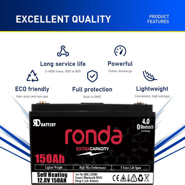 Batería LiFePO4 de 12.8V 150Ah Batería de litio hierro fosfato segura y respetuosa con el medio ambiente. Tamaño compacto, ligero, alta densidad de energía. Salida de potencia estable, eficiencia de carga/descarga hasta 95% Amplio rango de temperatura de funcionamiento Larga vida útil Buen rendimiento de almacenamiento, baja tasa de autodescarga Con sobrecarga, sobredescarga, cortocircuito por sobrecorriente Funciones de protección de temperatura Con sistema de reciclaje de baterías al final de su vida útil