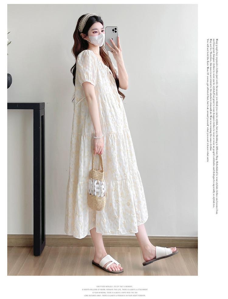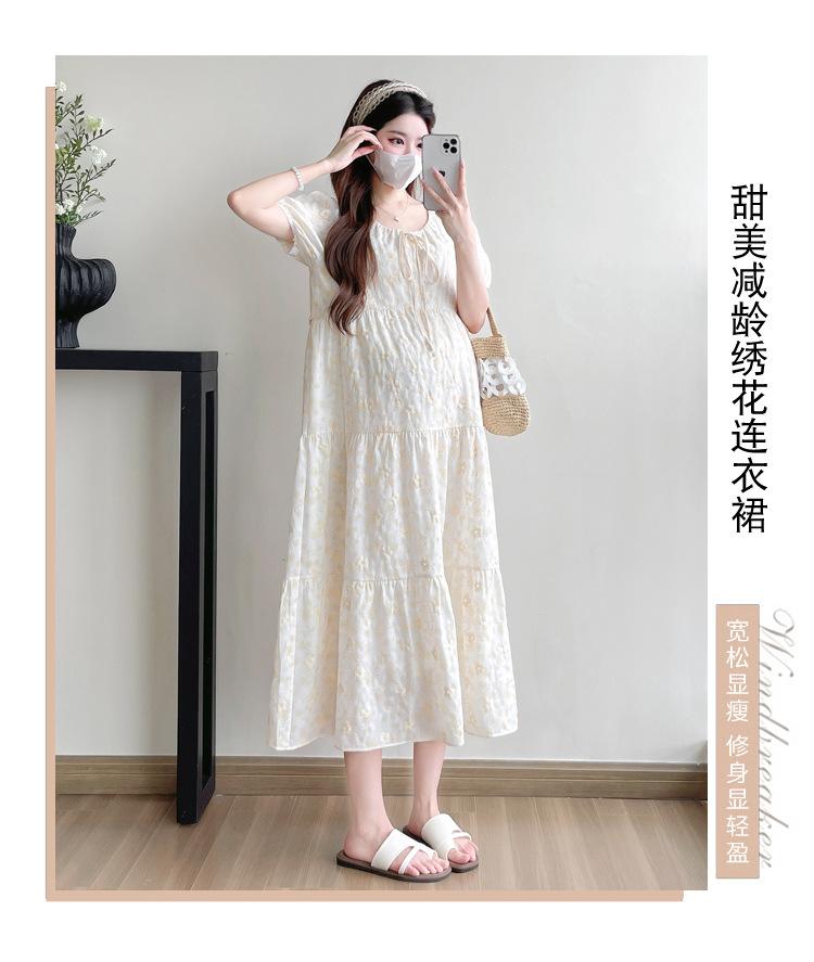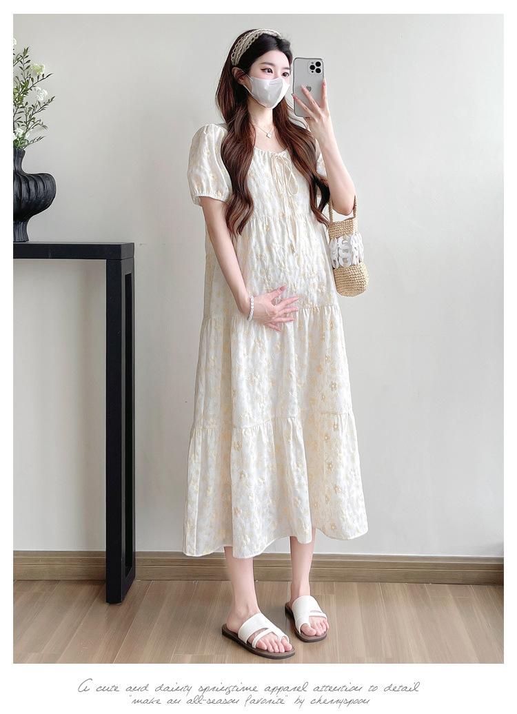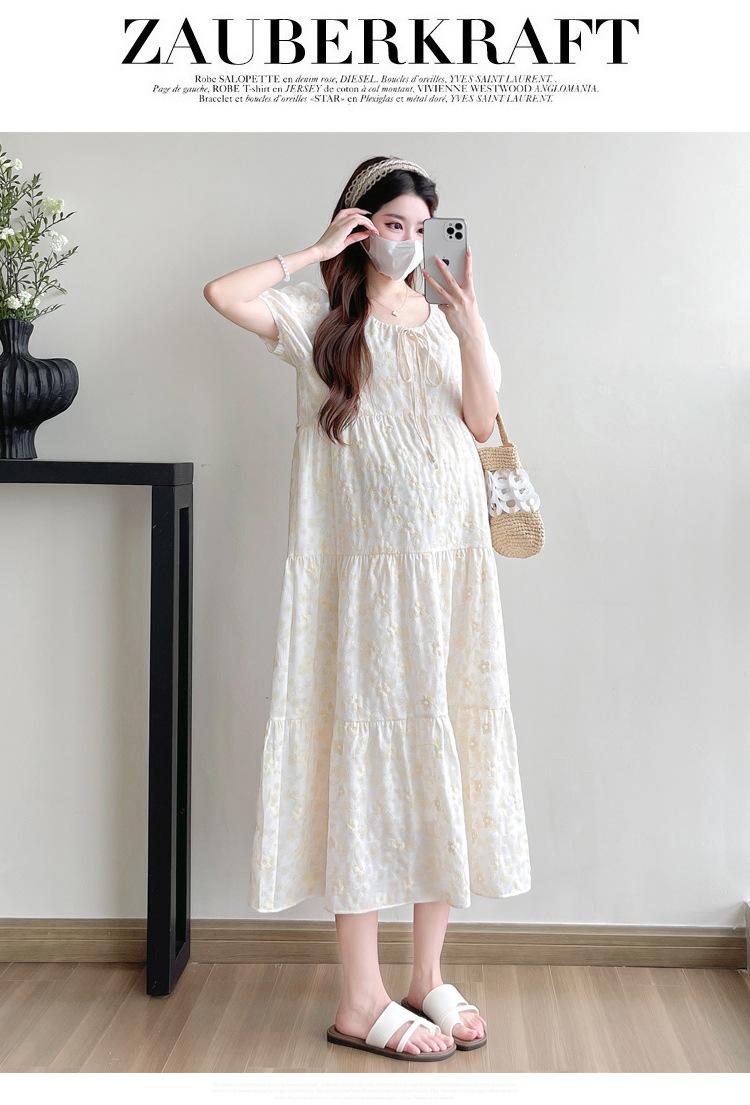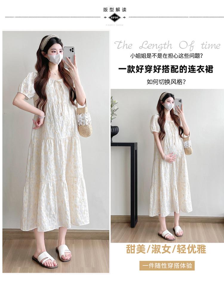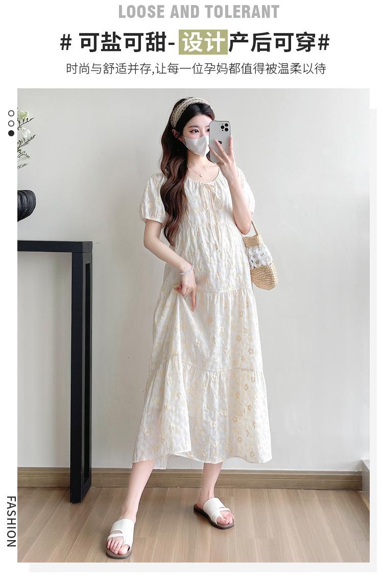 Ropa de Maternidad 2025 Verano Nuevo Estilo Coreano Dulce Encaje Bordado Largo Medio Suelto Talla Grande Vestido de Maternidad