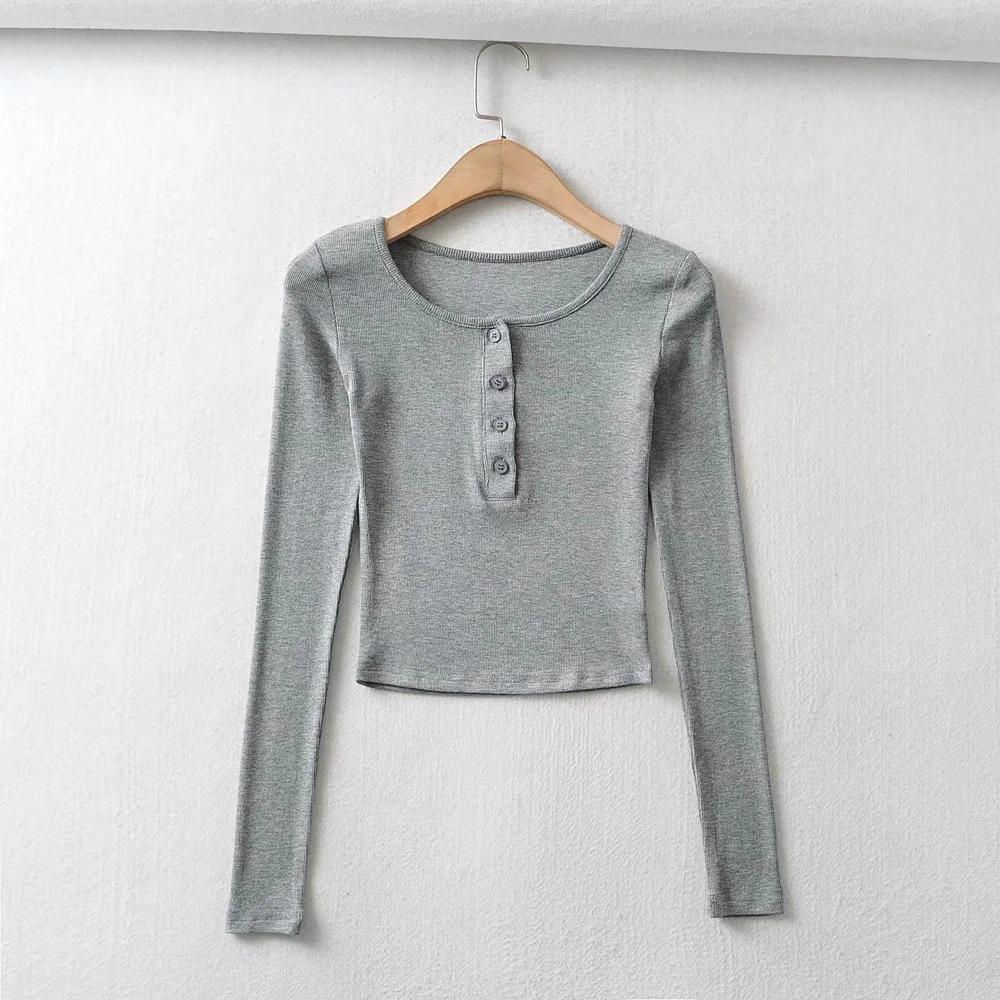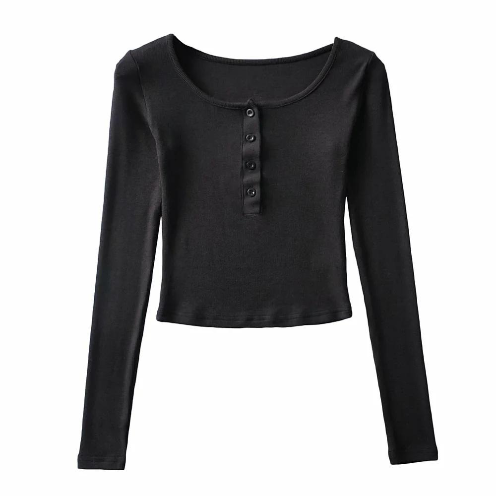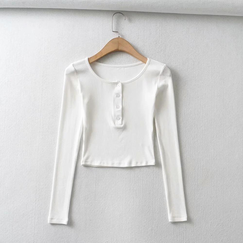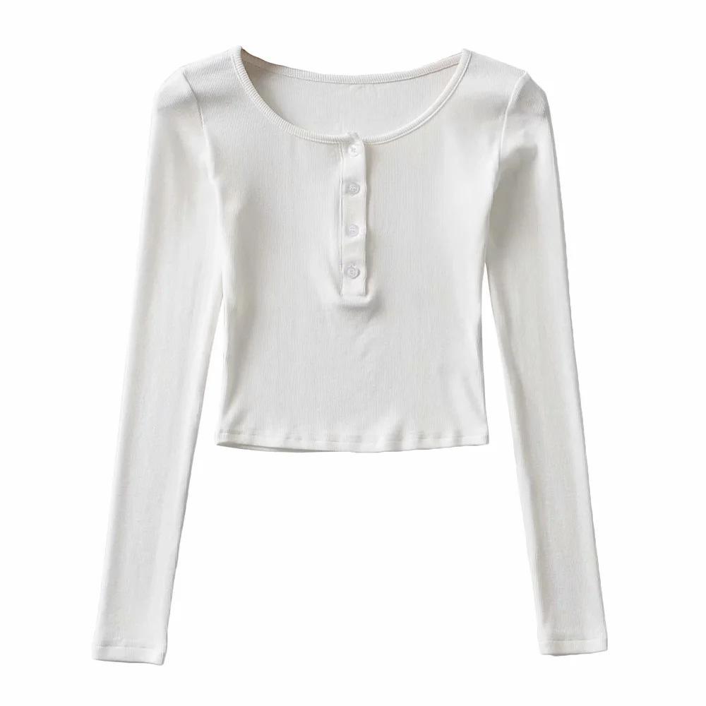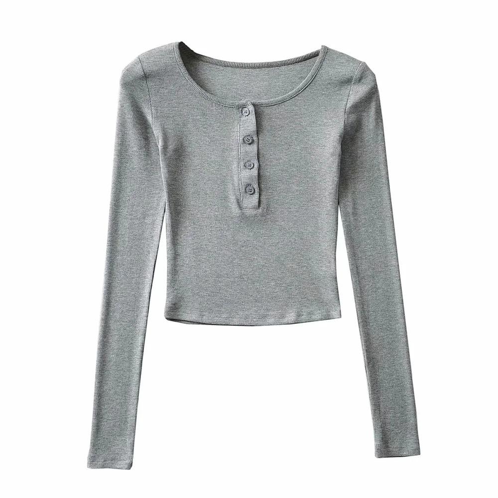 Playera de Manga Larga con Cuello Redondo y Botones en el Pecho para Mujer, Estilo Europeo y Americano a la Moda, Ajustada, Corta, con Botones, Sexy, Básica