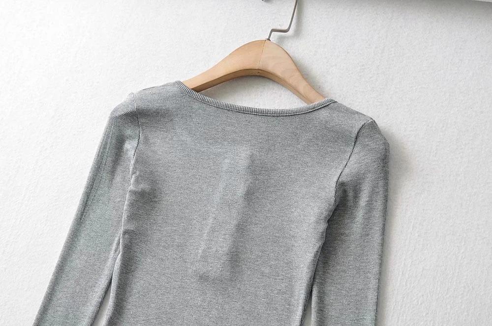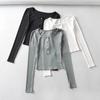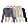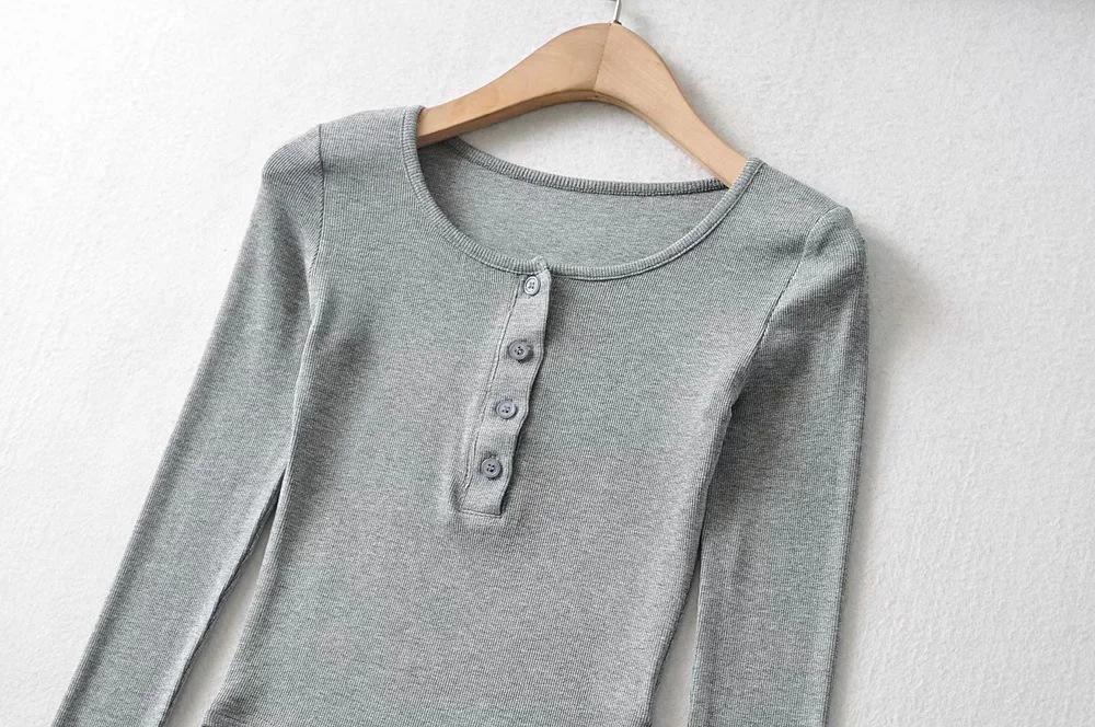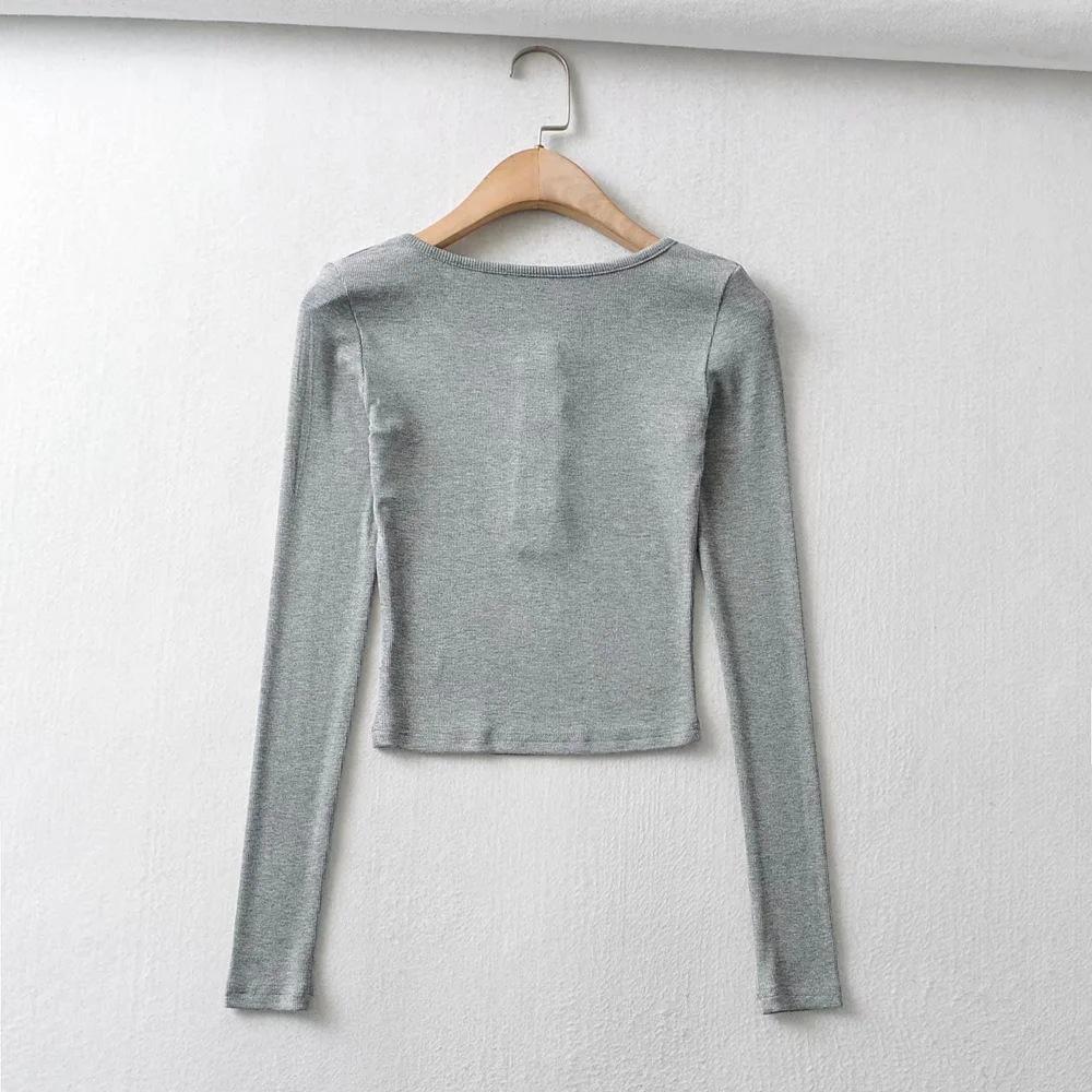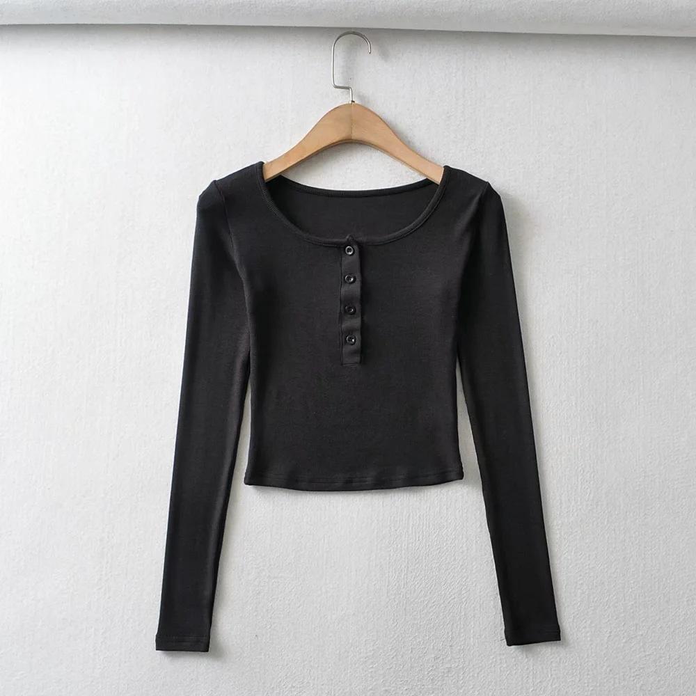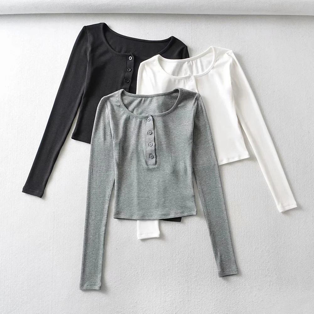 Playera de Manga Larga con Cuello Redondo y Botones en el Pecho para Mujer, Estilo Europeo y Americano a la Moda, Ajustada, Corta, con Botones, Sexy, Básica