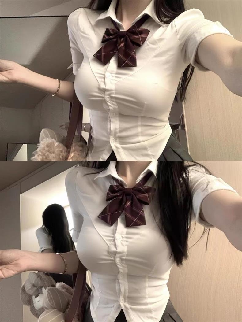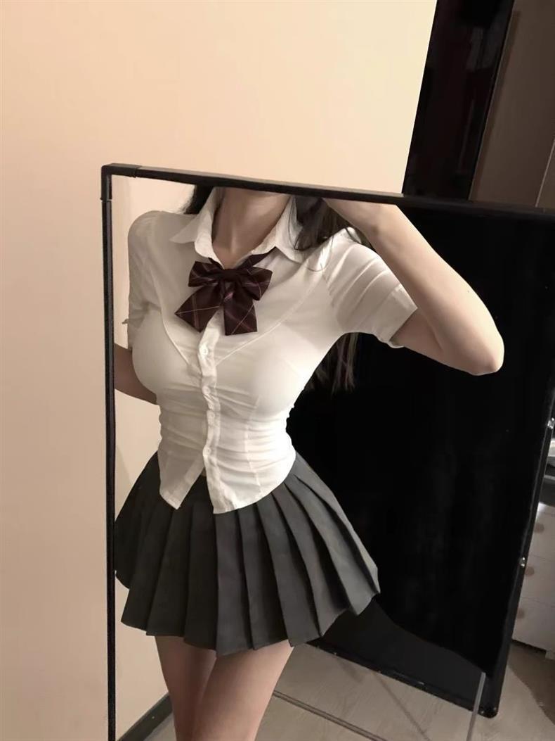 3-piece set/small v shirt + gray skirt + shahua bow tie, Small v waist shirt + shahua bow tie silm short sleev...