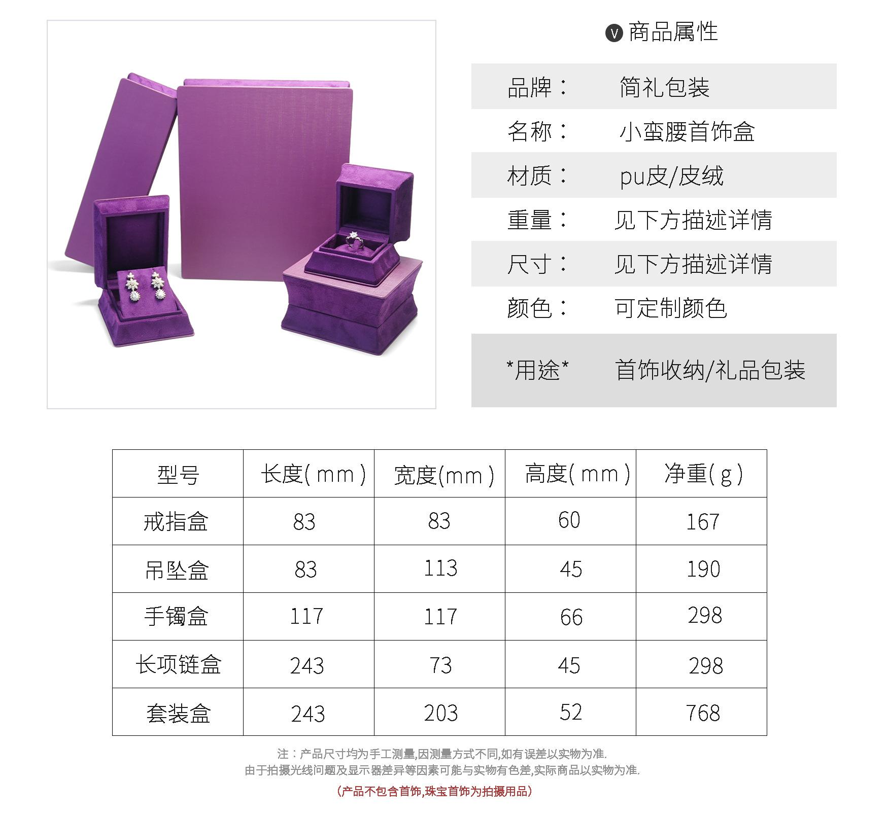 Purple; ring box 83*83*60mm, Purple; pendant box 83*113*45mm, Purple; bracelet box 117*117*66mm, Purple; long ...