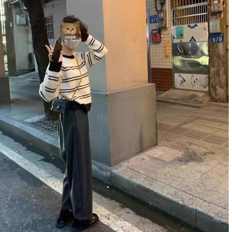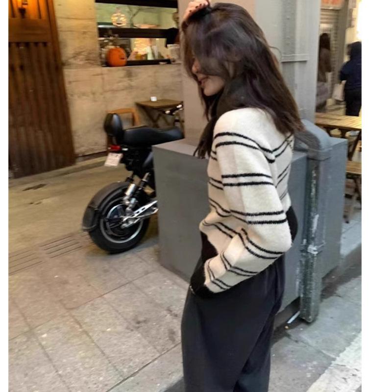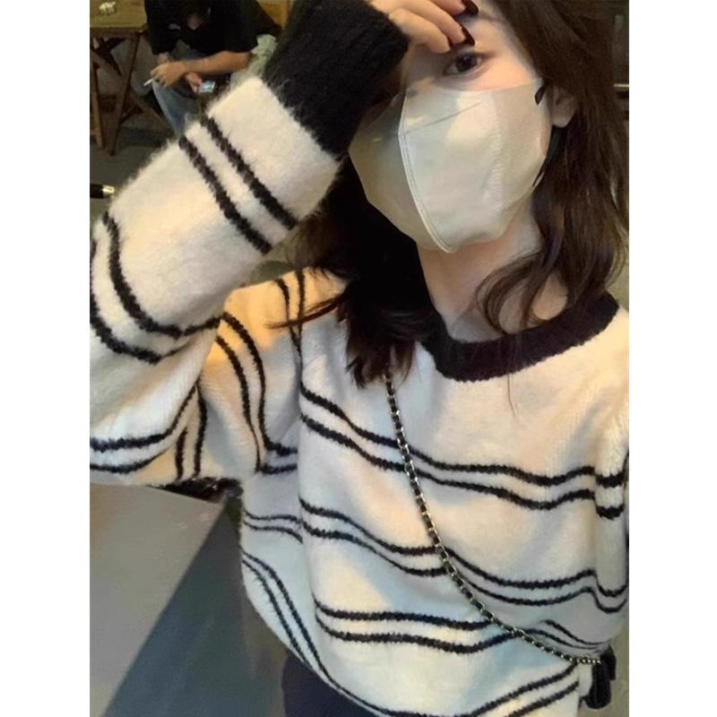 Suéter Suelto Suave y Ceroso de Punto para Mujer Otoño e Invierno 2025 Nuevo Estilo para Usar por Dentro y por Fuera Tejido de Punto de Color en Contraste a Rayas