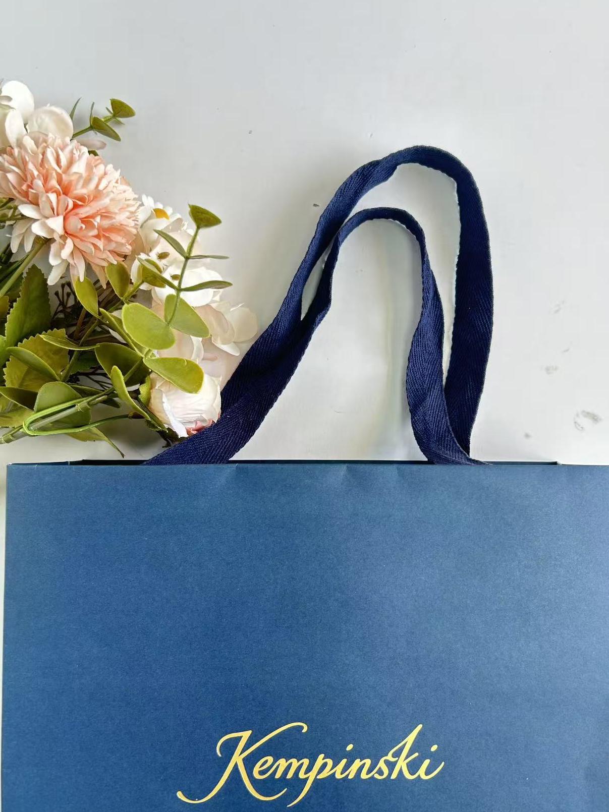 Número de artículo: FH-25034, esta bolsa de papel azul oscuro está hecha de cartón blanco, con su diseño elegante y estructura robusta, combinando perfectamente practicidad y estética. No solo es una opción ideal para compras, sino también adecuada para el embalaje de regalos, transmitiendo una discreta sensación de lujo.