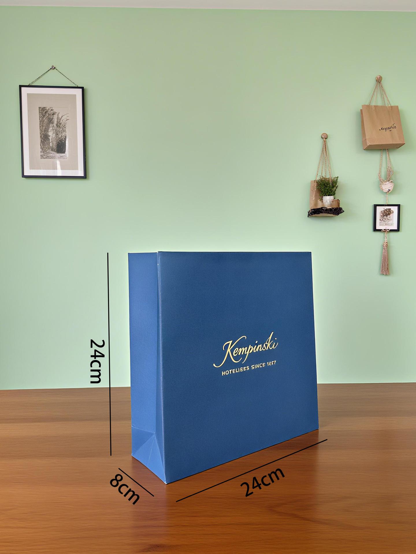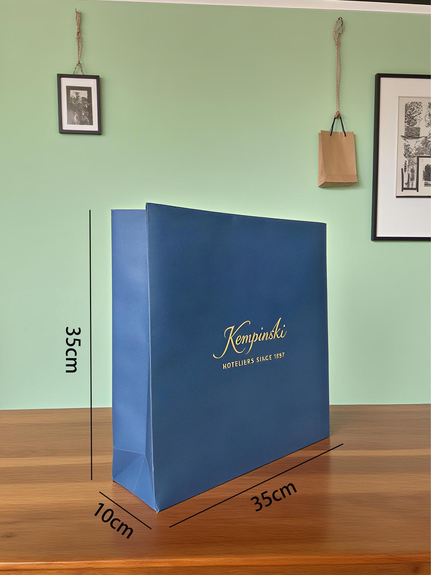 Número de artículo: FH-25035, esta bolsa de papel azul oscuro está hecha de cartón blanco, con su diseño elegante y estructura robusta, combina perfectamente practicidad y estética. No solo es una opción ideal para ir de compras, sino también adecuada para envolver regalos, transmitiendo una discreta sensación de lujo.