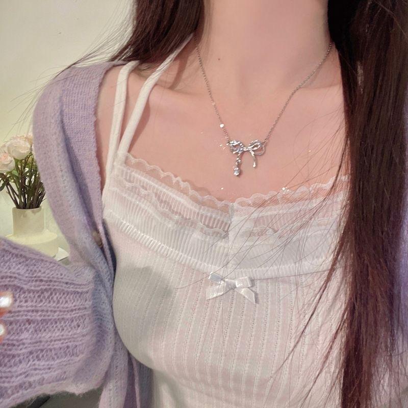 Cadena de Clavícula para Mujer Verano Lujo Ligero Alta Gama Moño Diamante Completo Elegante Accesorios Combinables Collar de Moda Simple