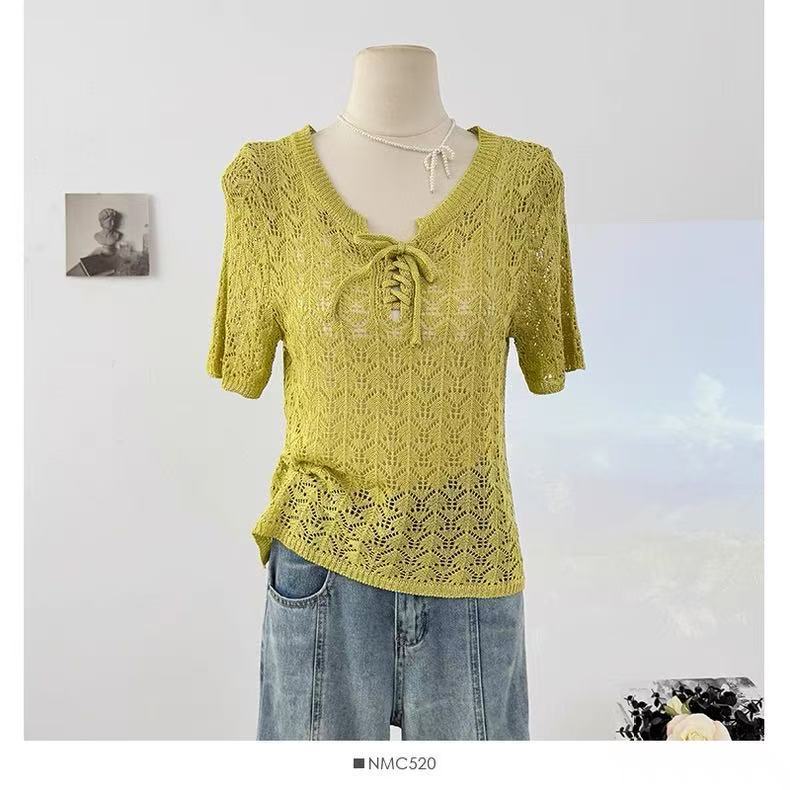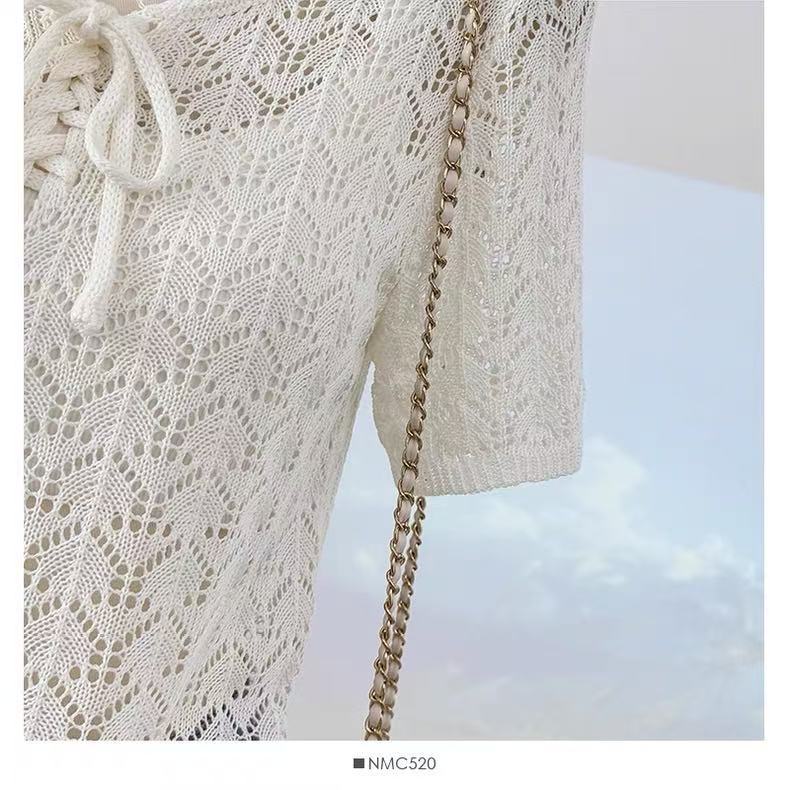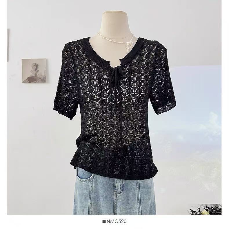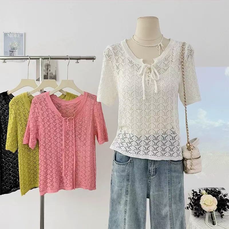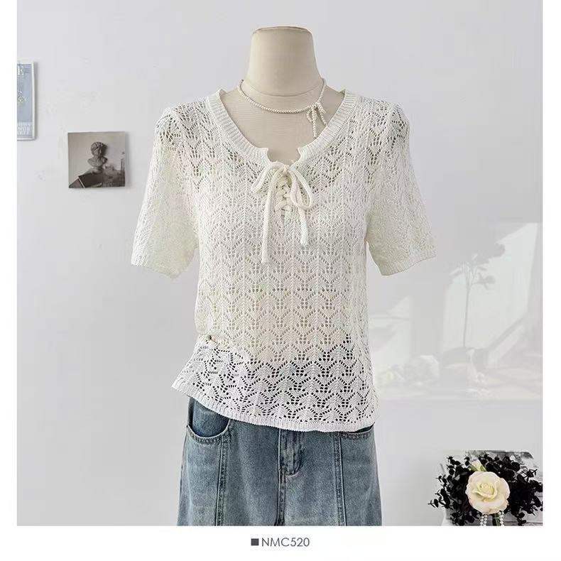 Suéter de Manga Corta con Cordones de Encaje Calado Estilo Holgazán para Mujer Verano Chica Caliente Nuevo Diseño Holgado y Versátil Top Protector Solar