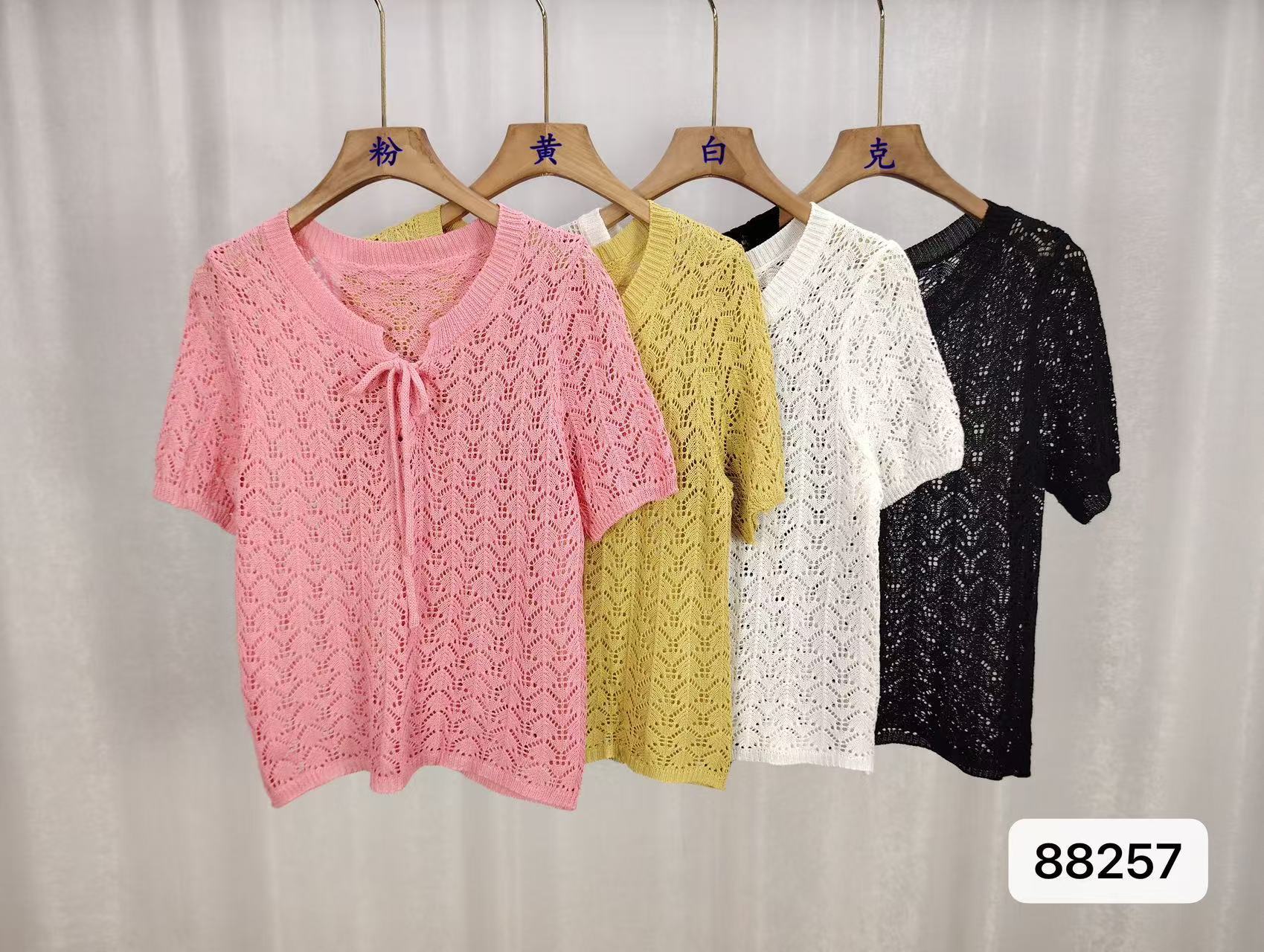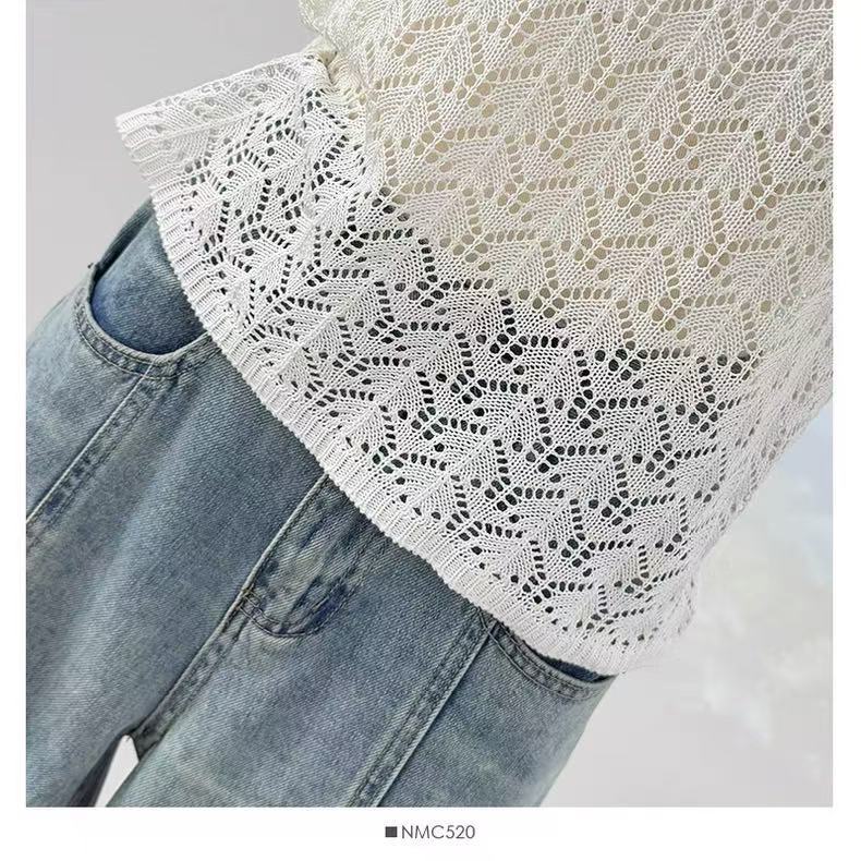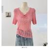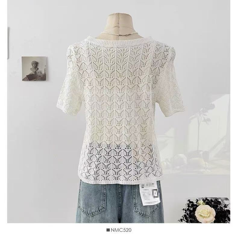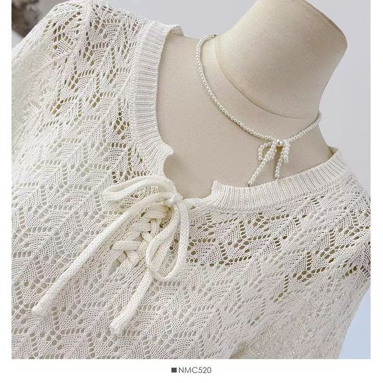Suéter de Manga Corta con Cordones de Encaje Calado Estilo Holgazán para Mujer Verano Chica Caliente Nuevo Diseño Holgado y Versátil Top Protector Solar