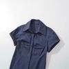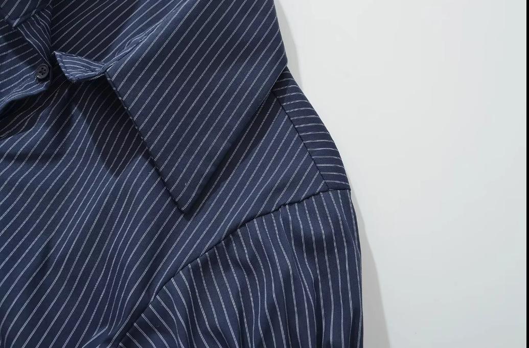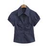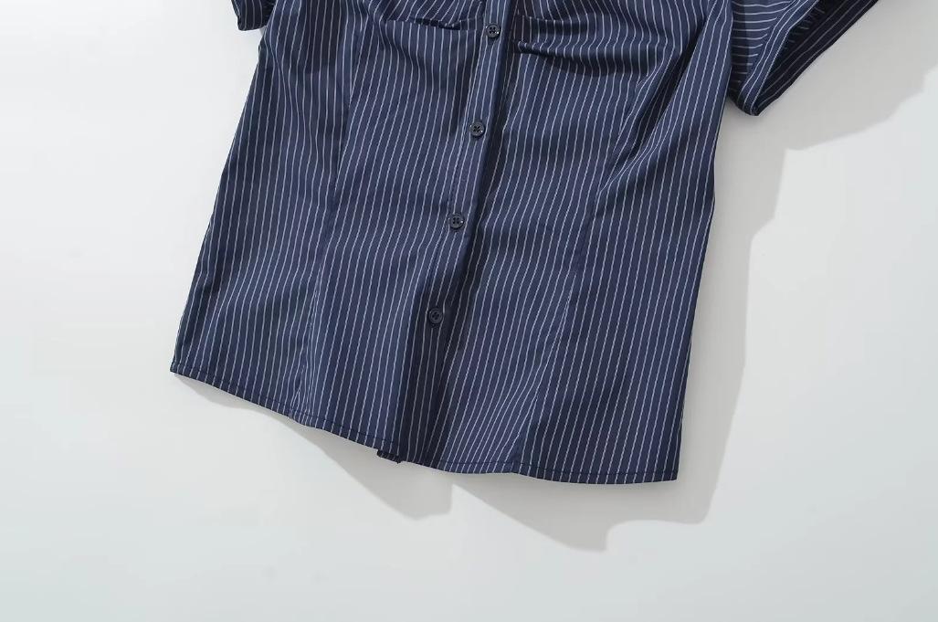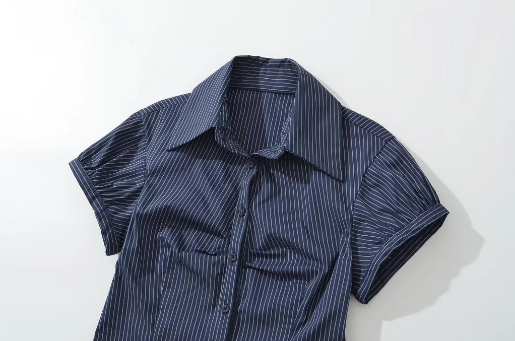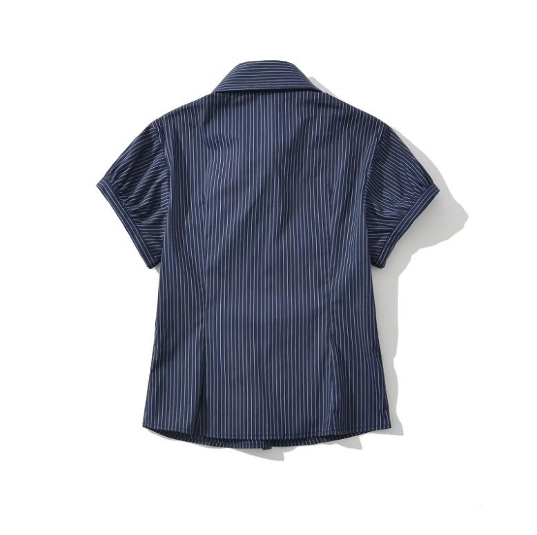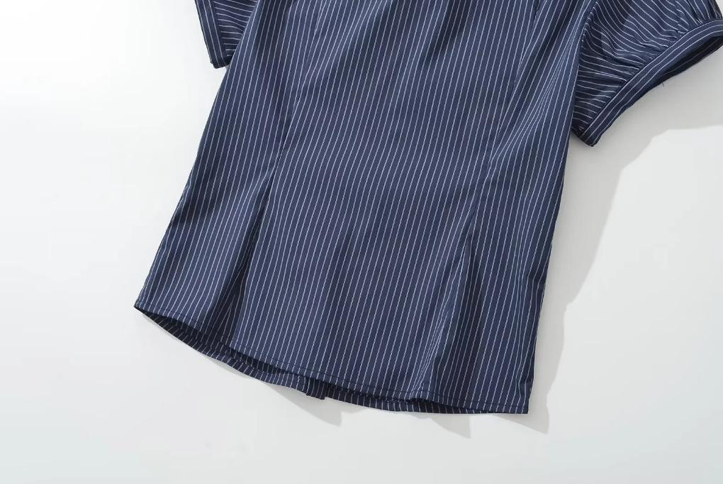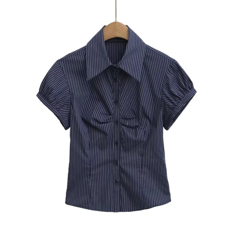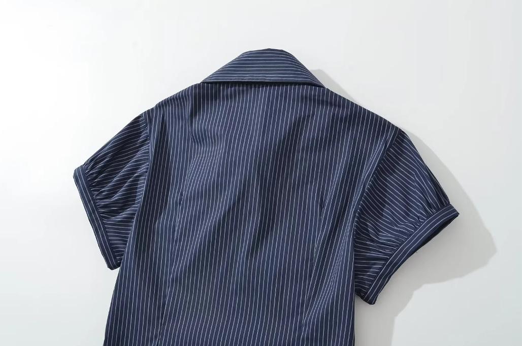 25 Nueva Camisa de Verano para Mujer Americana Retro Rayas Cintura Manga Corta Sexy Moda Solapa Plisada Cárdigan Top