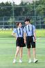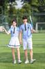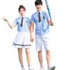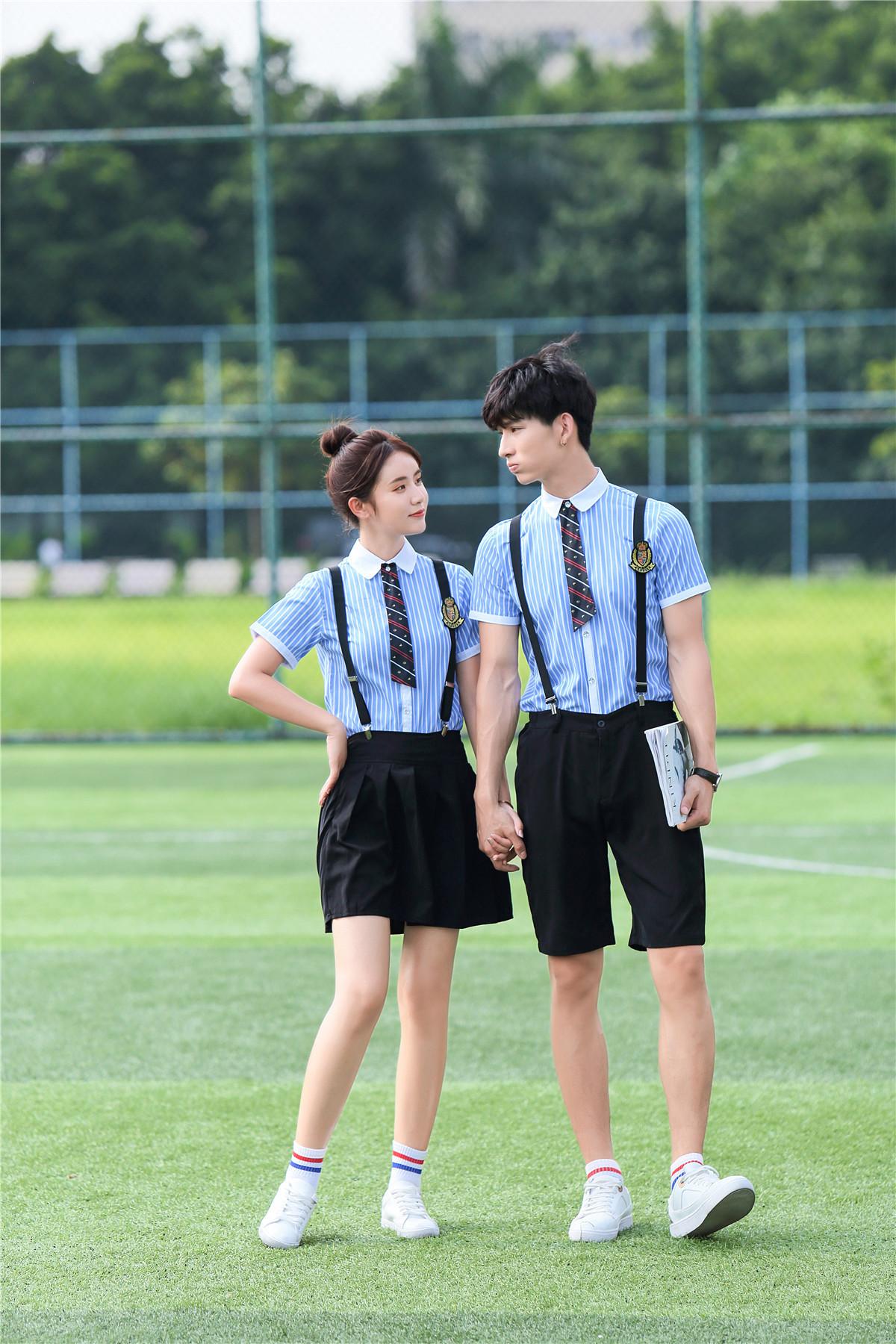 Men's blue short sleeve + suspender + black shorts suit, Women's Blue short sleeve + white pantskirt suit, Wom...