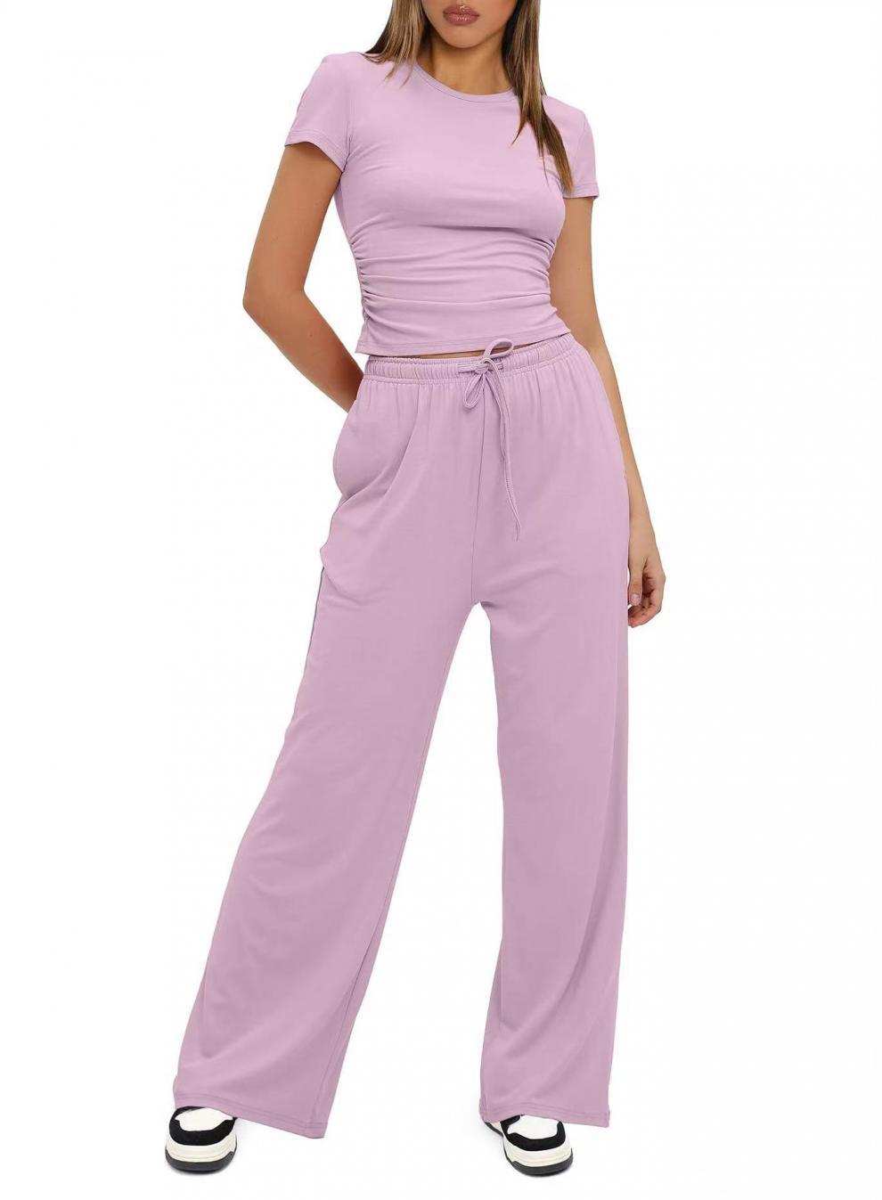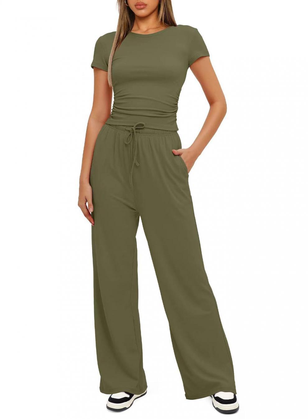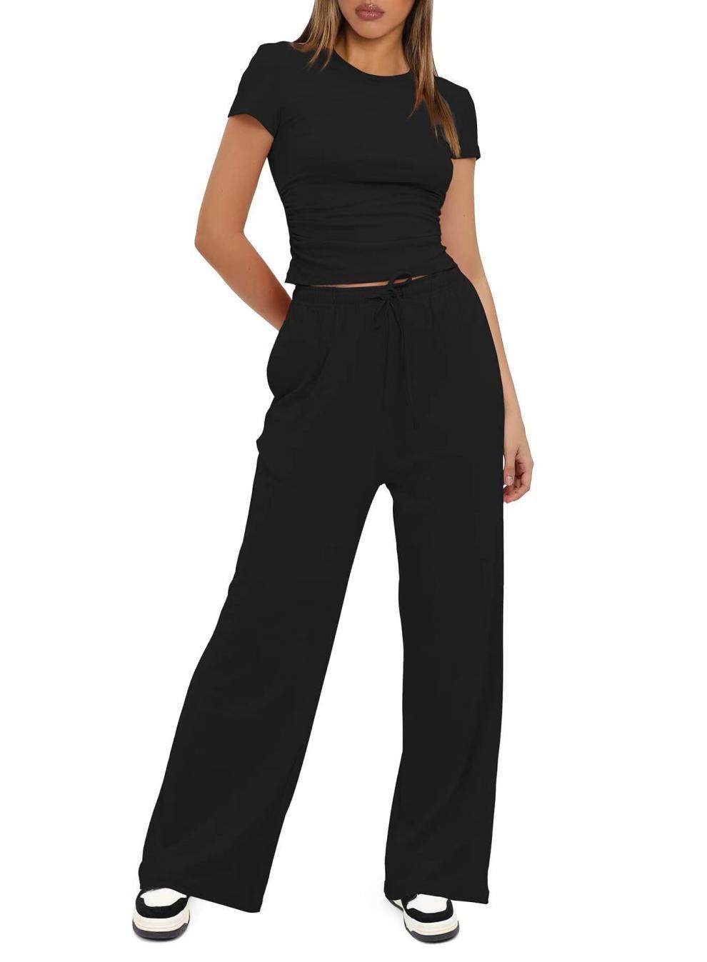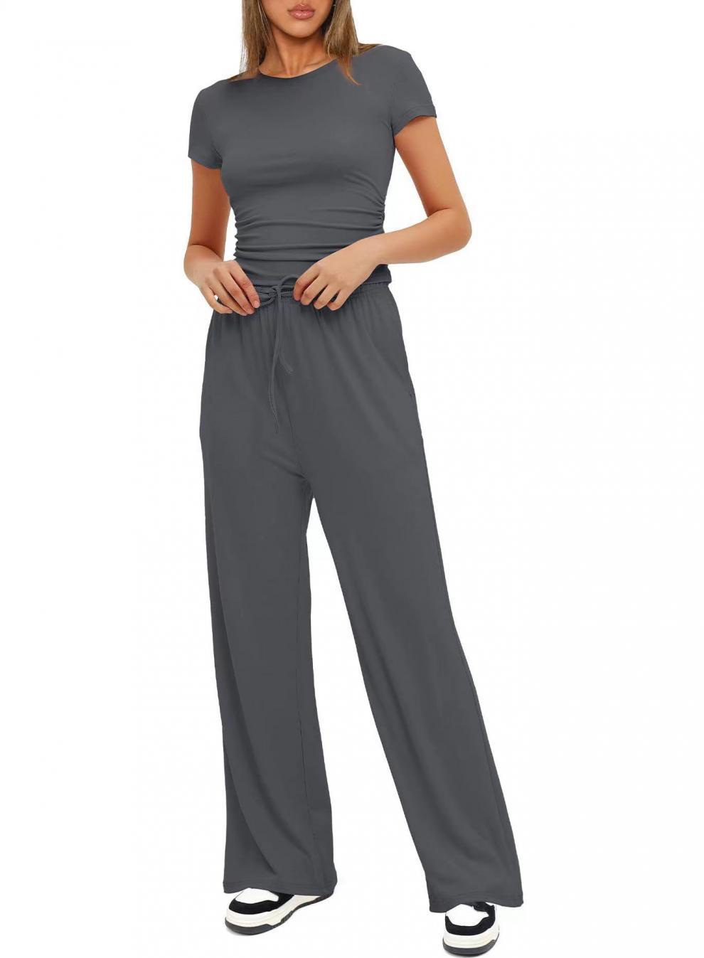 Traje casual de color sólido de Amazon, nuevo, de estilo europeo y americano, con mangas cortas plisadas, pantalones de pierna ancha y cintura alta, ropa deportiva.