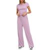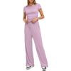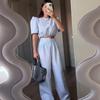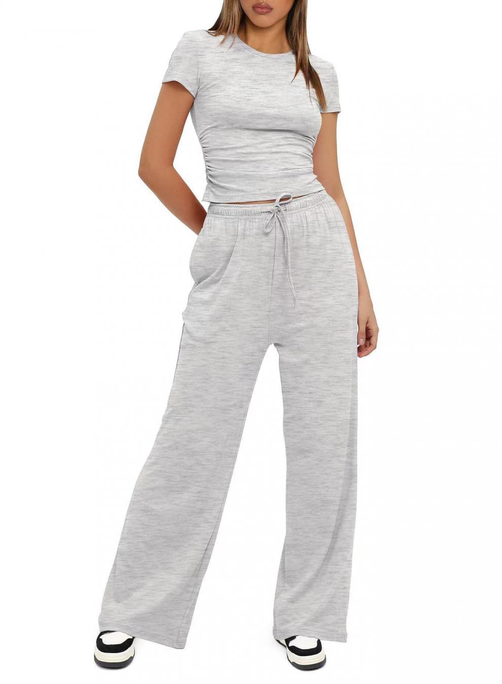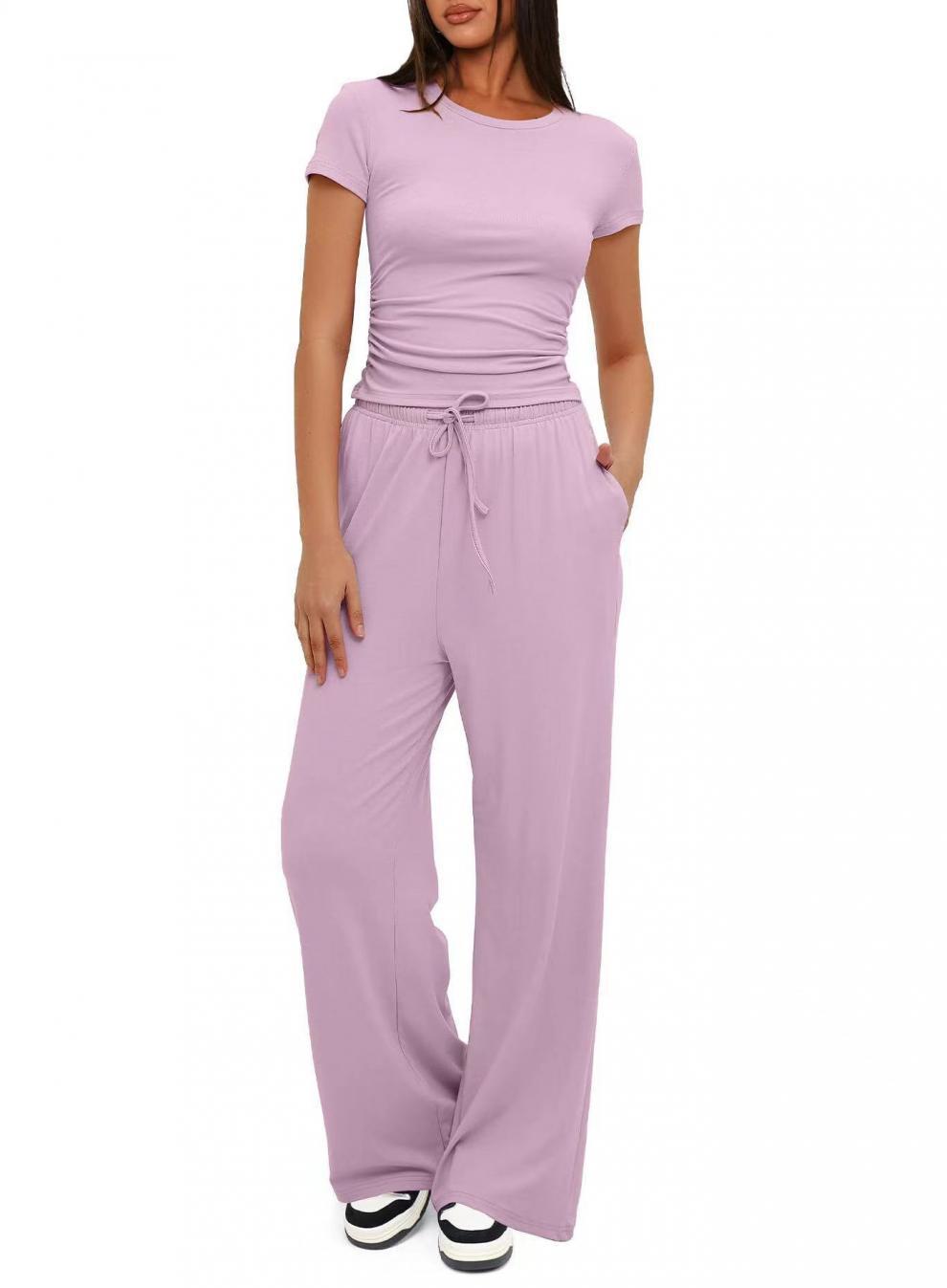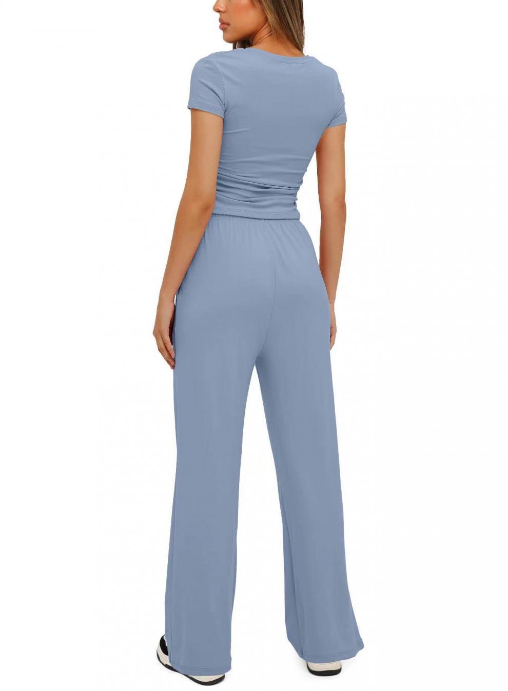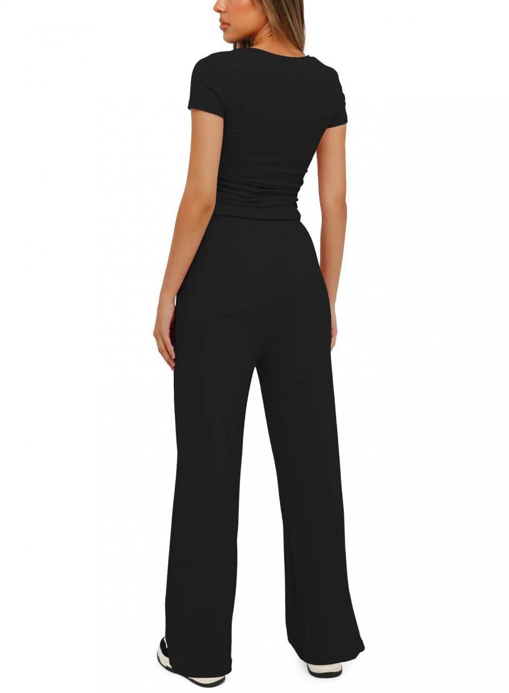 Traje casual de color sólido de Amazon, nuevo, de estilo europeo y americano, con mangas cortas plisadas, pantalones de pierna ancha y cintura alta, ropa deportiva.
