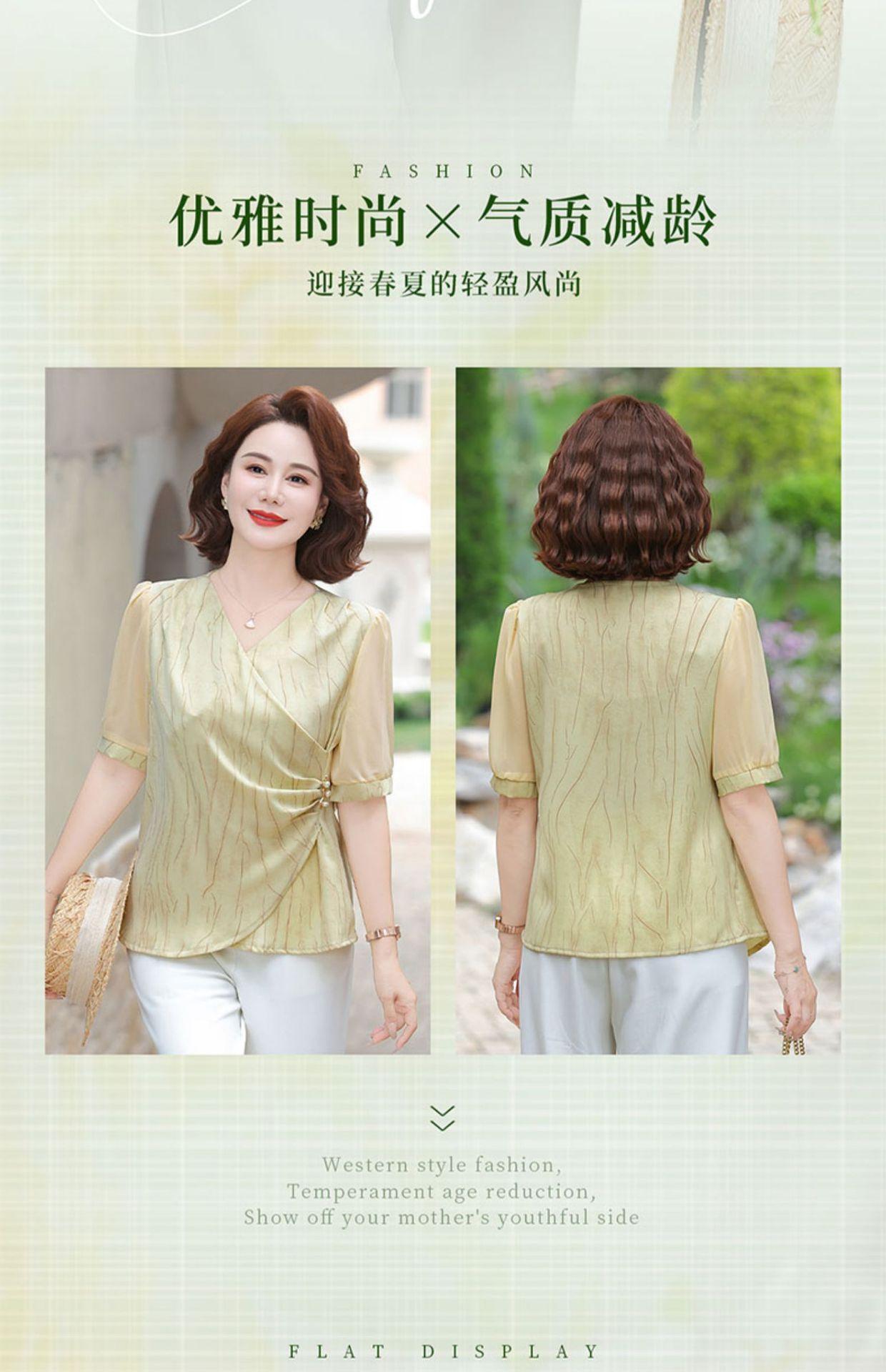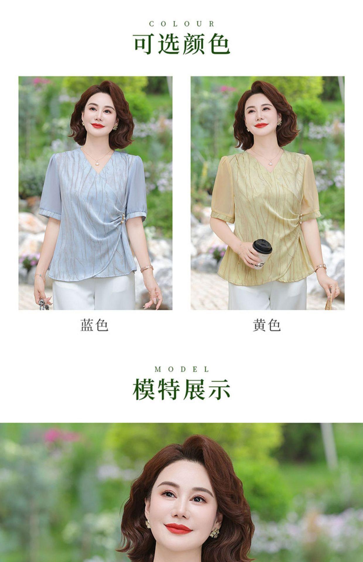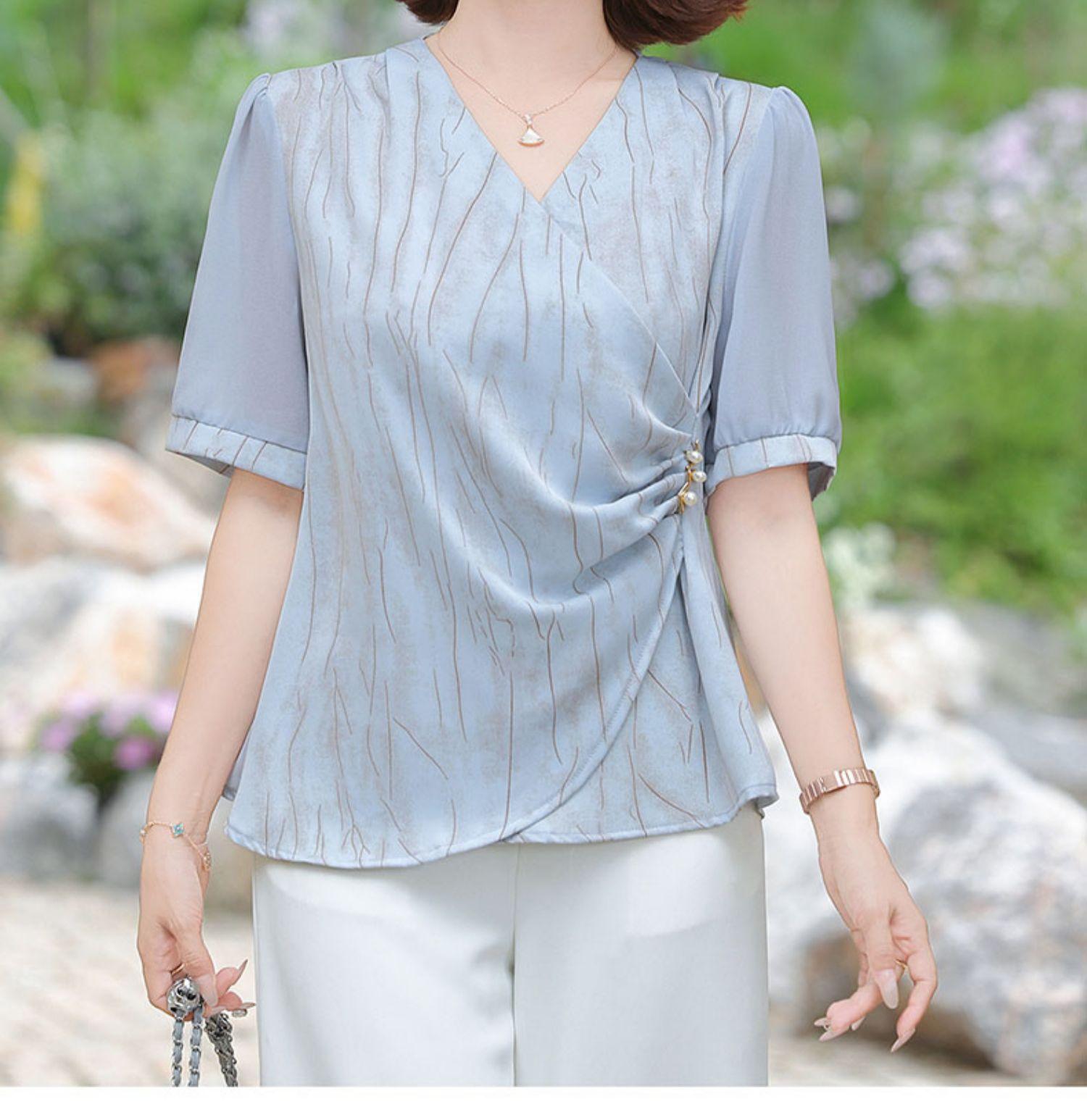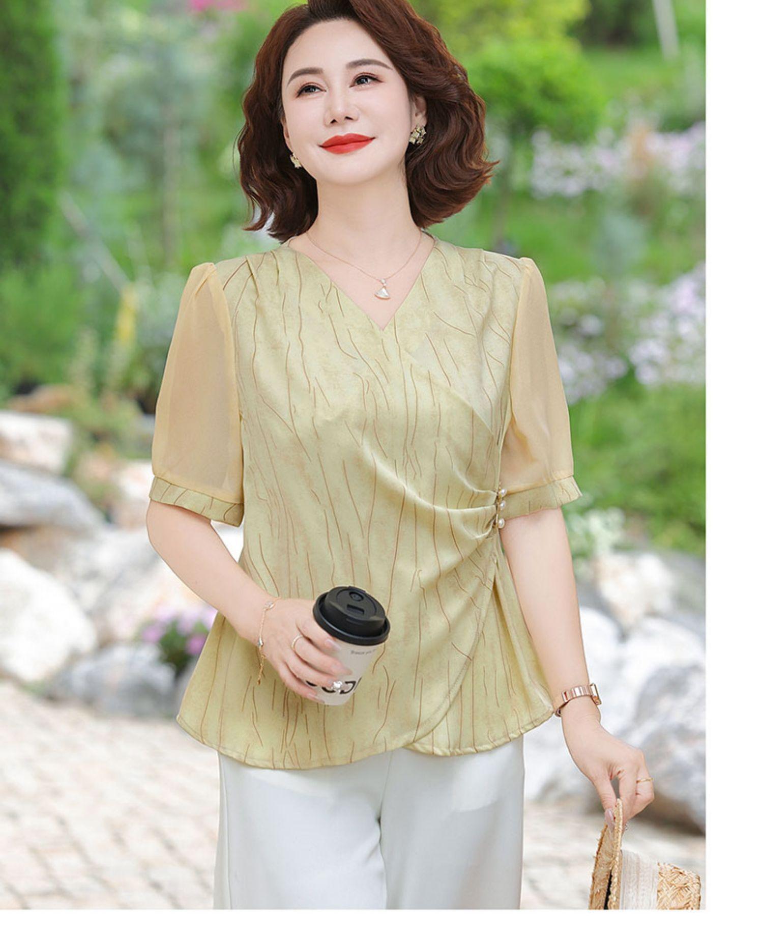 Camisa de Verano de Chifón de Manga Corta para Mamá 2025 Nueva para Mujeres de Mediana Edad y Mayores, Top de Cuello en V, Ropa de Moda para Dama
