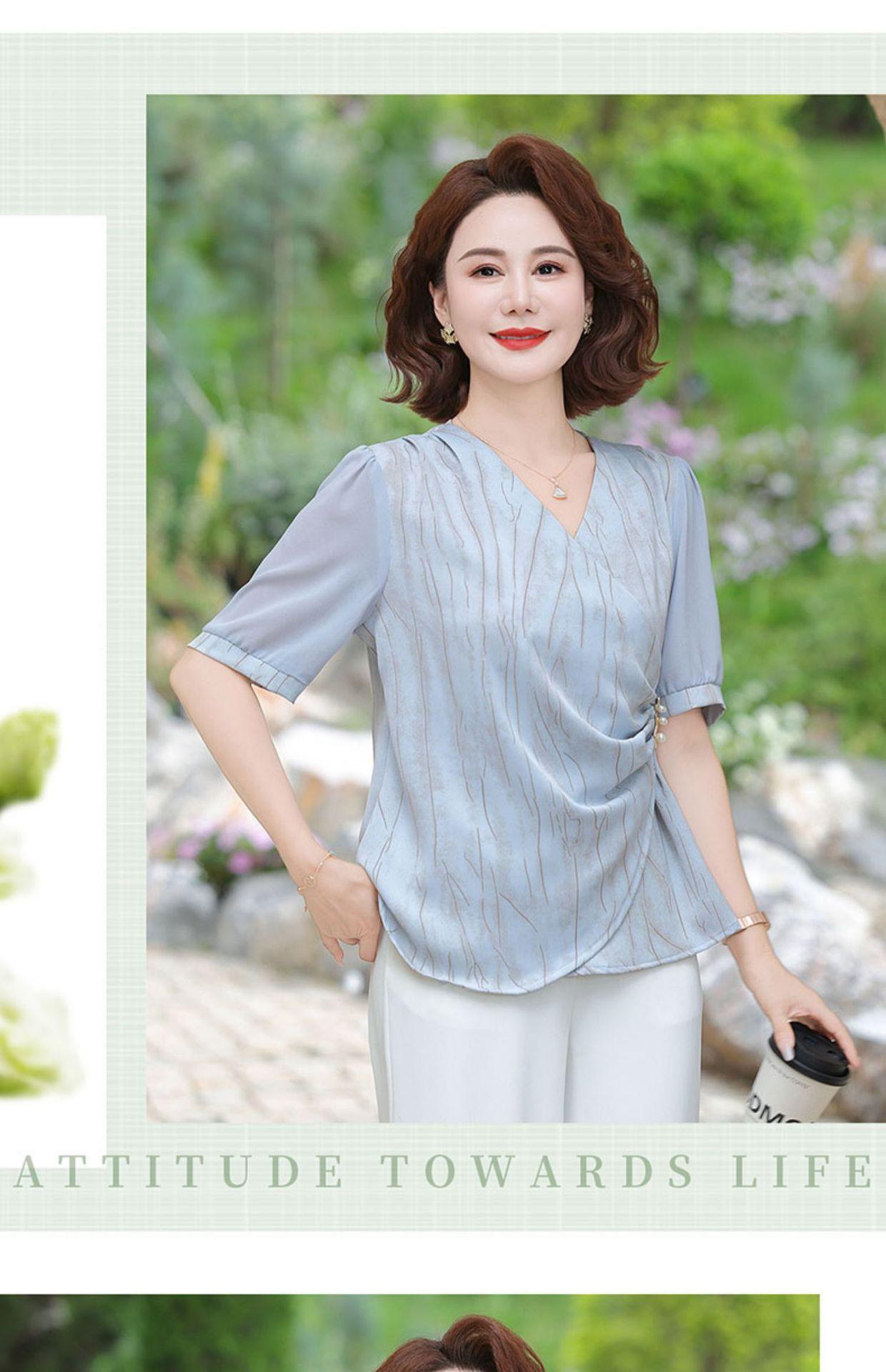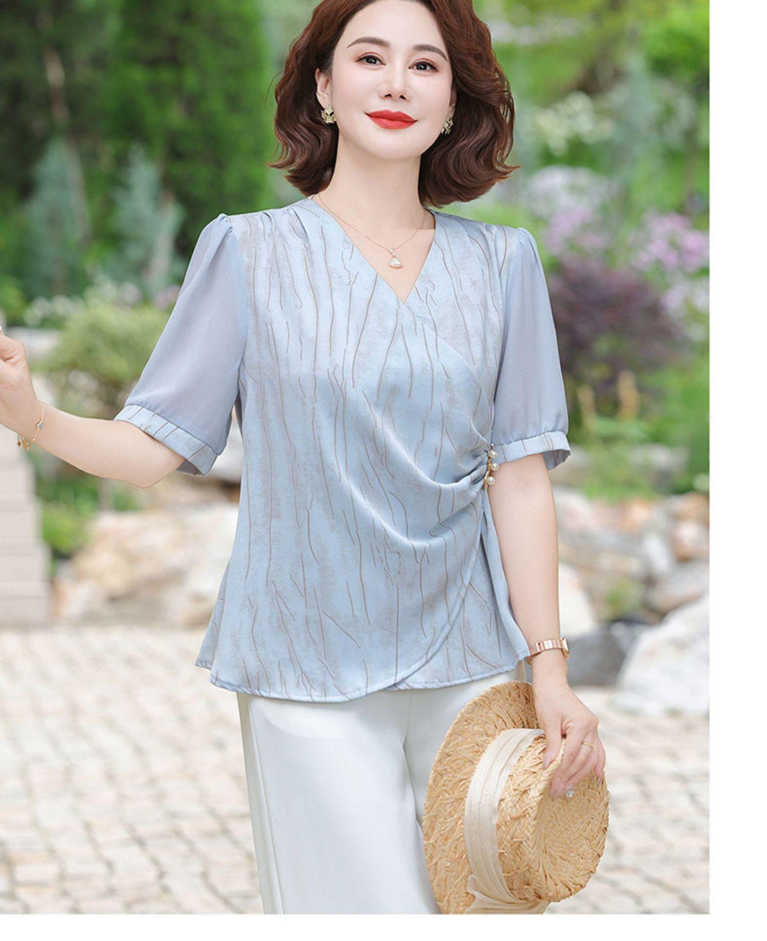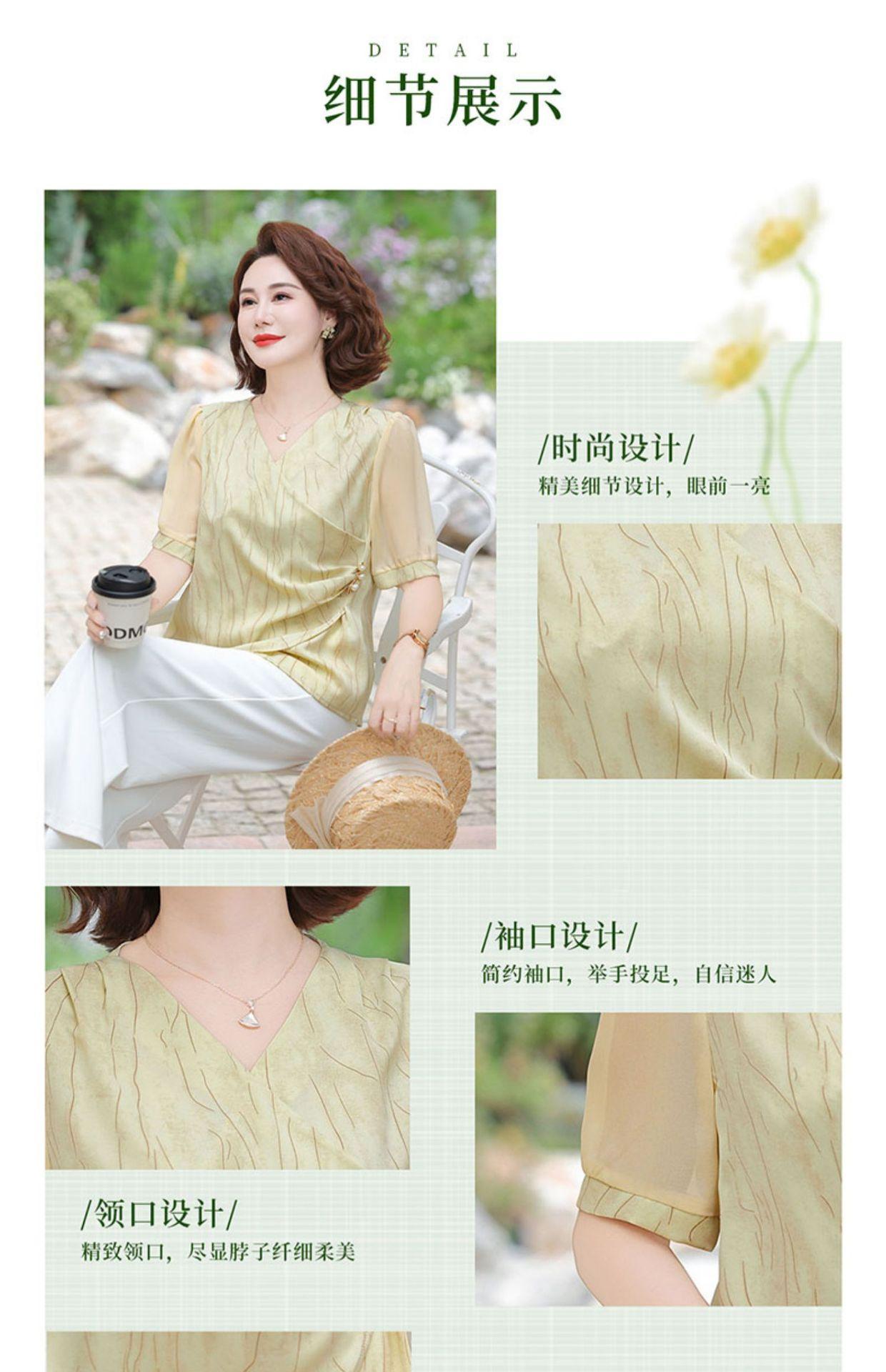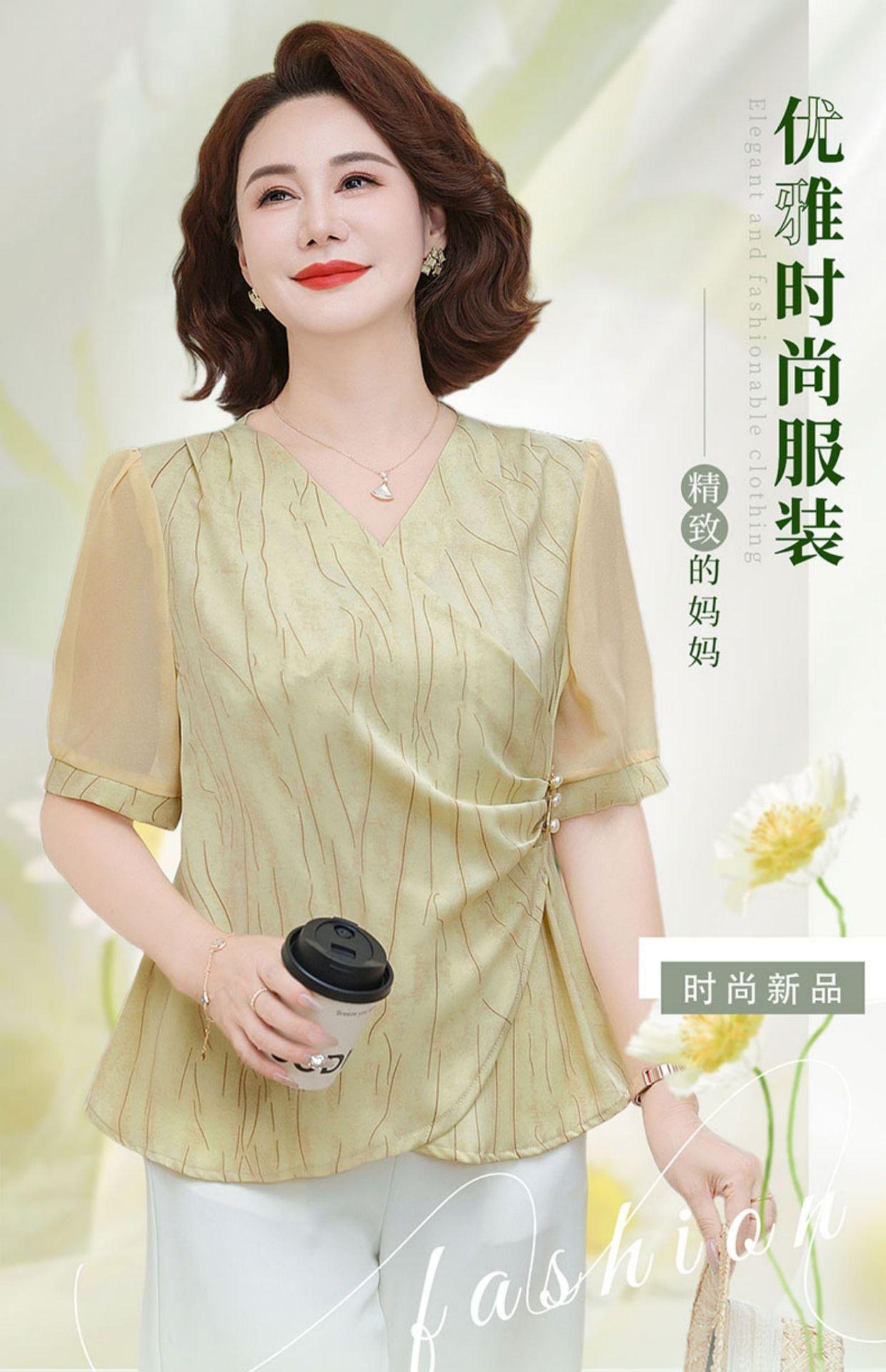 Camisa de Verano de Chifón de Manga Corta para Mamá 2025 Nueva para Mujeres de Mediana Edad y Mayores, Top de Cuello en V, Ropa de Moda para Dama