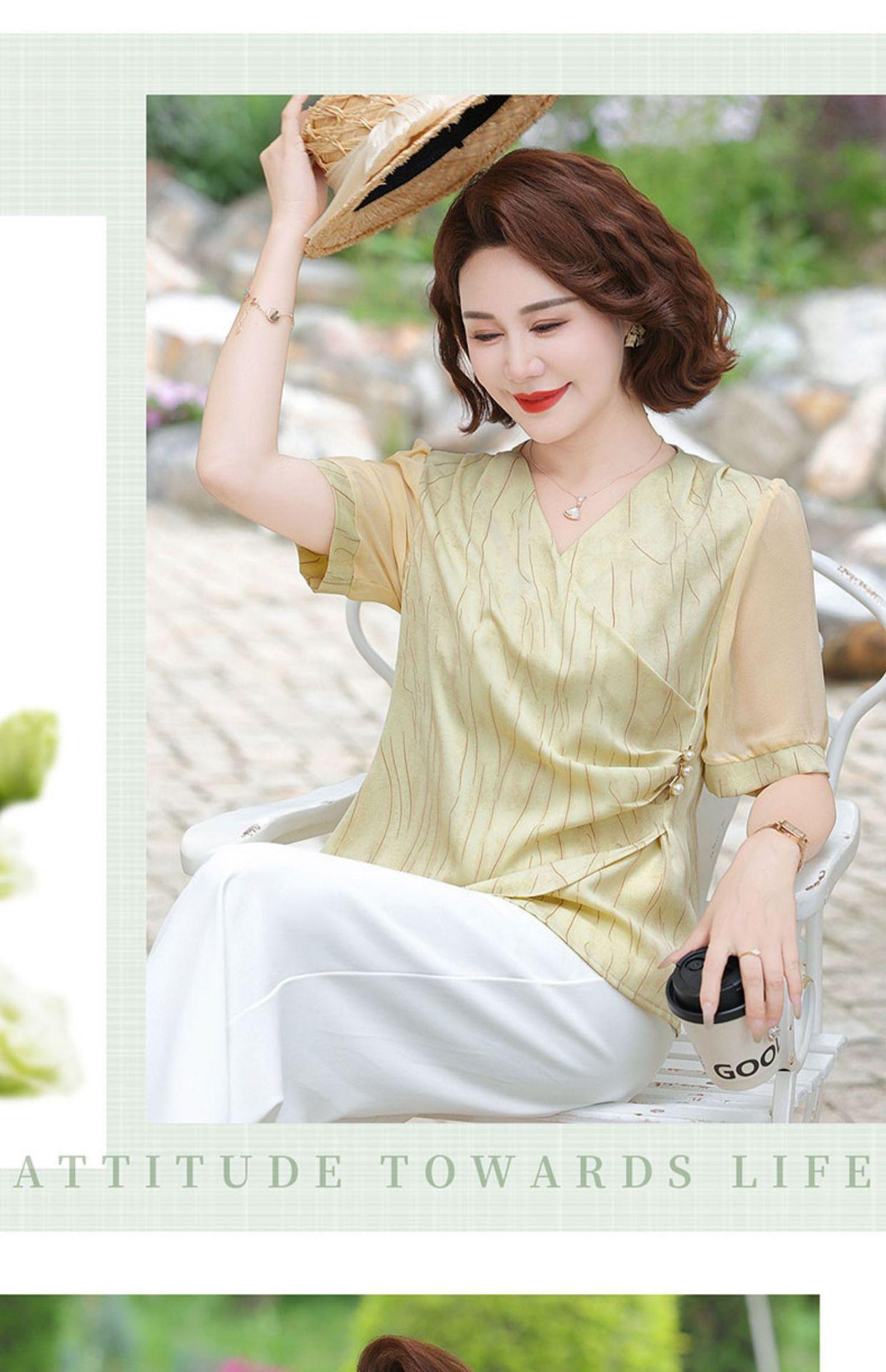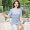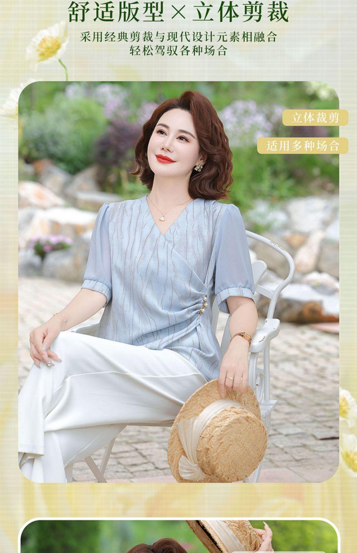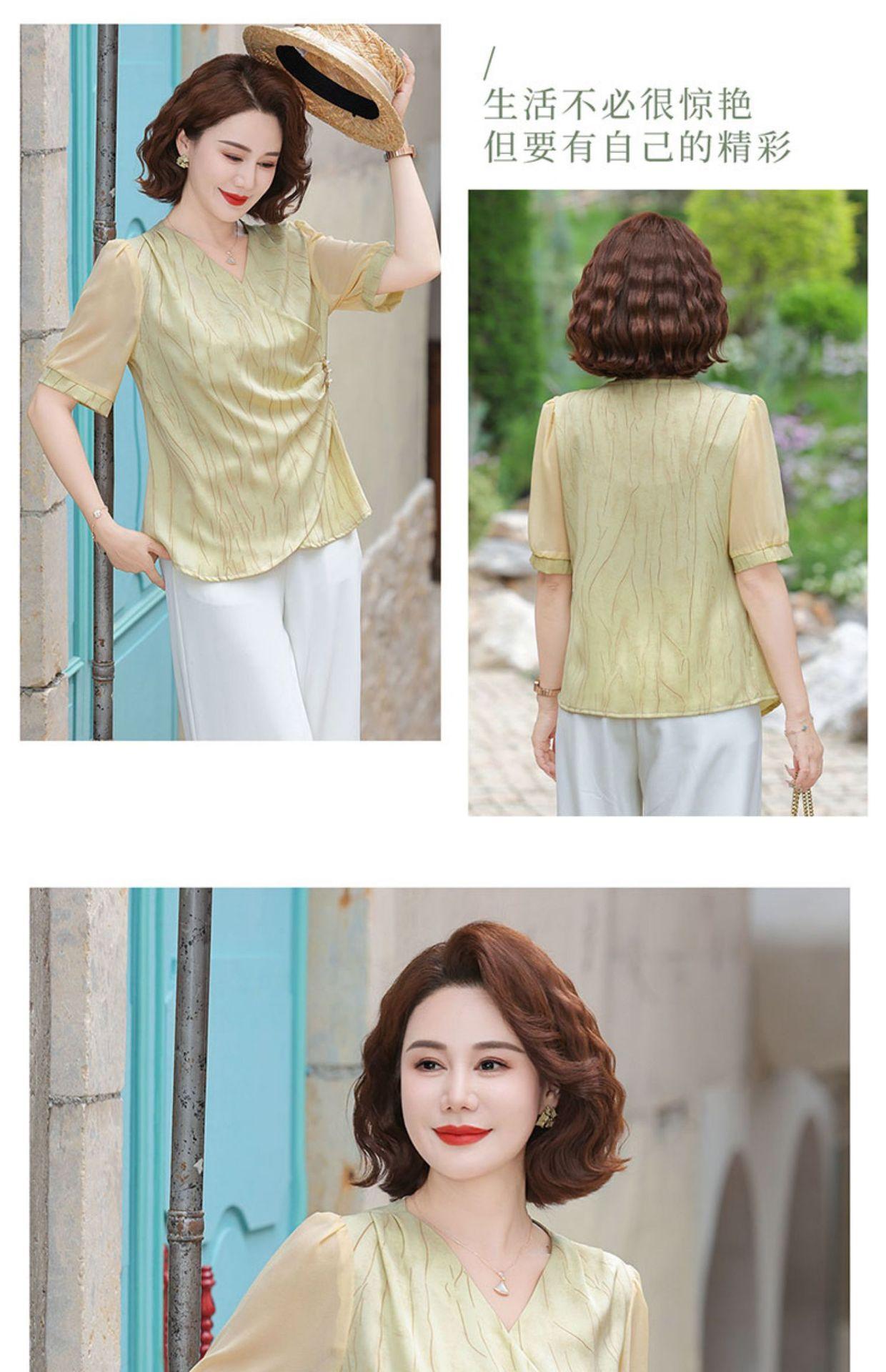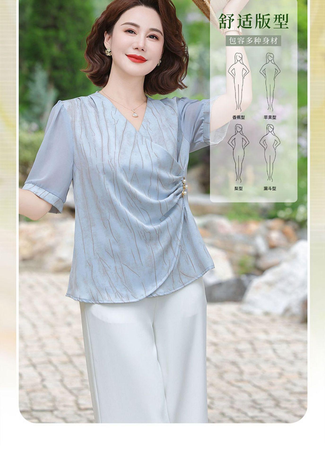 Camisa de Verano de Chifón de Manga Corta para Mamá 2025 Nueva para Mujeres de Mediana Edad y Mayores, Top de Cuello en V, Ropa de Moda para Dama
