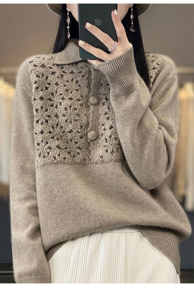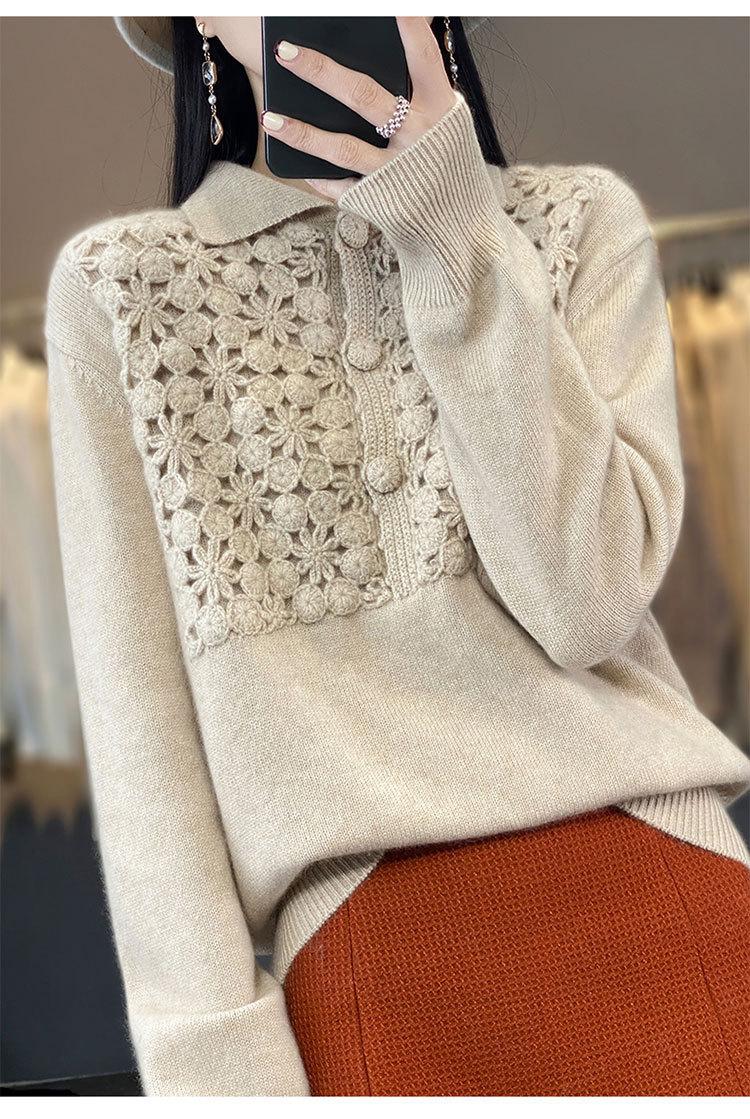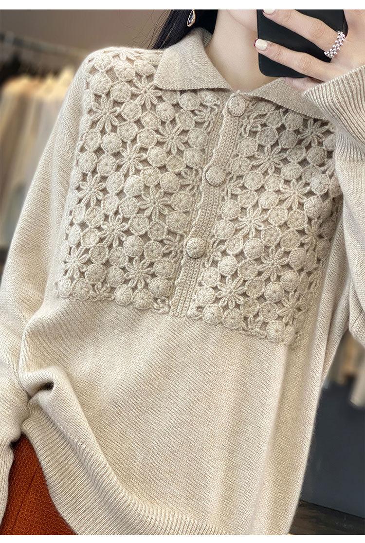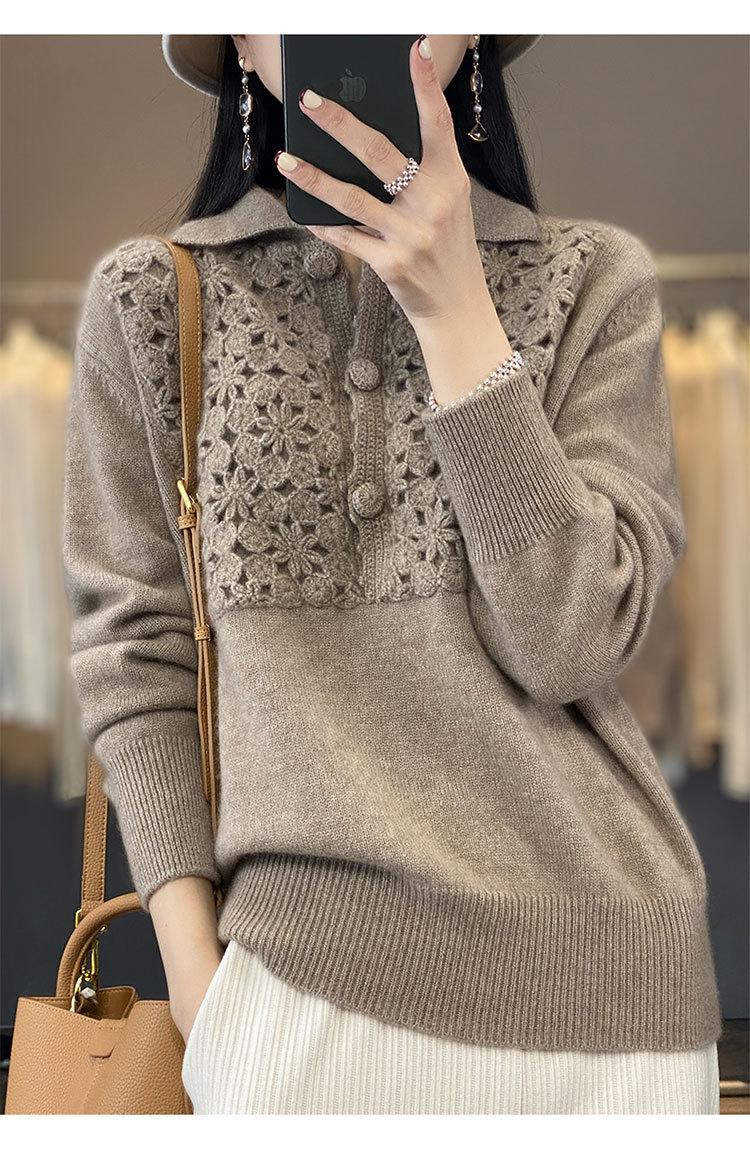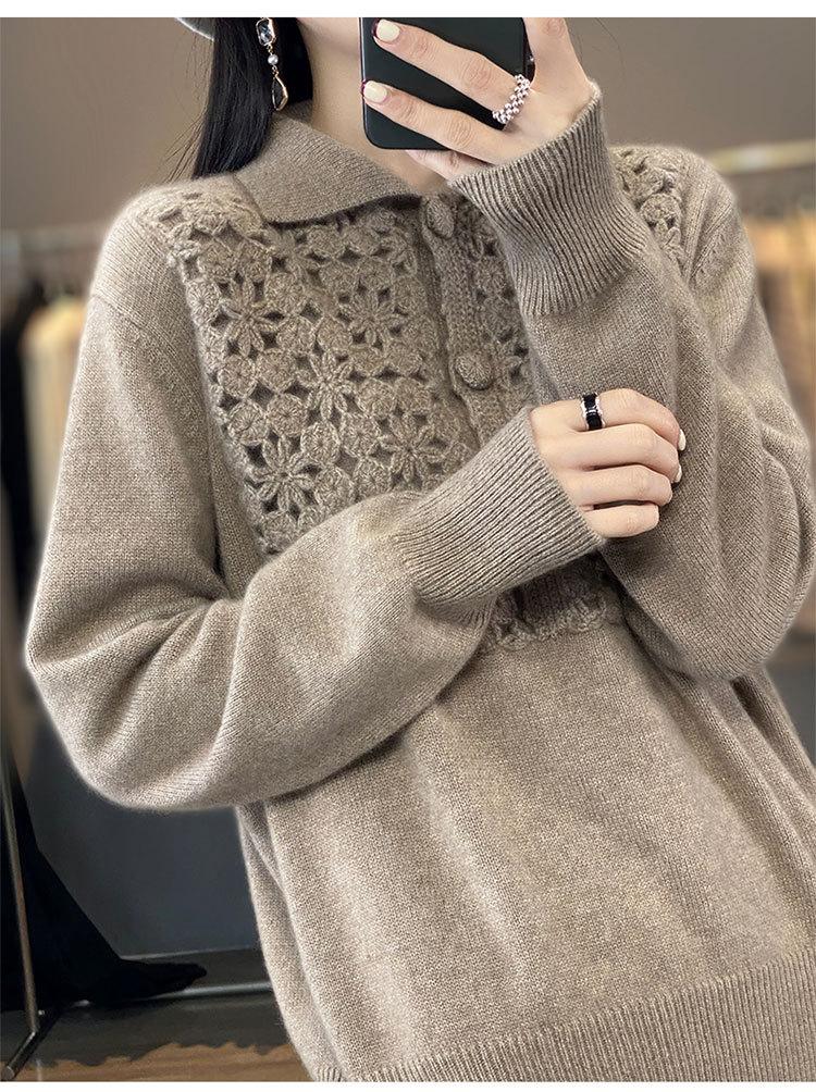 Suéter de temperamento calado tejido a crochet de color sólido simple con solapa estilo coreano, elegante para ir al trabajo, todo de lana, nuevo jersey de punto