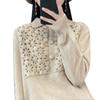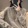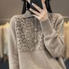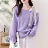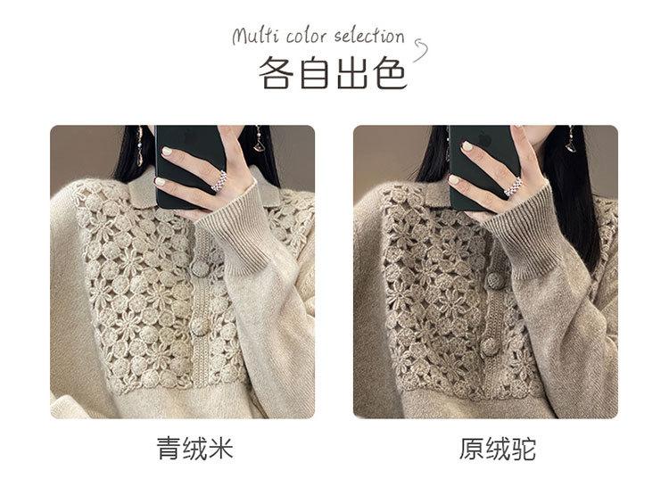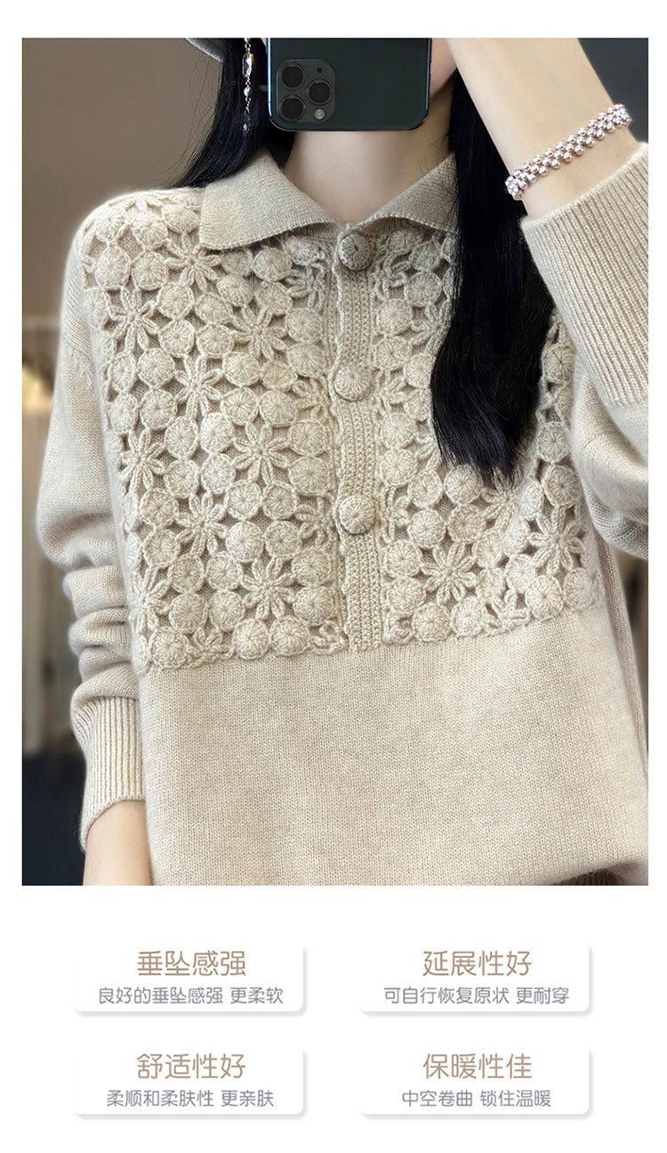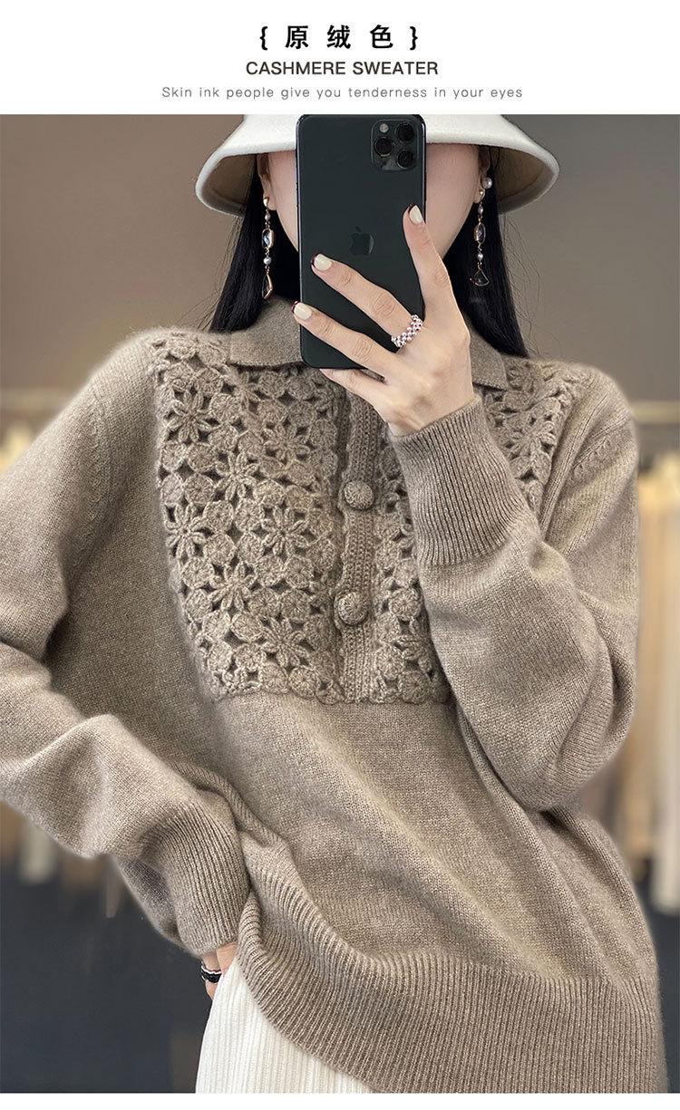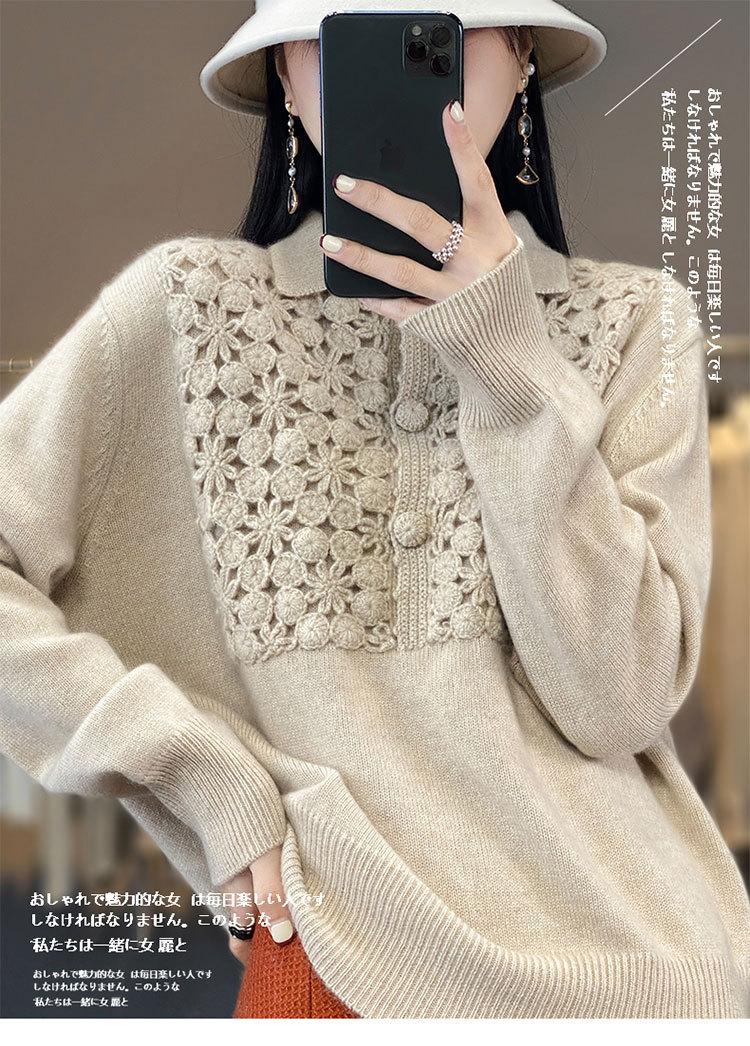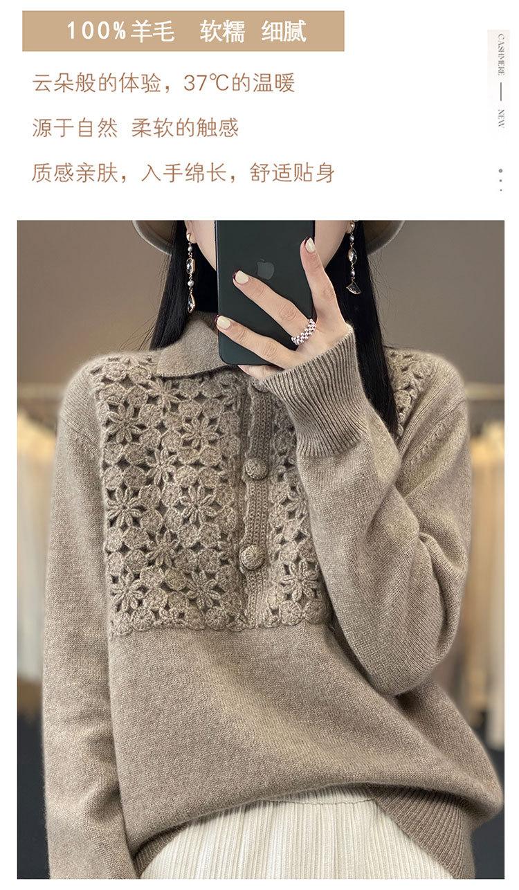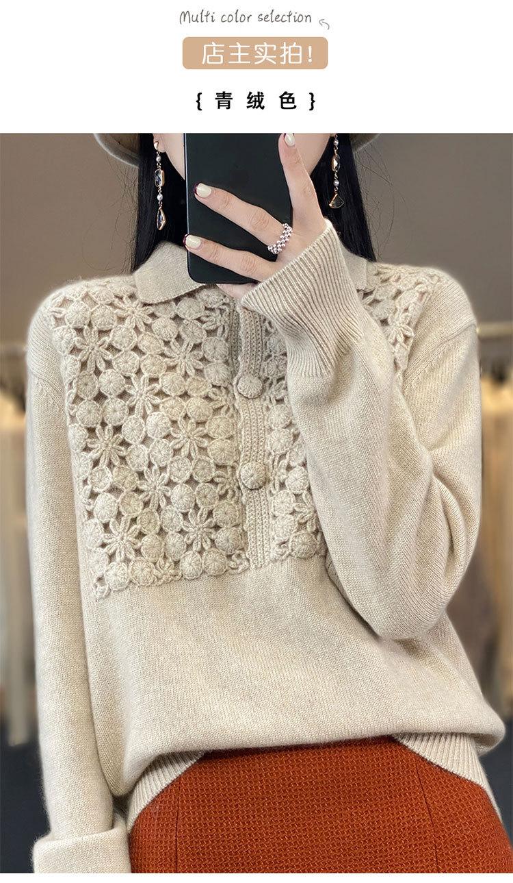 Suéter de temperamento calado tejido a crochet de color sólido simple con solapa estilo coreano, elegante para ir al trabajo, todo de lana, nuevo jersey de punto