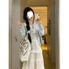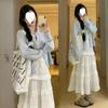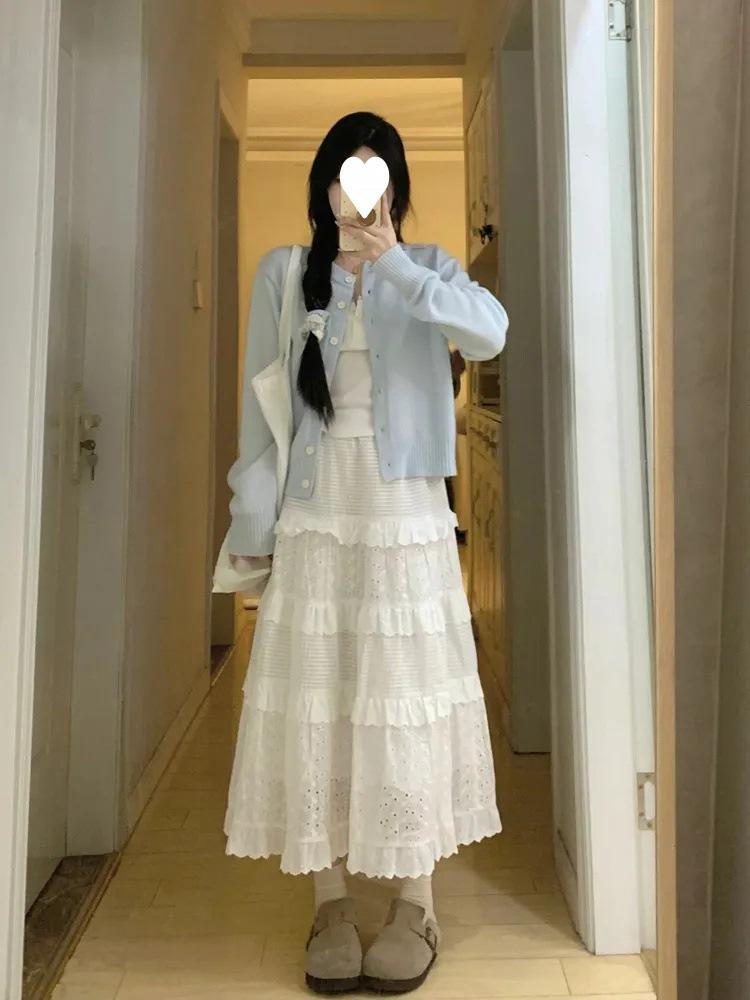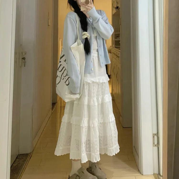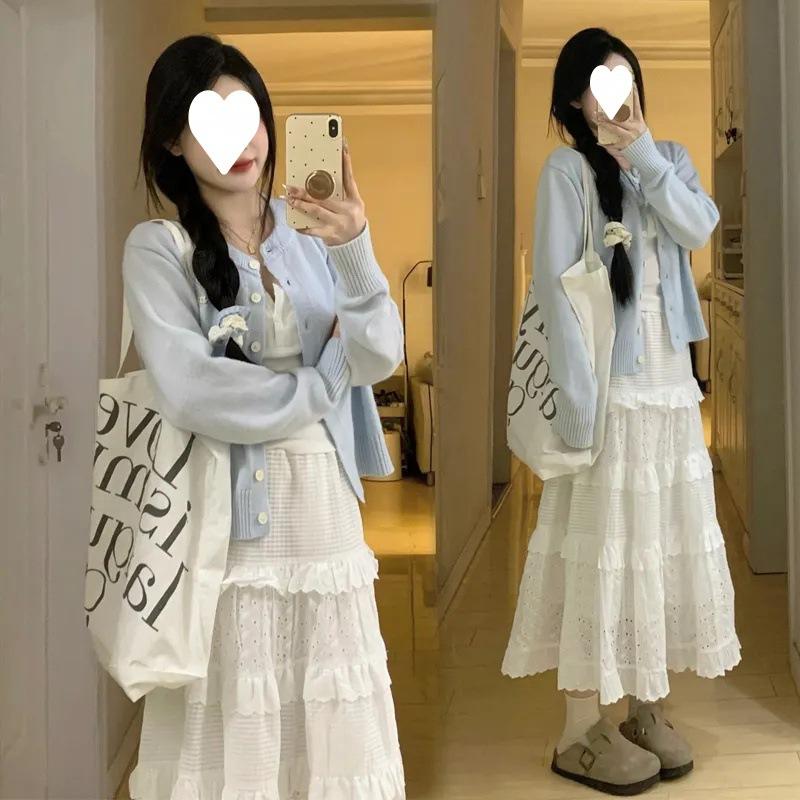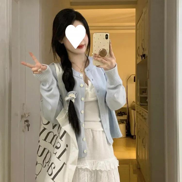 Conjunto de Tres Piezas para Mujer Azul Cielo Estilo Coreano Suéter Cárdigan Abrigo Primavera Temprana Nueva Llegada Camisola Falda Midi
