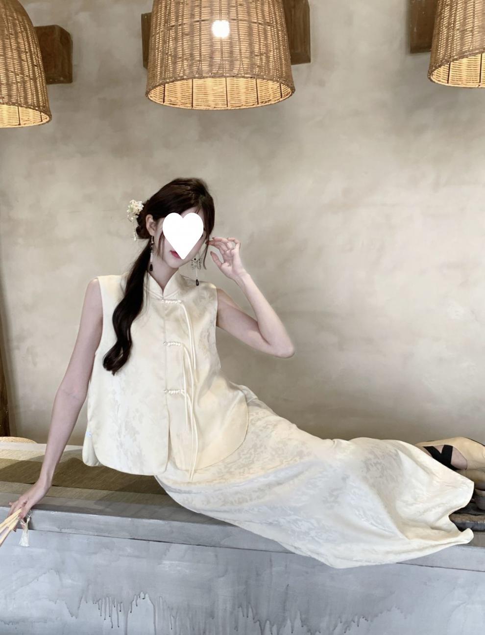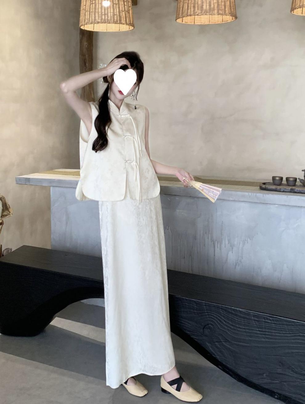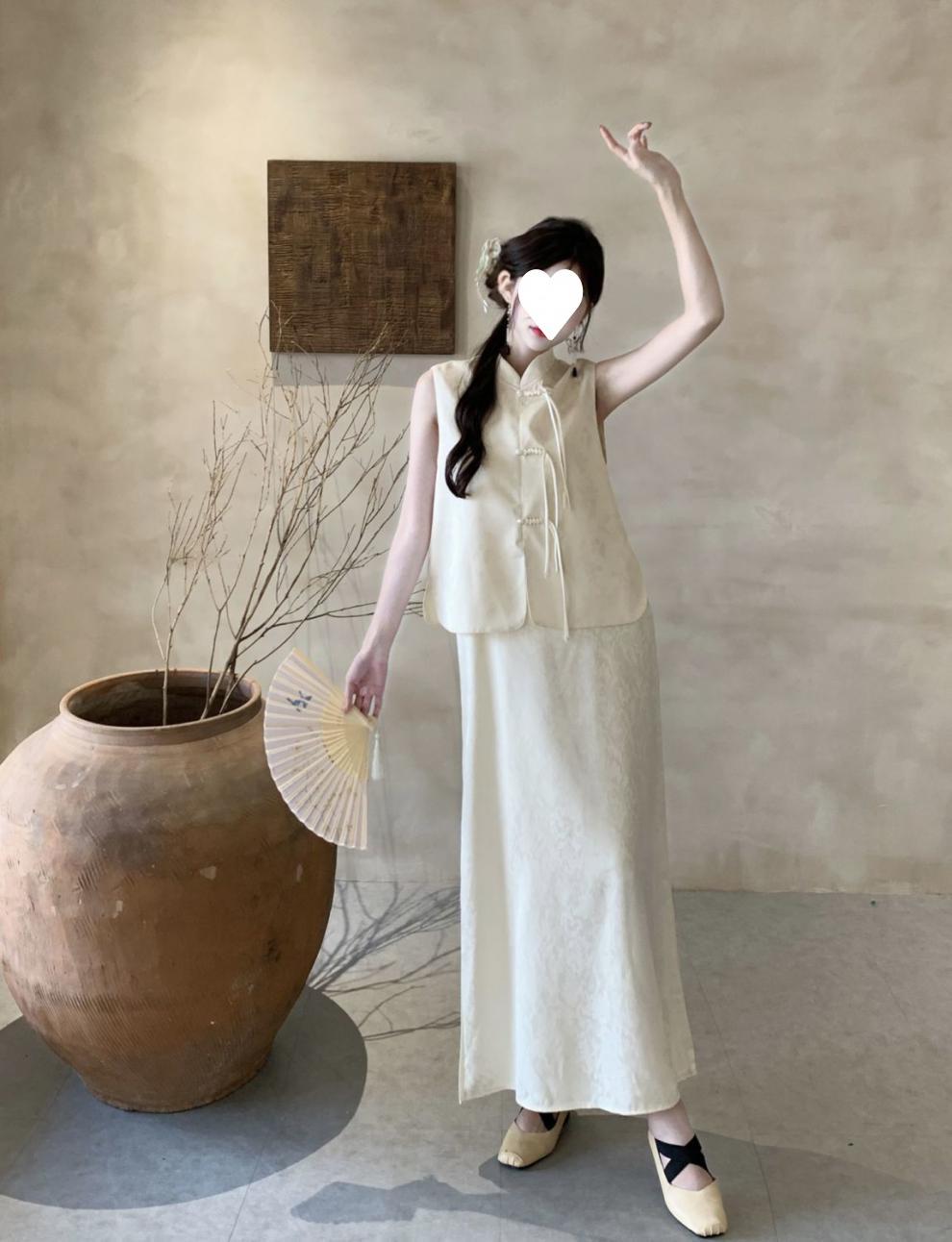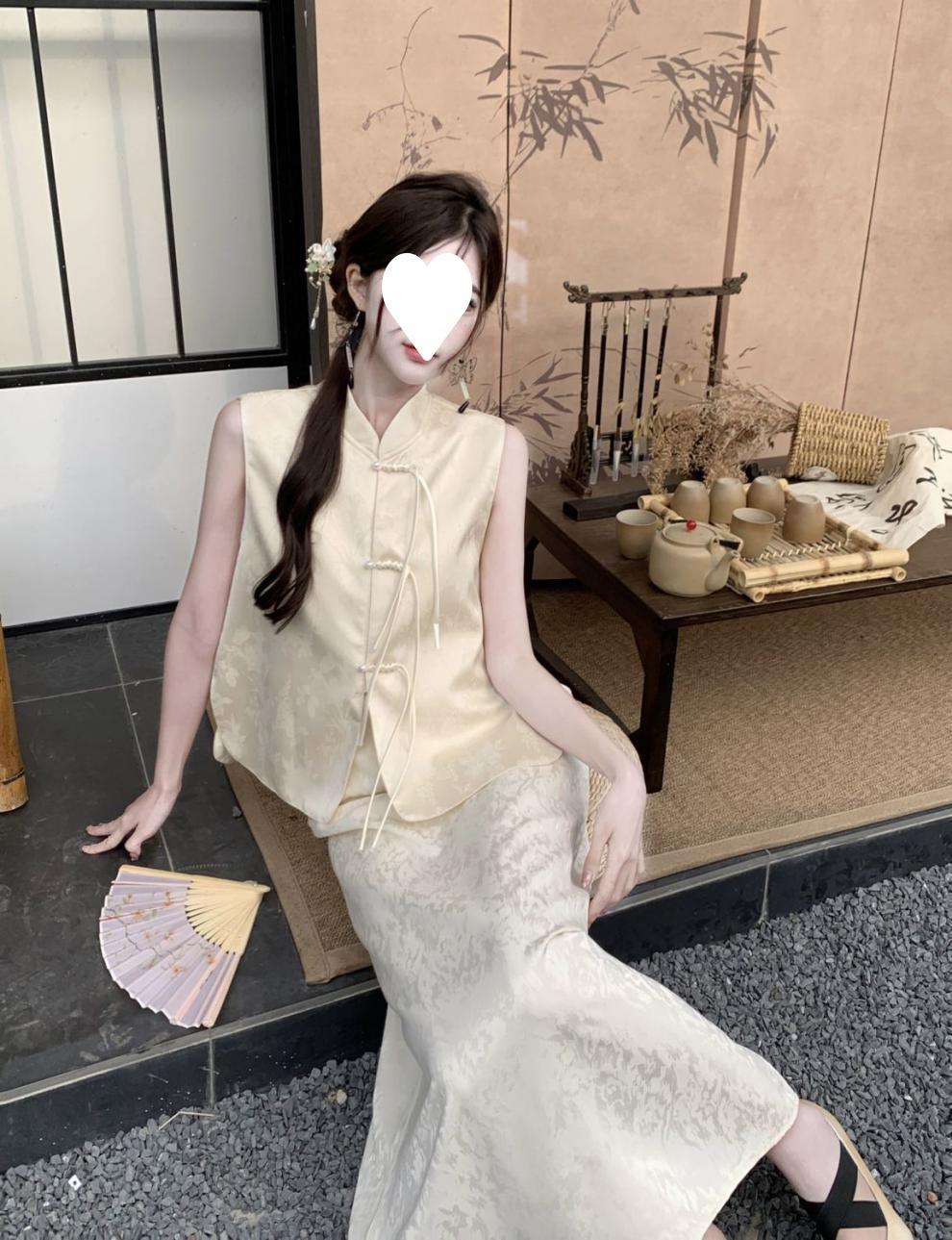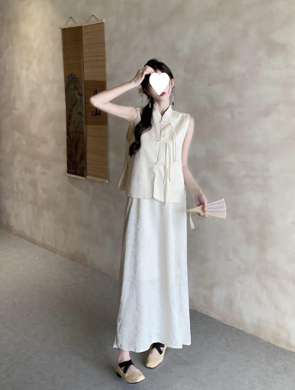 Nuevo Set de Estilo Nacional de Estilo Chino para Mujer Chaleco Chaleco con Cuello de Hebilla Vestido Elegante con Tirantes Conjunto de Dos Piezas a la Moda Verano
