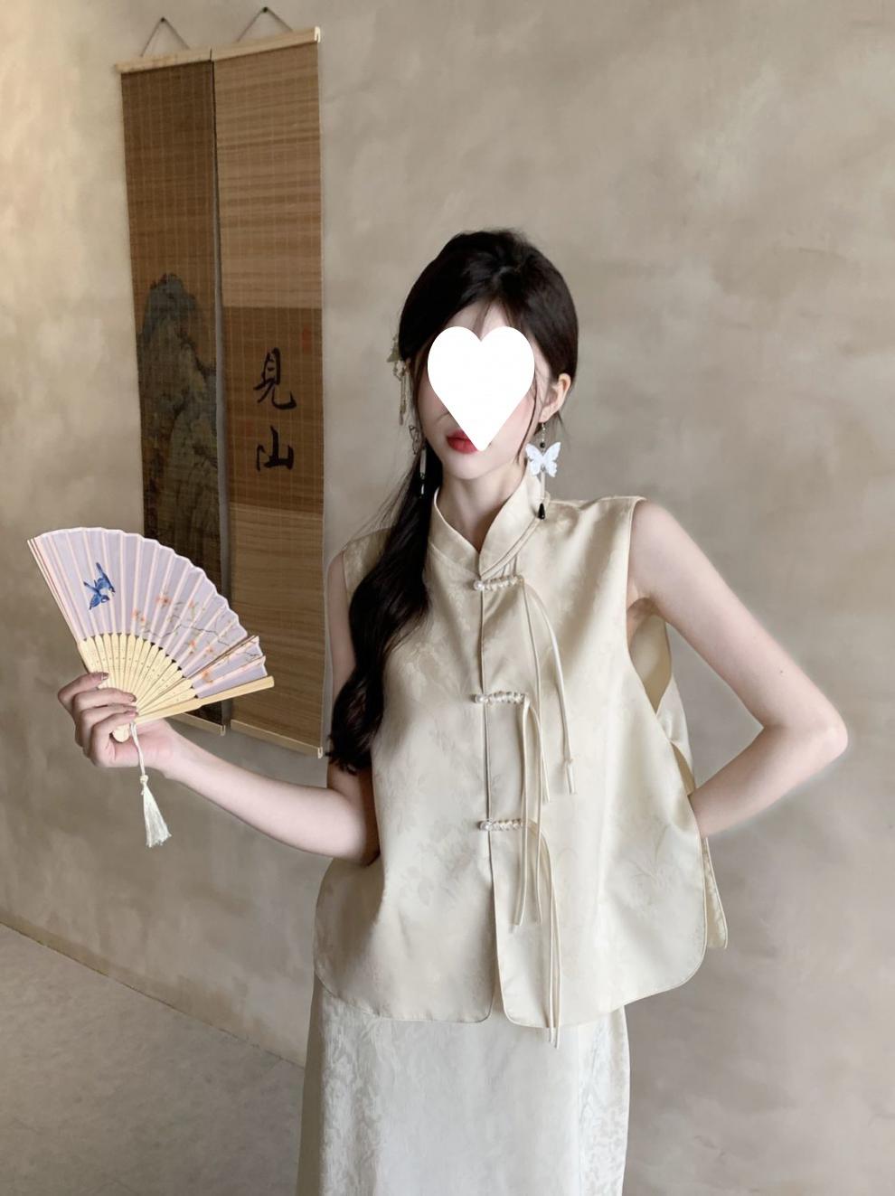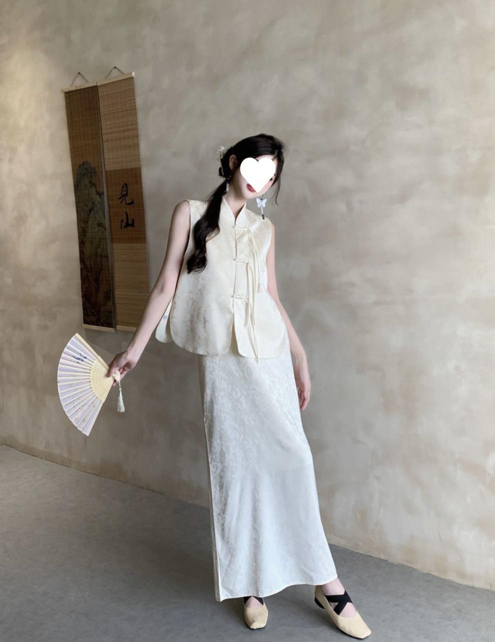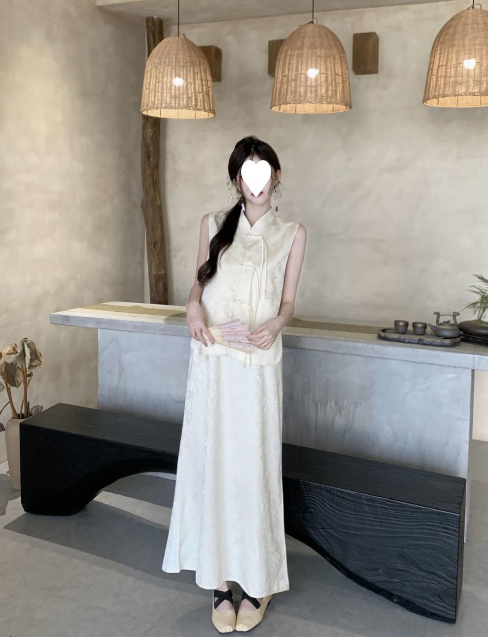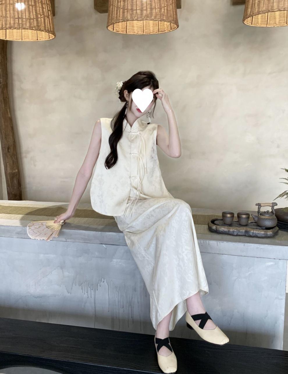 Nuevo Set de Estilo Nacional de Estilo Chino para Mujer Chaleco Chaleco con Cuello de Hebilla Vestido Elegante con Tirantes Conjunto de Dos Piezas a la Moda Verano