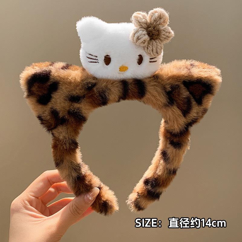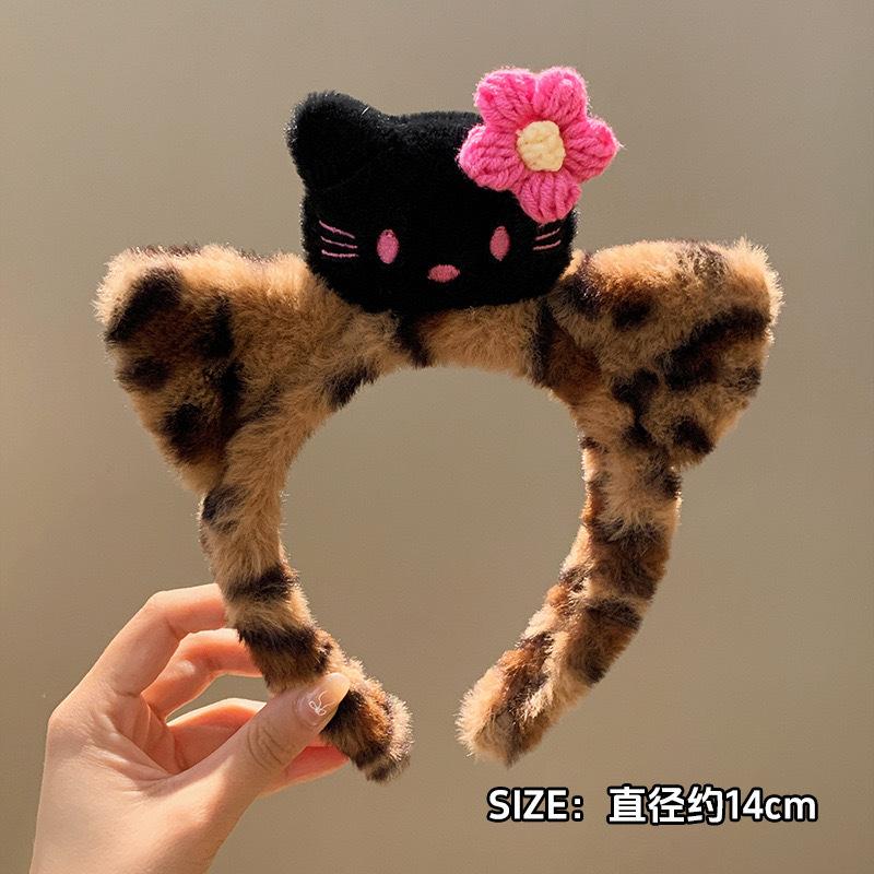 Lindo Diadema de Felpa con Cabeza de Gato Kt con Estampado de Leopardo para Casa Niña Lavado de Cara Diadema Horquilla Maquillaje Máscara Presión Accesorios para el Cabello