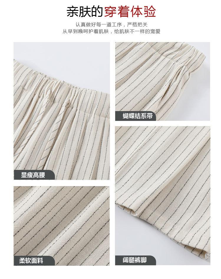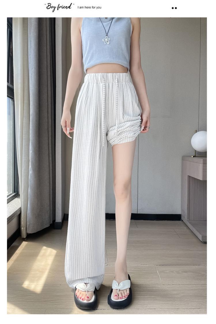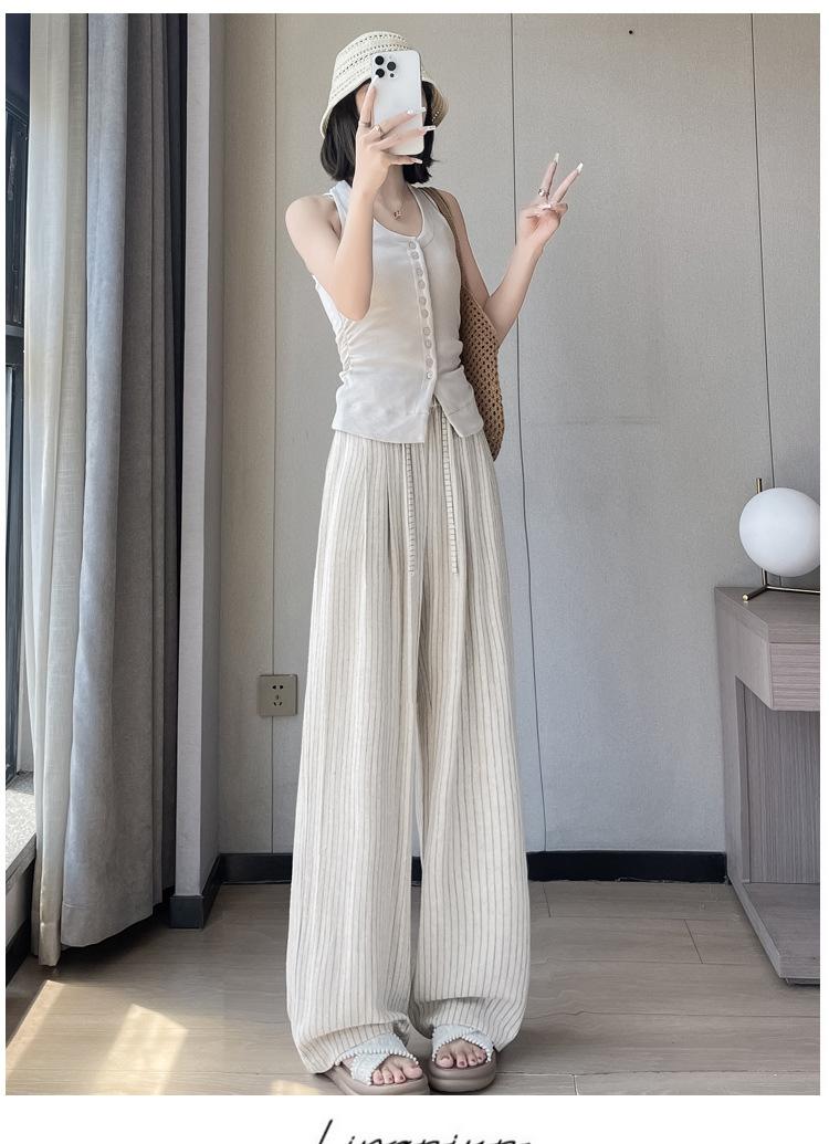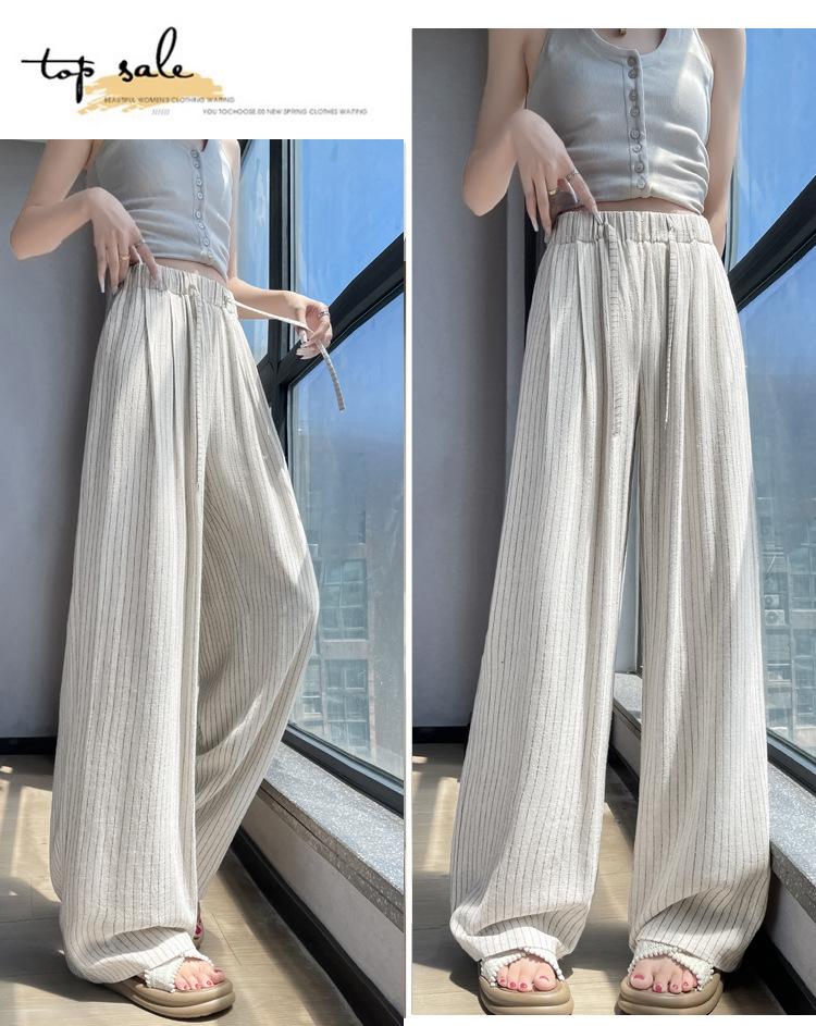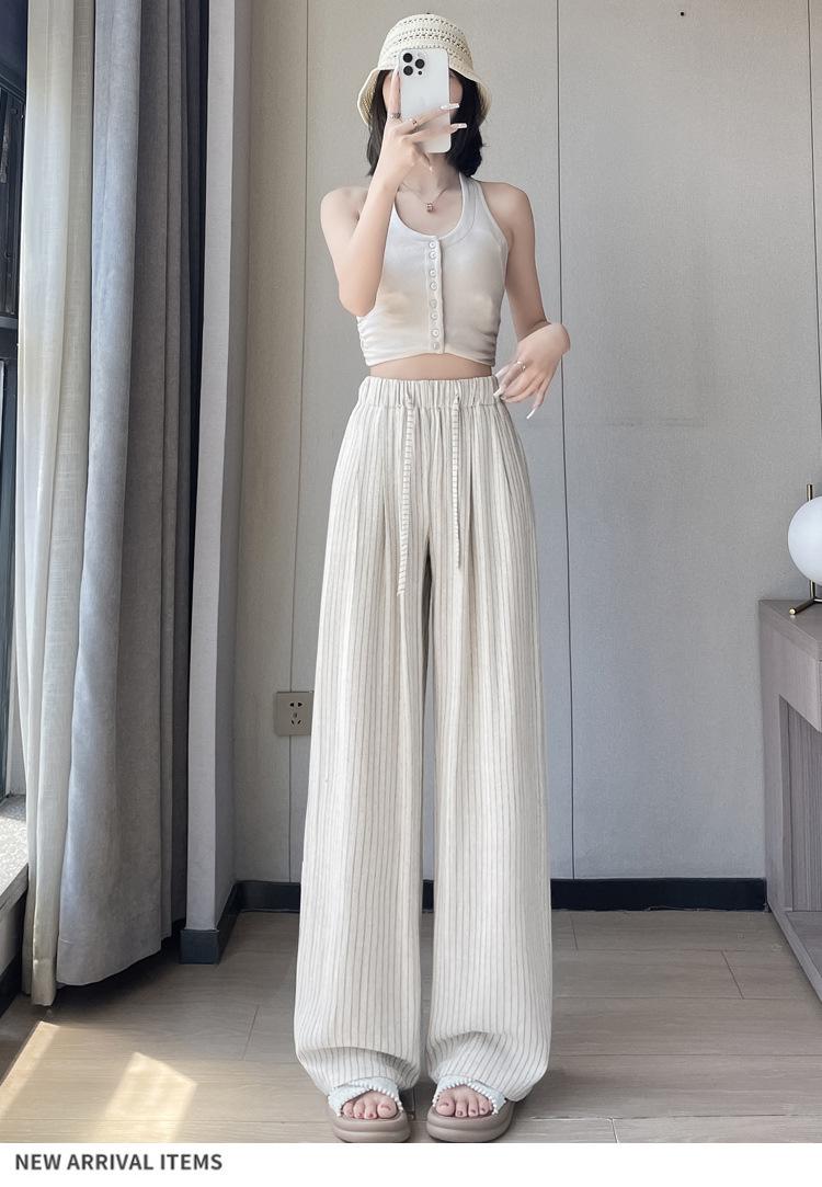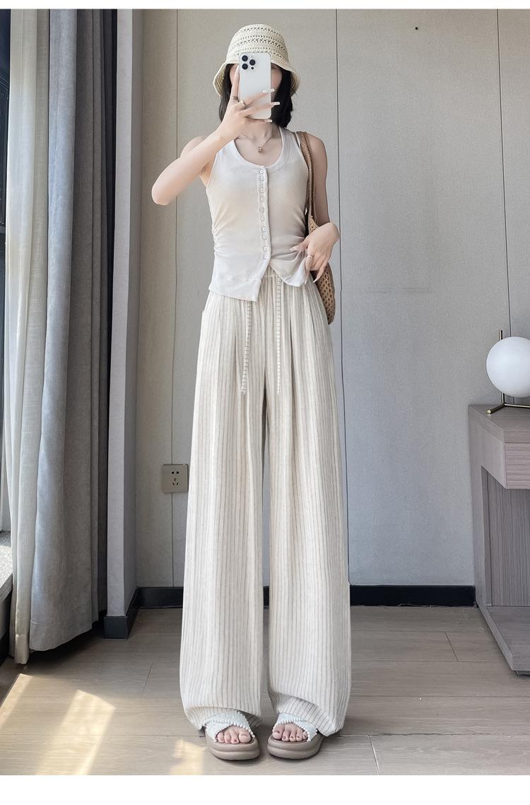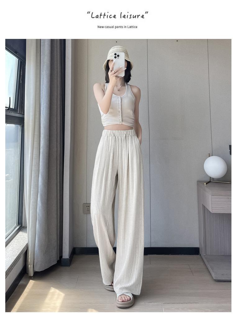 Pantalones holgados de verano algodón lino lino cintura alta elásticos cómodos transpirables pantalones de pierna ancha para mujer delgados a rayas pantalones casuales algodón puro