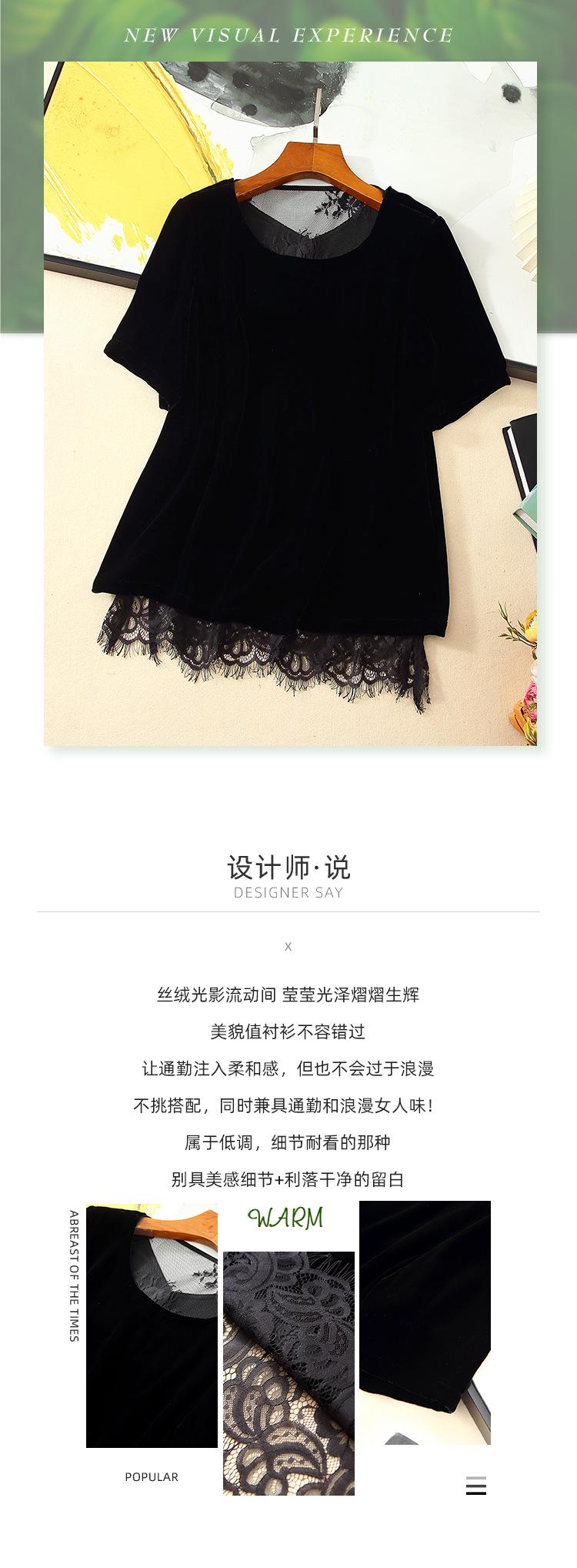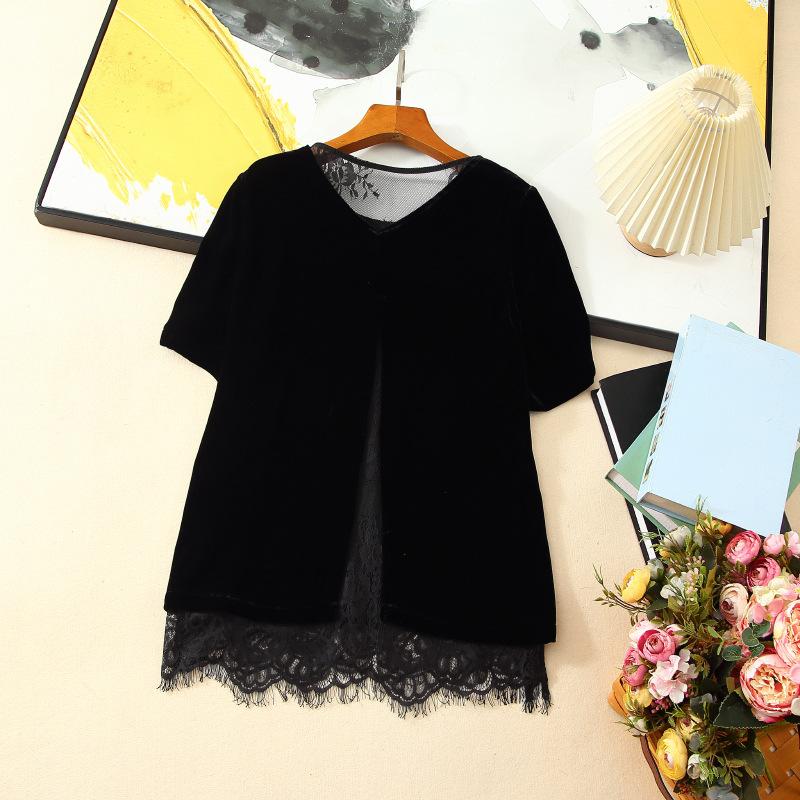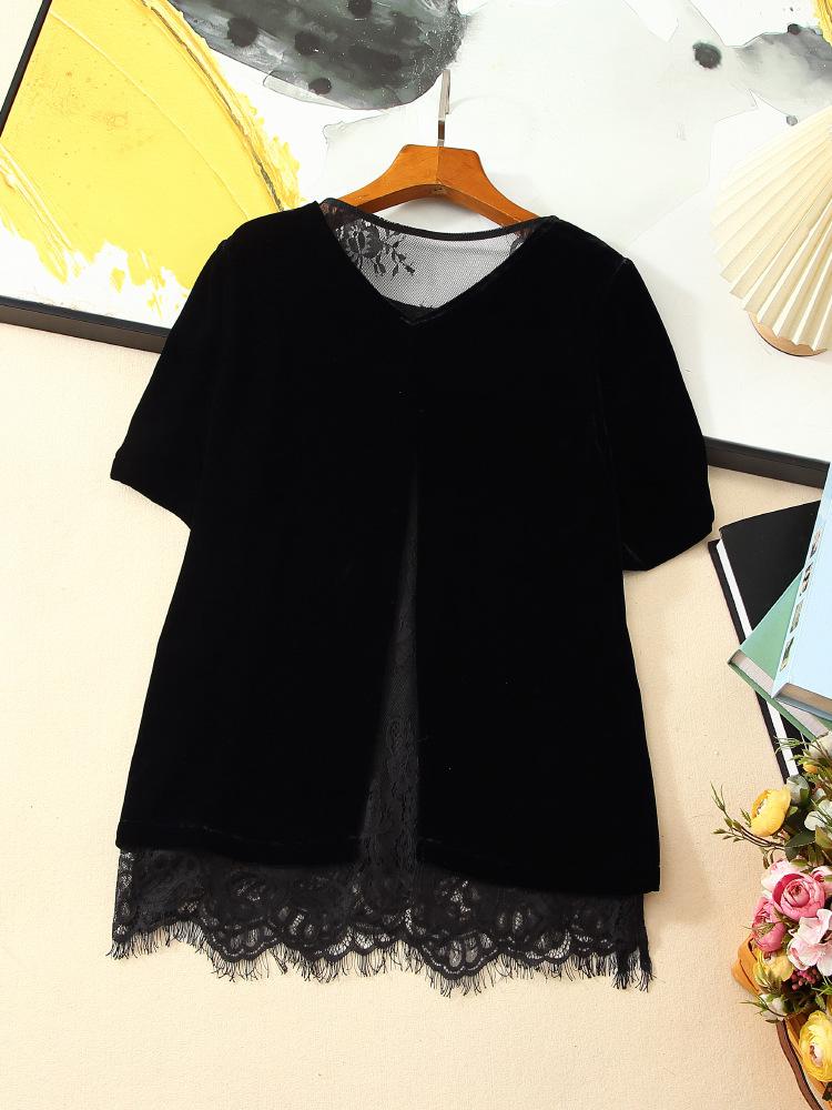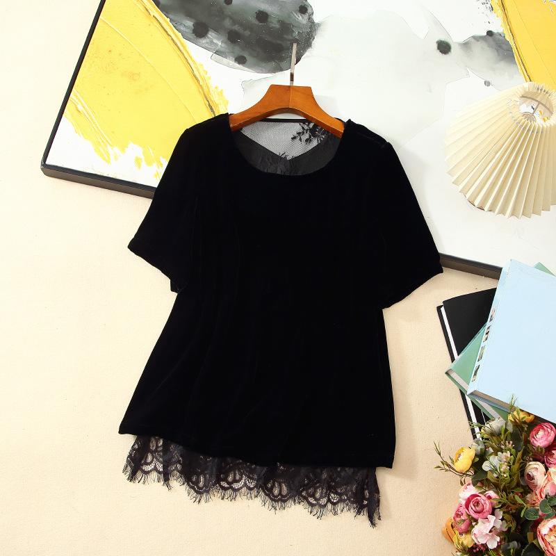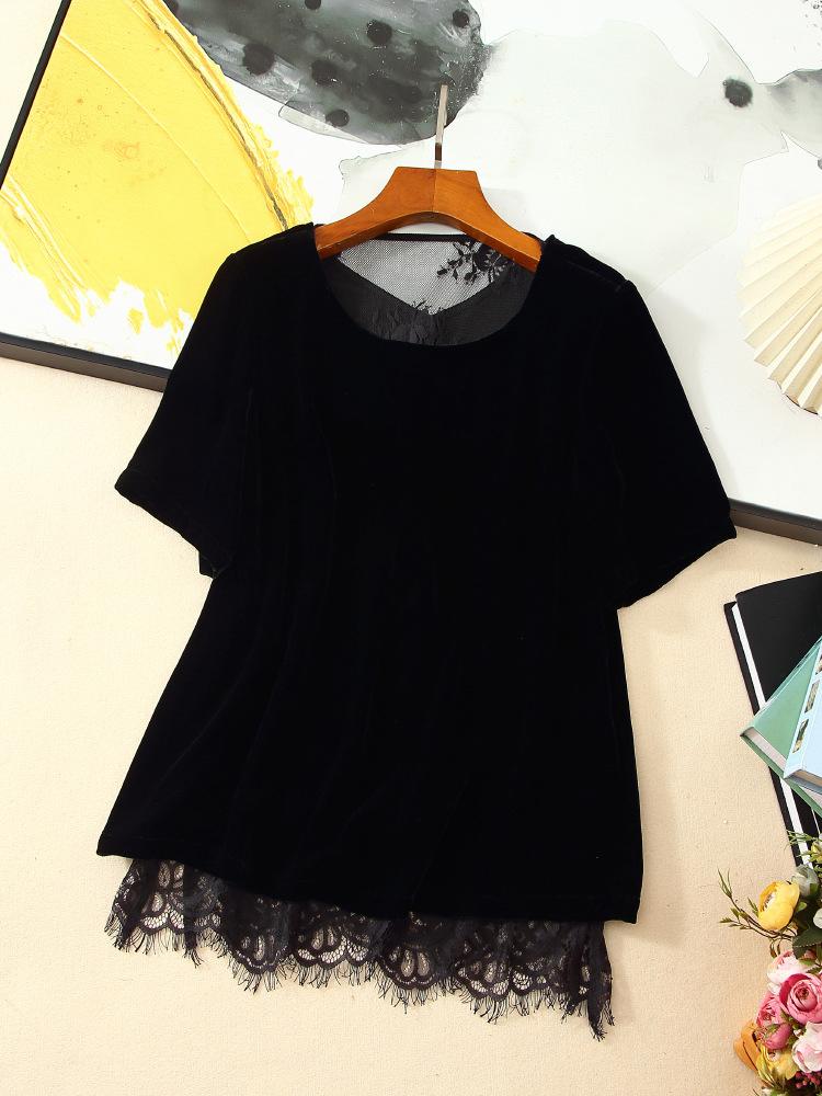 205 Otoño Nuevo Lujo Ligero Terciopelo de Seda Francés Encaje Patchwork Top Temperamental Suelto Versátil Camisa Manga Corta