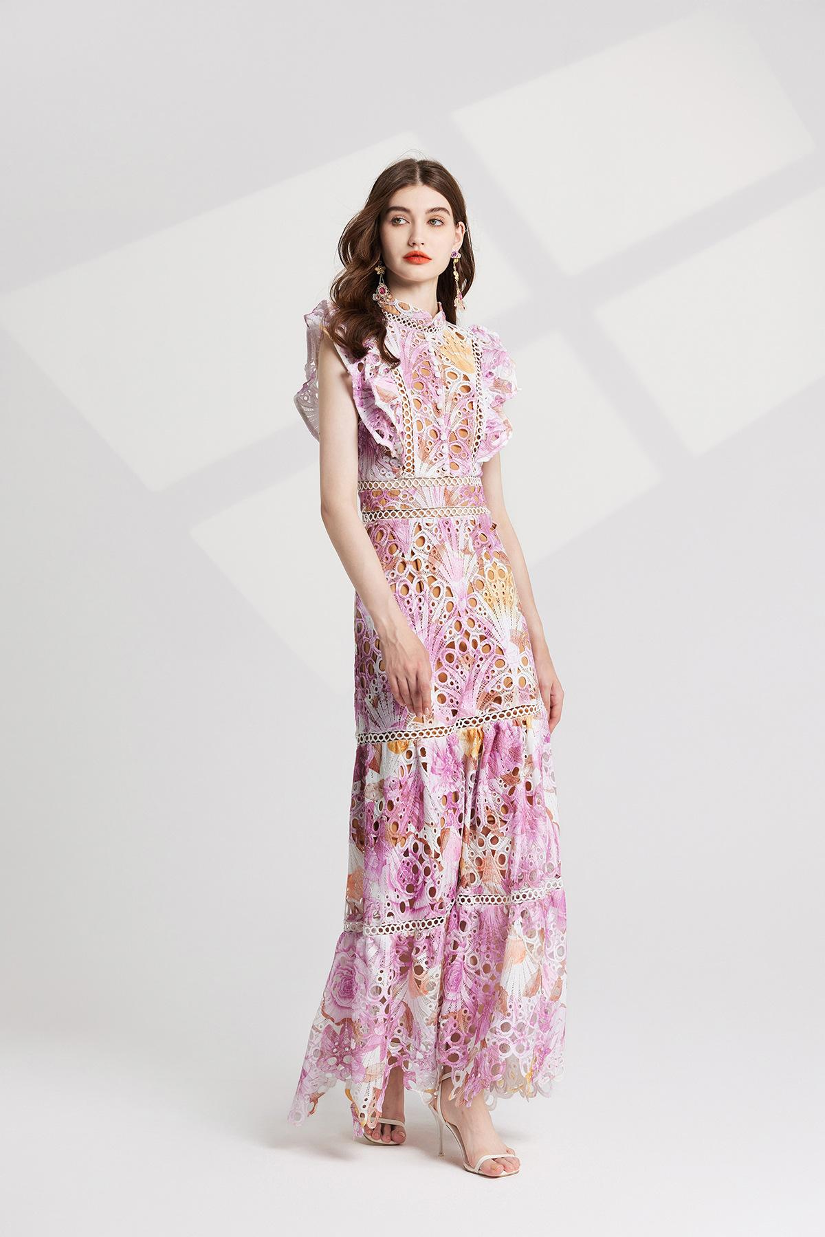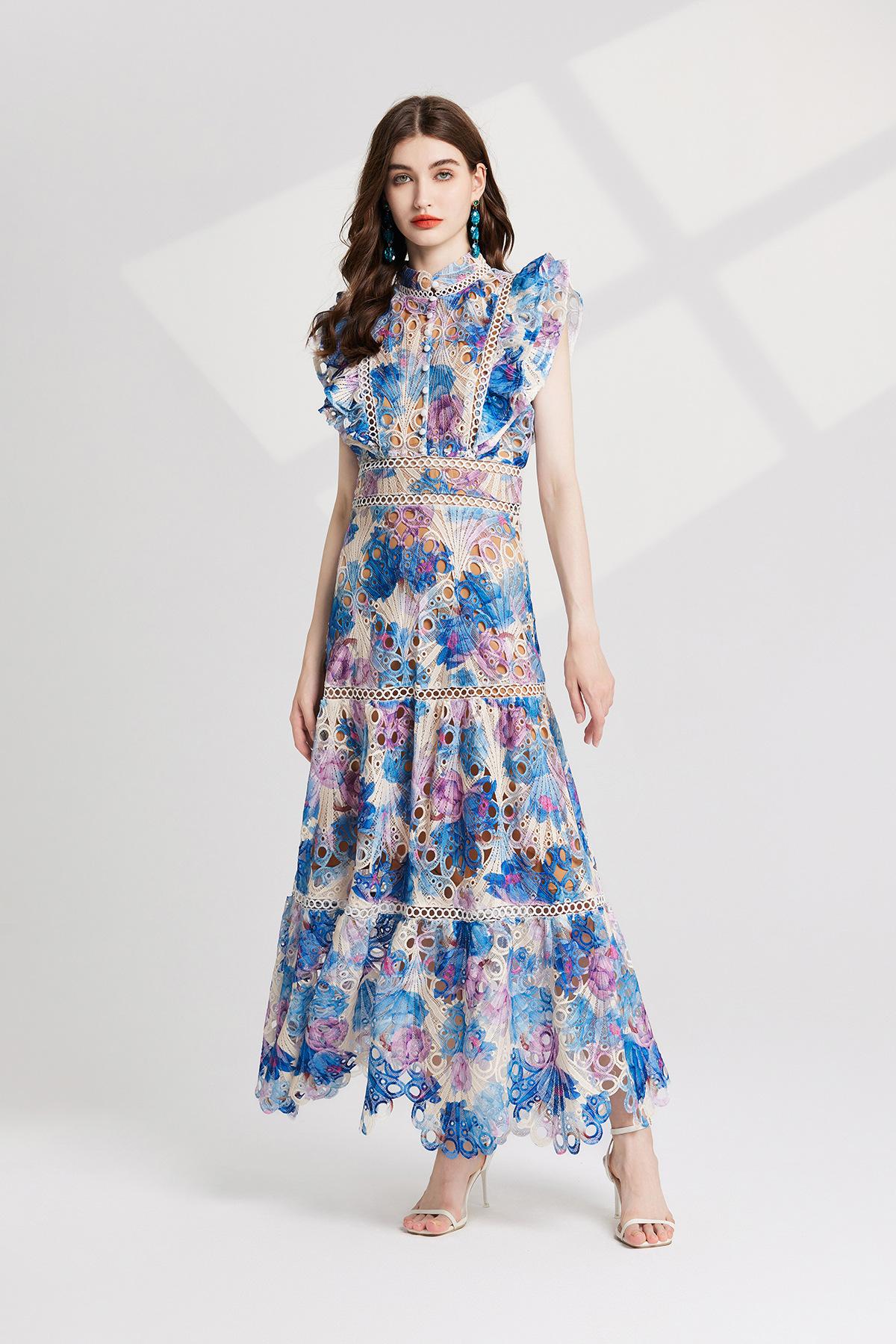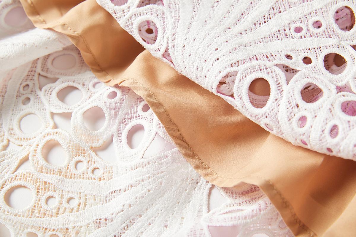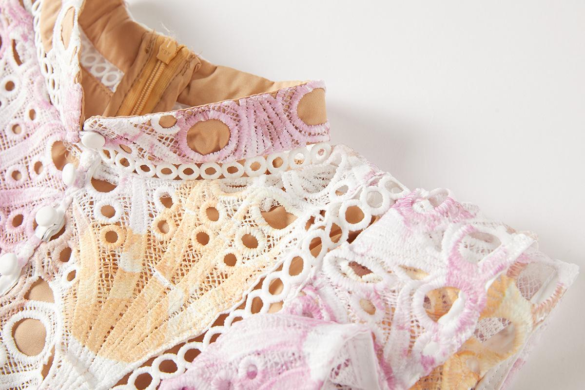 Vestido de encaje estilo moda de vacaciones estilo europeo y americano para mujer 2024 con cuello mao pequeño, manga mariposa y cintura alta