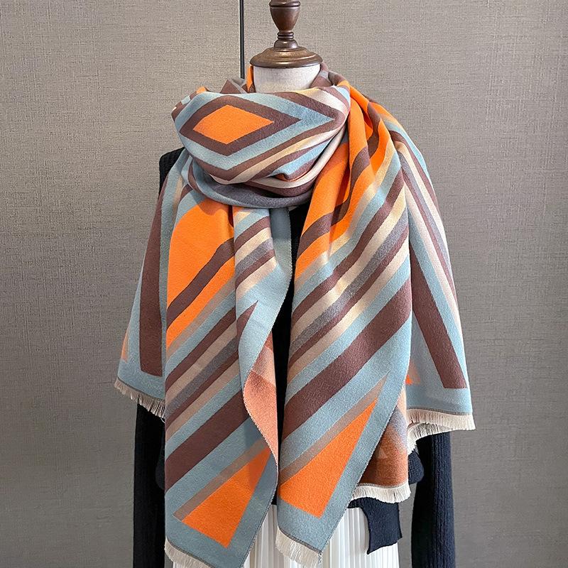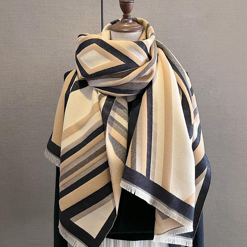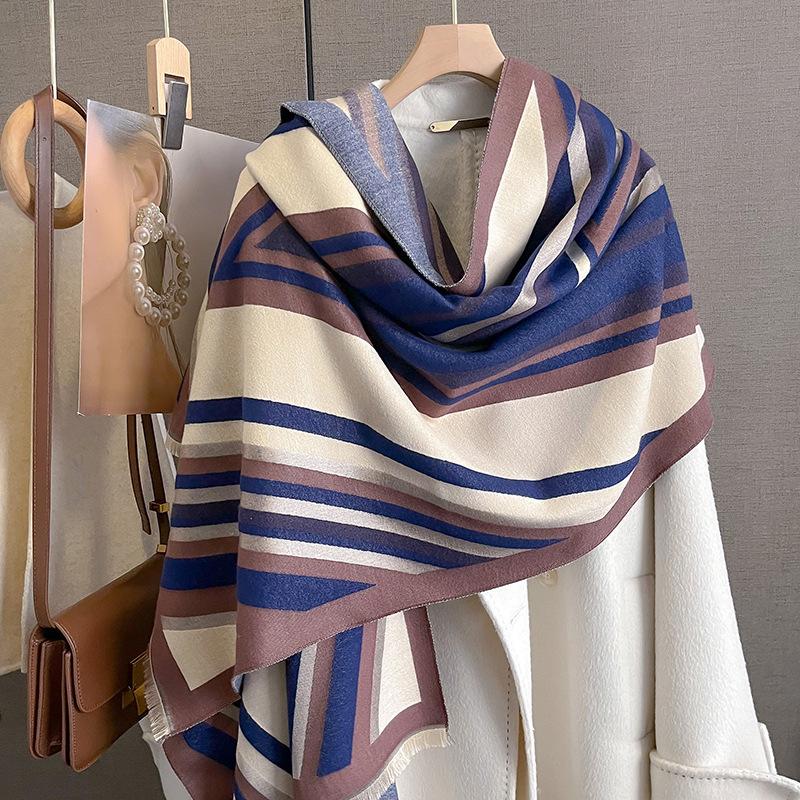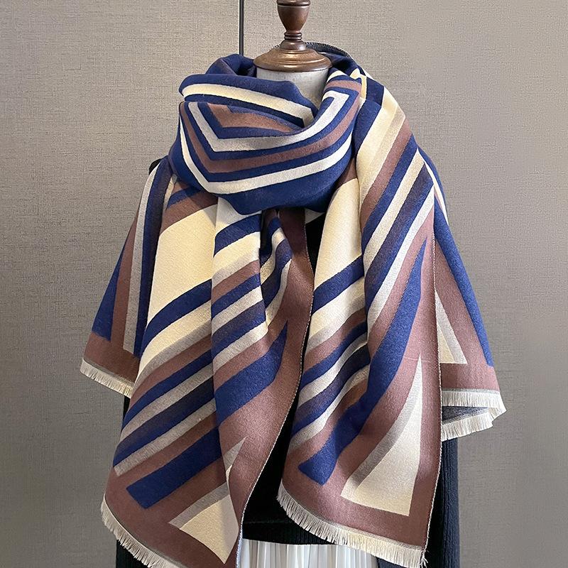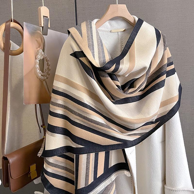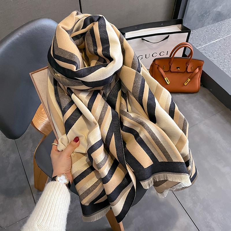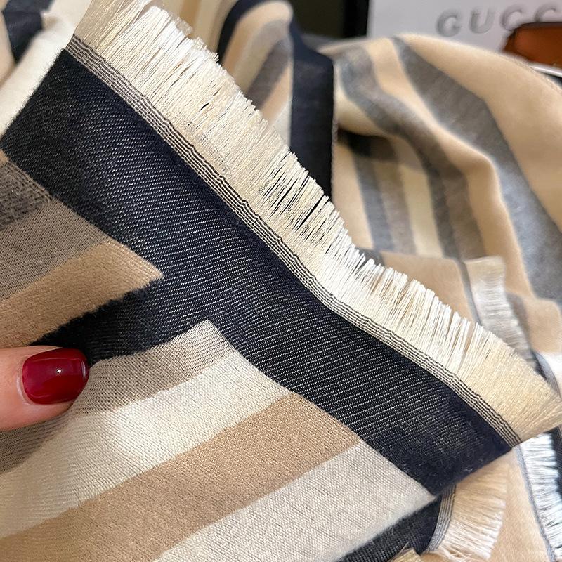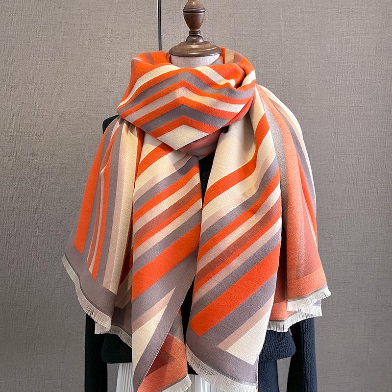 2023 nuevo otoño e invierno estampado de rayas engrosado cálido chal de mujer bufanda corta con flecos similar a la cachemira respetuosa con la piel al por mayor