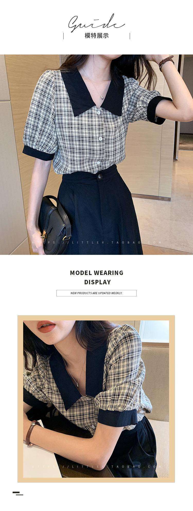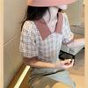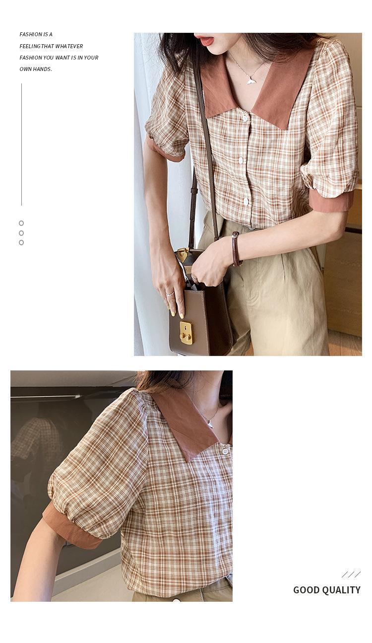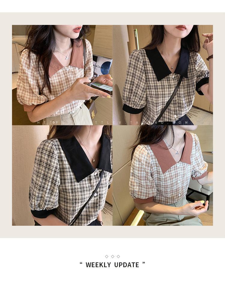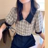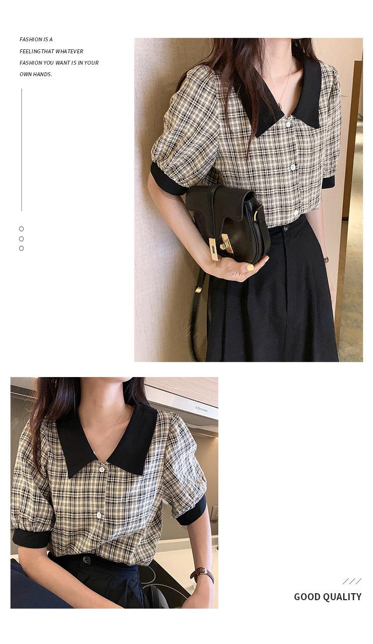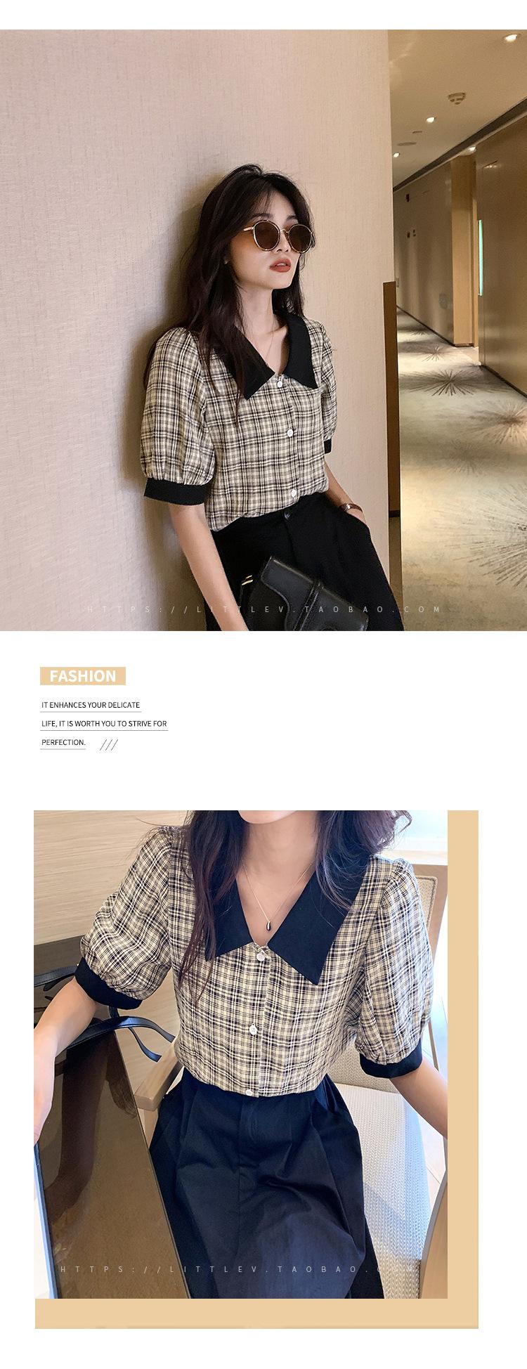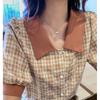 Camisa a cuadros para mujer, diseño de verano nuevo, nicho, top francés retro, estilo Hong Kong, camisa de manga abullonada