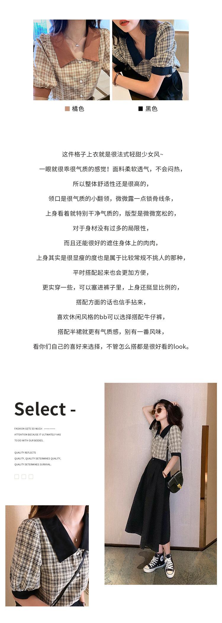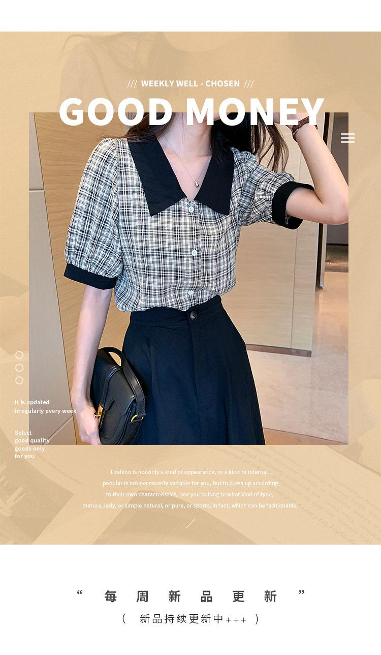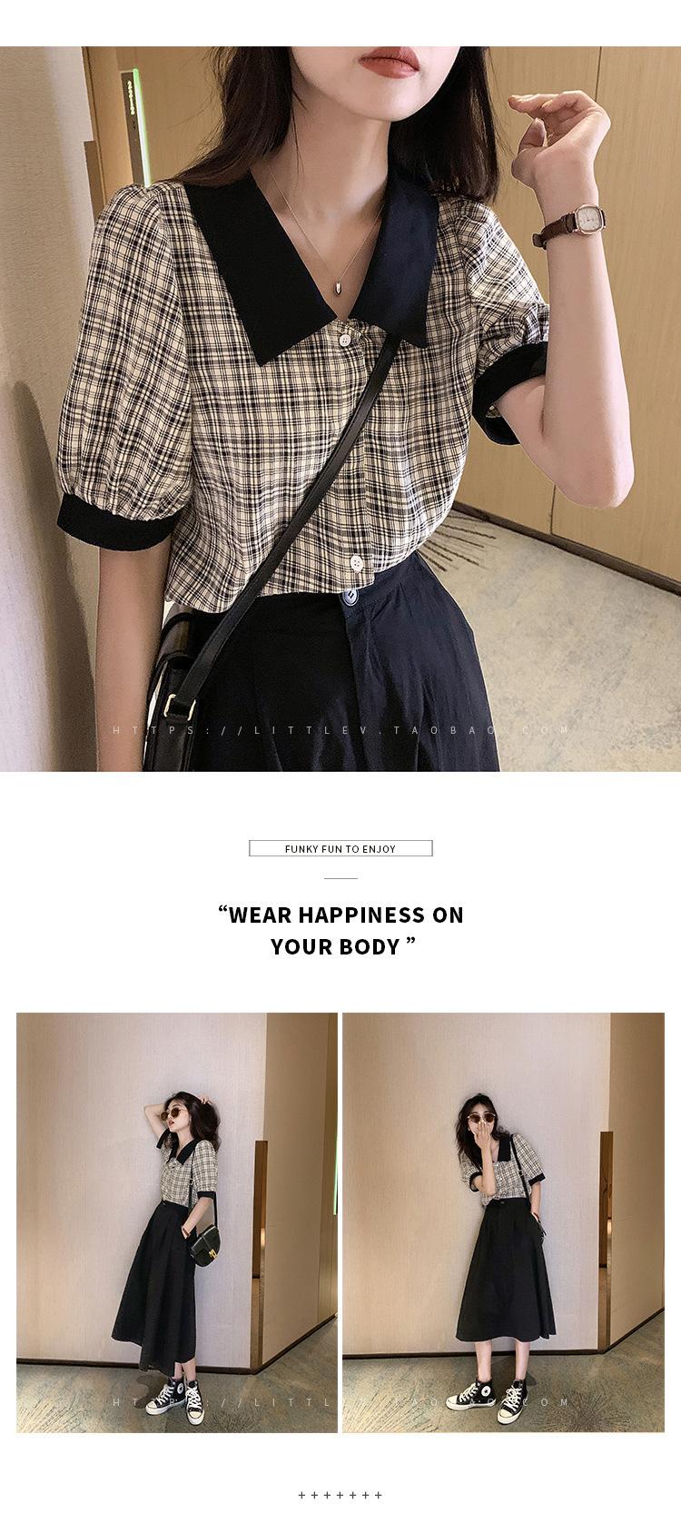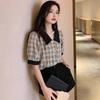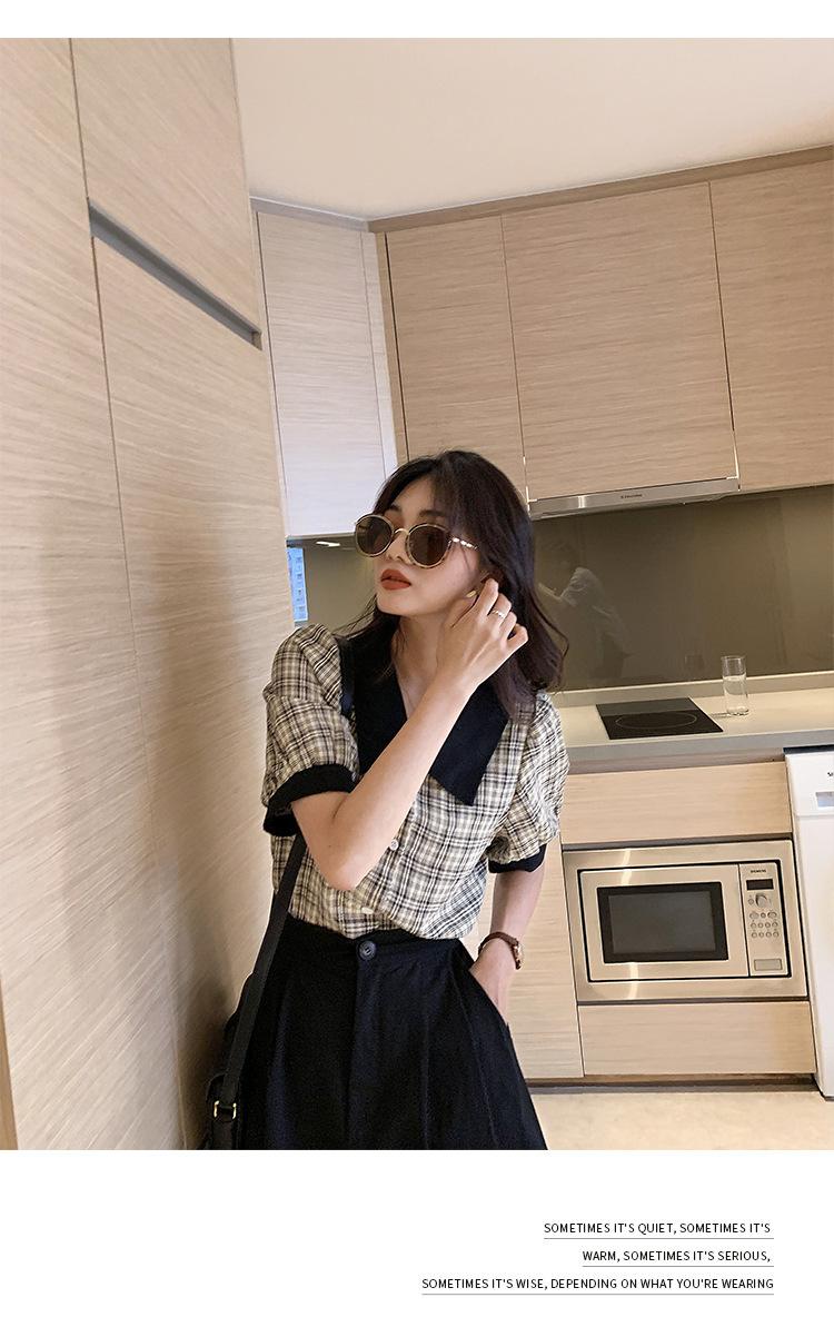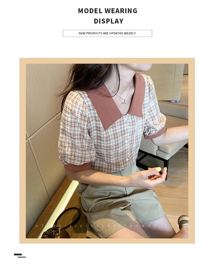 Camisa a cuadros para mujer, diseño de verano nuevo, nicho, top francés retro, estilo Hong Kong, camisa de manga abullonada