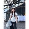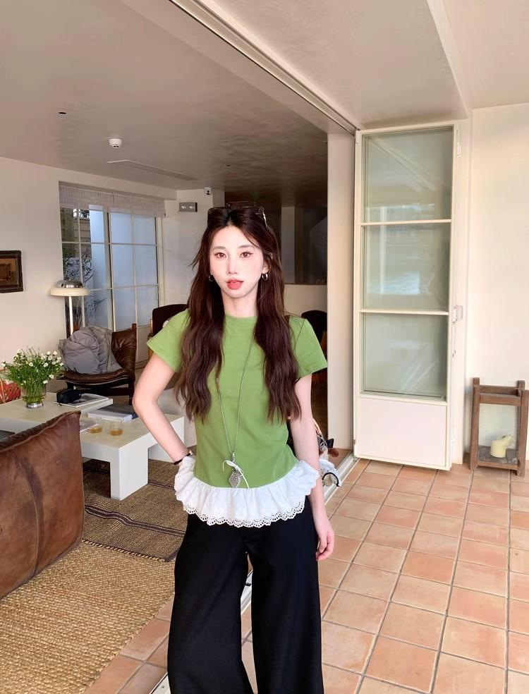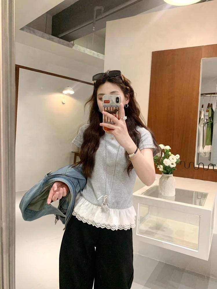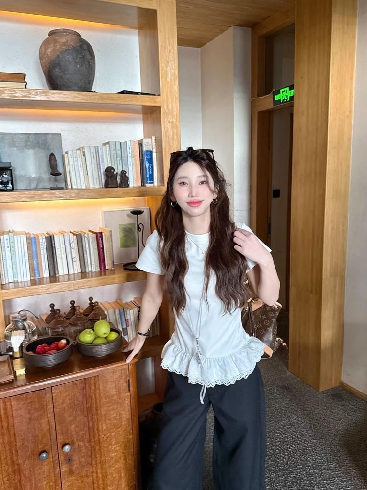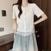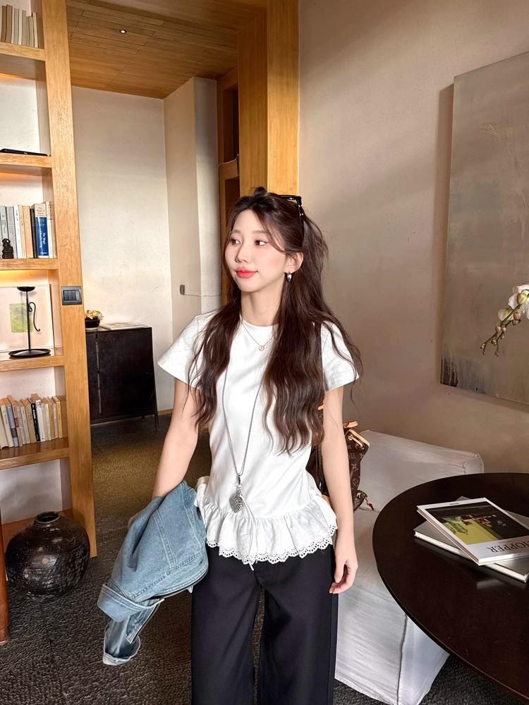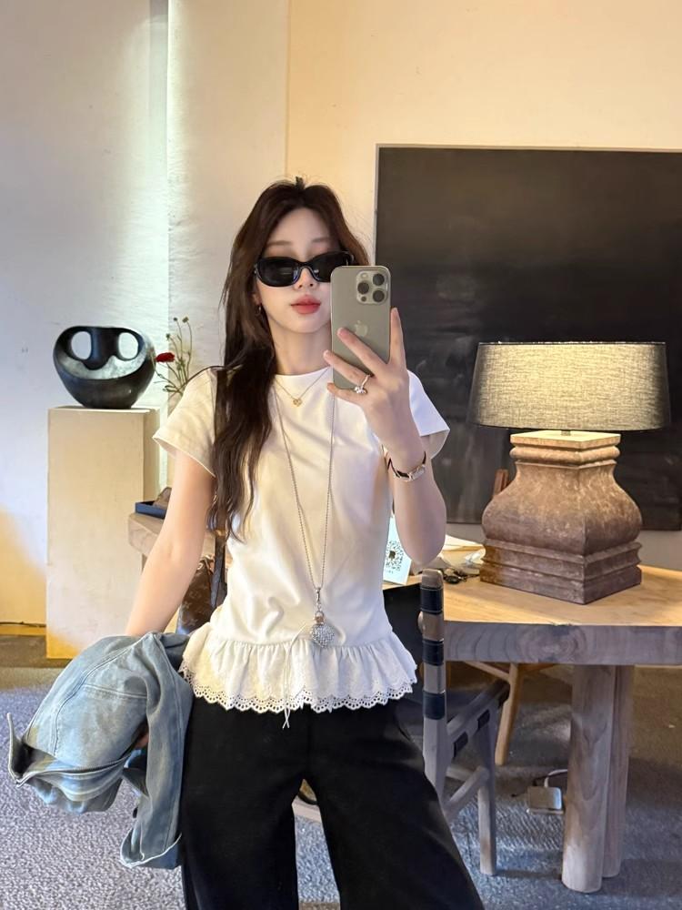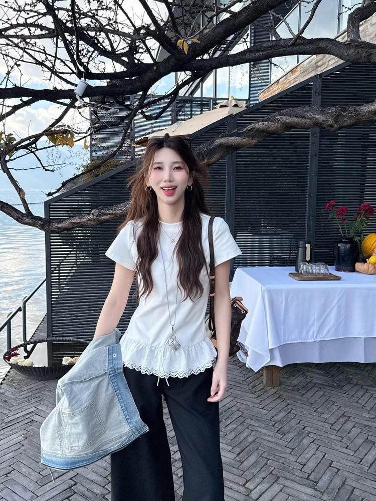 Jiujiu Encaje Blanco Empalme 2025 Nueva Camiseta de Manga Corta para Mujer Diseño de Verano Nicho Slim Camiseta Básica