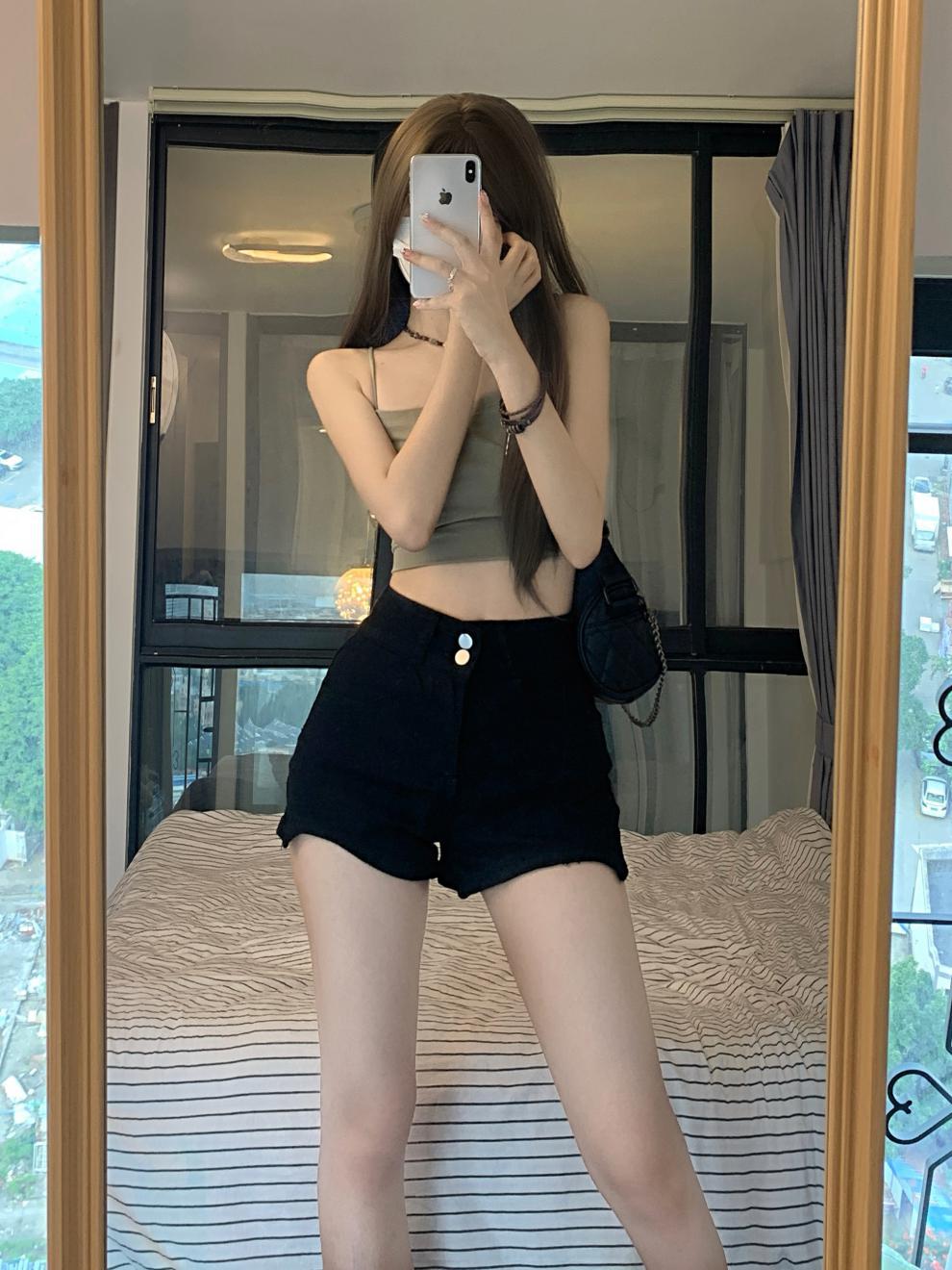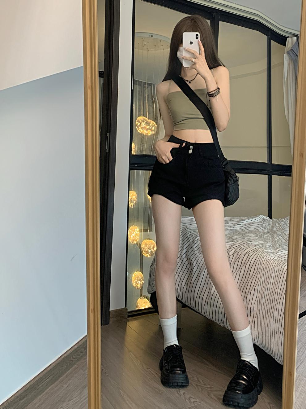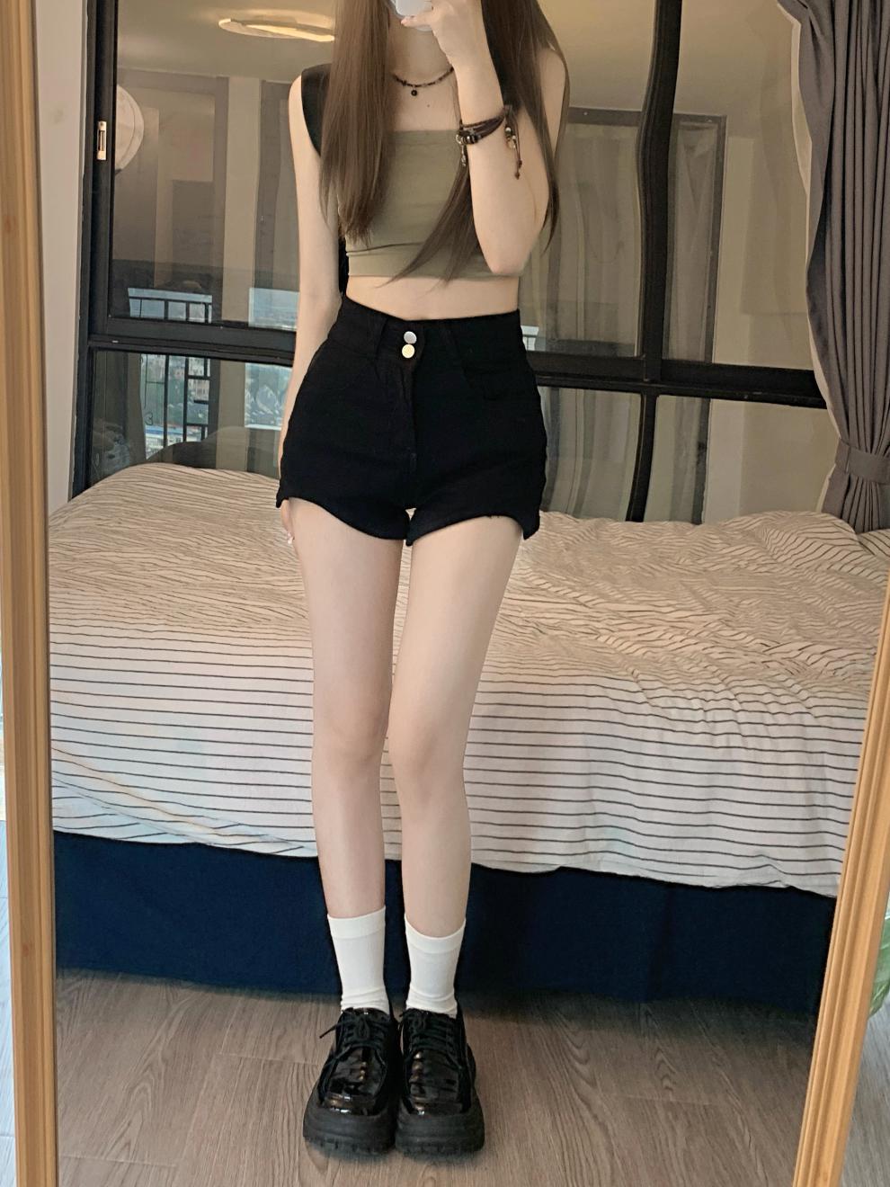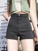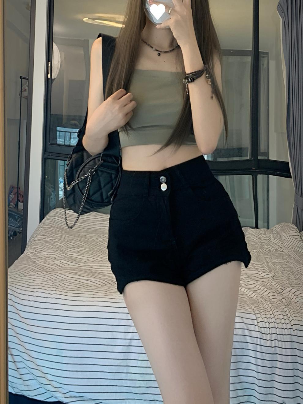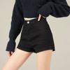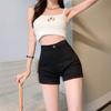 Shorts de Mezclilla Negros para Mujer Verano Nuevo Estilo Americano Doble Hebilla Cintura Alta Ajustados Slim Cadera Calientes Pantalones Línea A