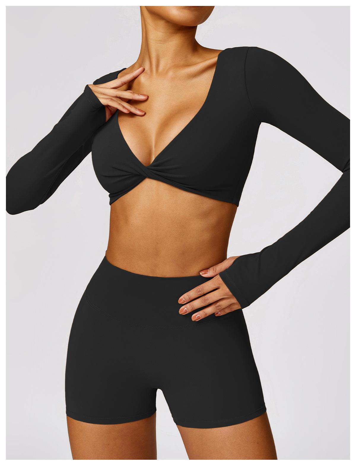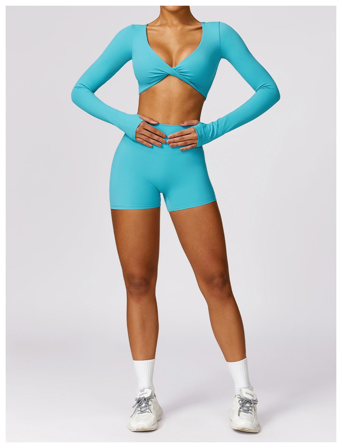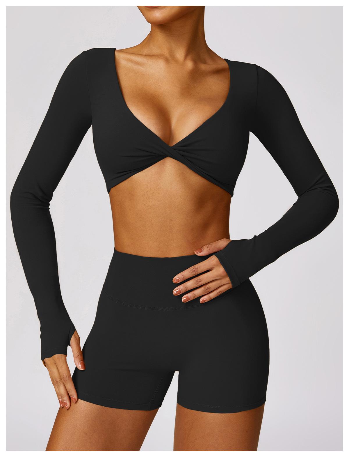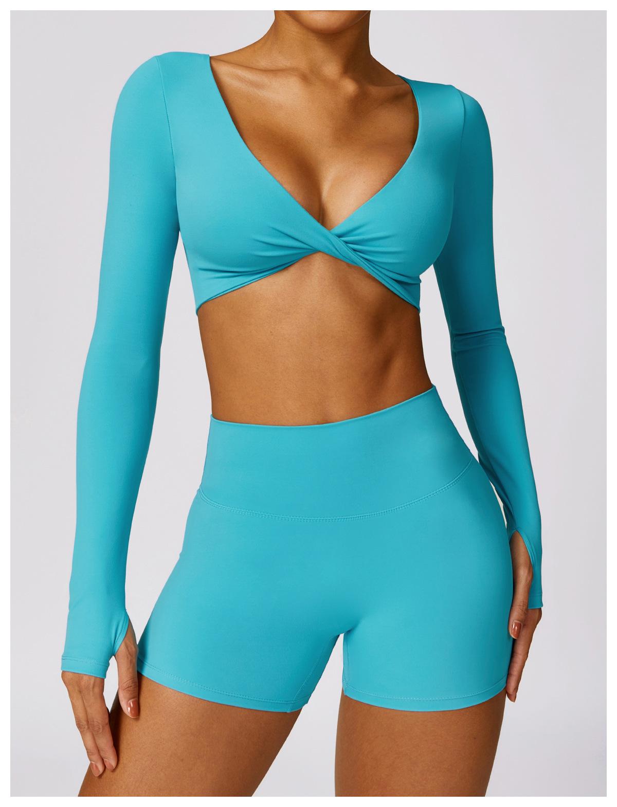 Traje Ropa de Yoga Cruzada Europea y Americana Top de Manga Larga con Cuello en V para Mujer Ropa de Fitness Ajustada Ropa de Entrenamiento para Pilates