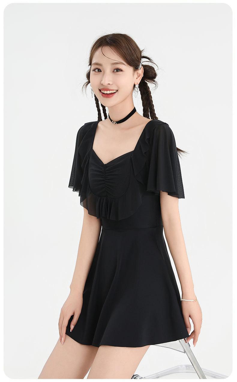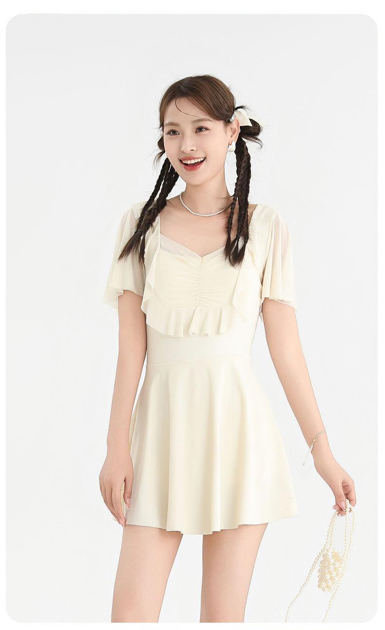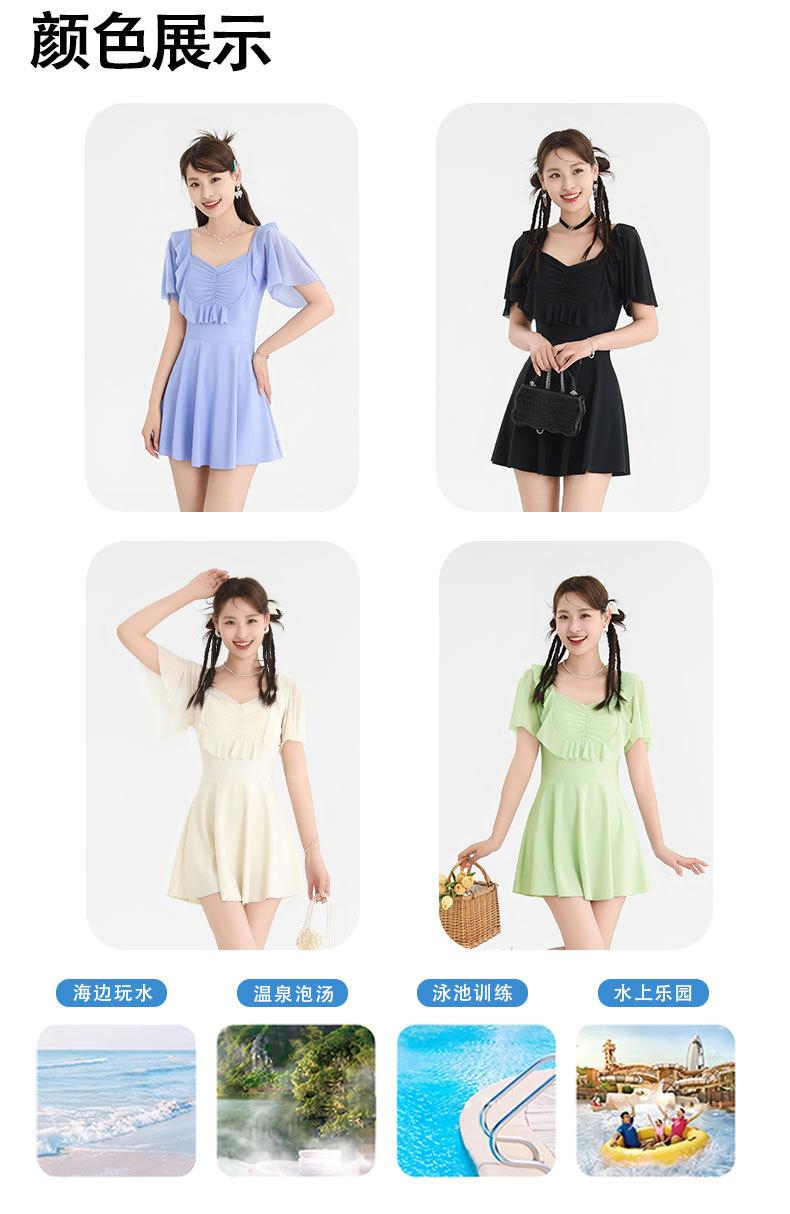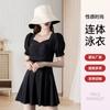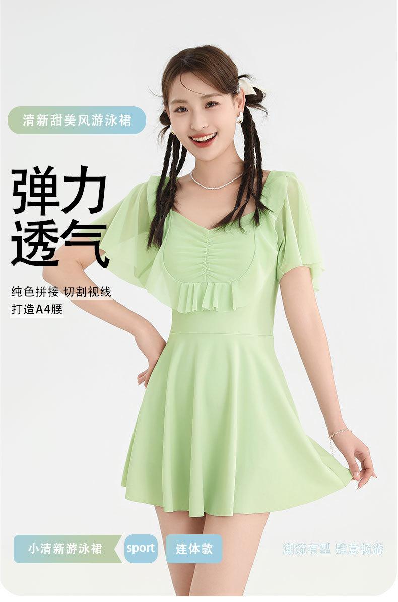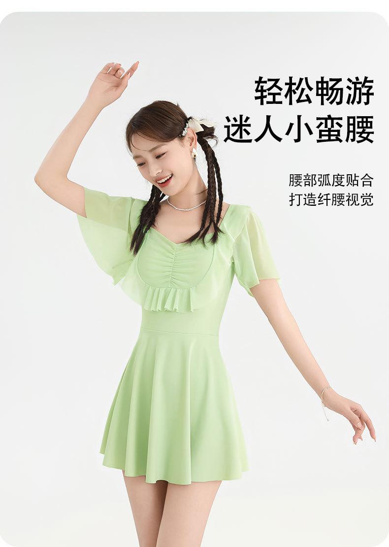 Traje de Baño de Verano Nuevo de Color Sólido Talla Grande para Mujer Una Pieza Falda Conservador Adelgazante Dulce Retro Manga Abullonada Traje de Baño Casual