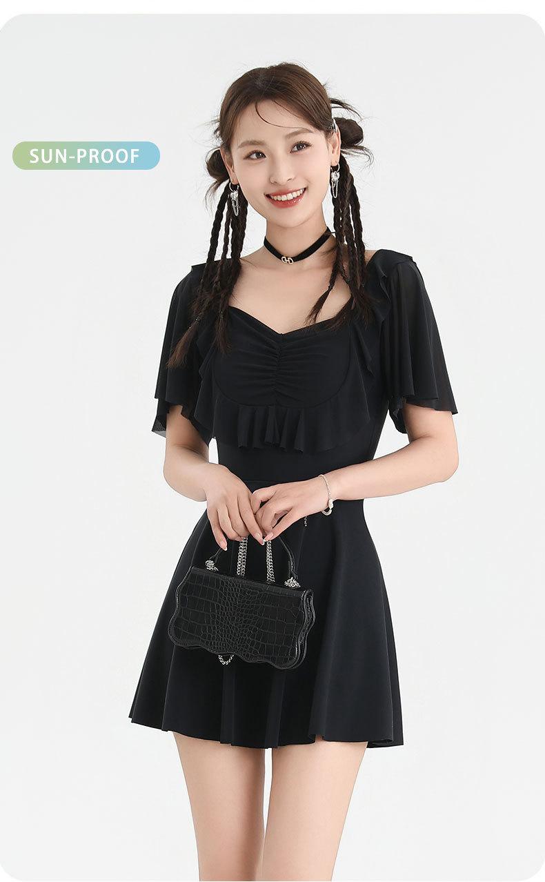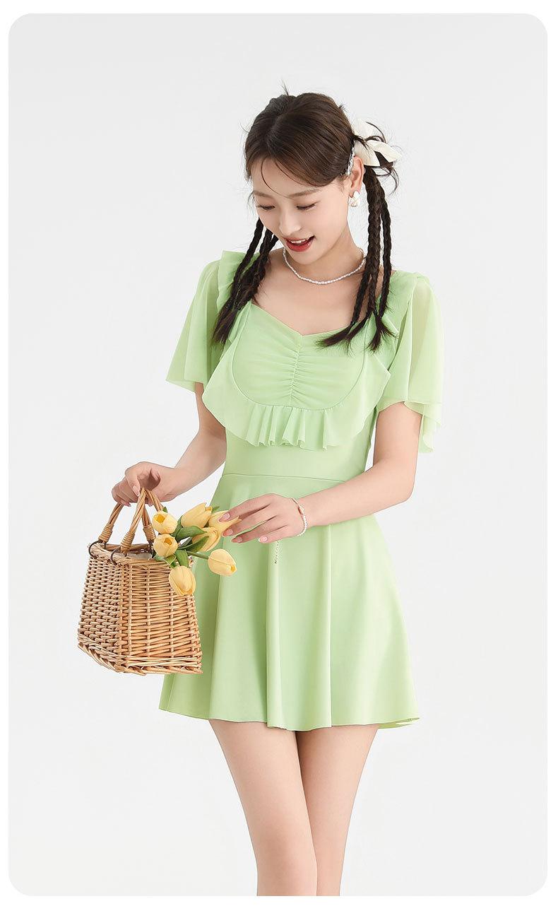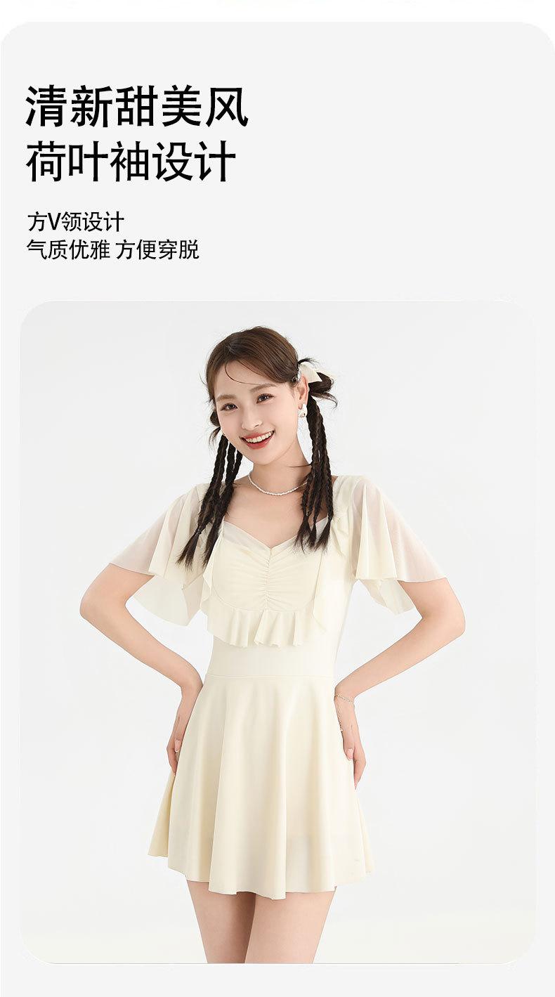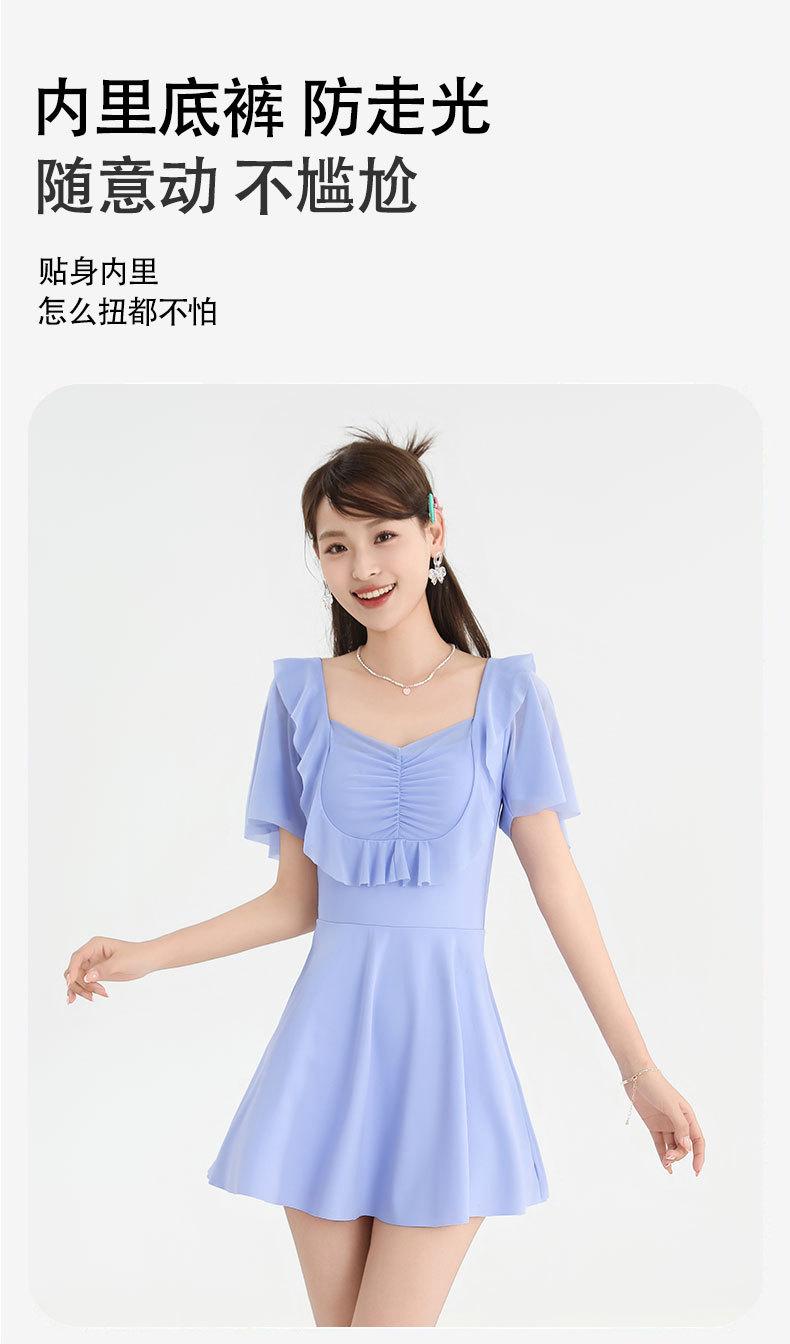 Traje de Baño de Verano Nuevo de Color Sólido Talla Grande para Mujer Una Pieza Falda Conservador Adelgazante Dulce Retro Manga Abullonada Traje de Baño Casual