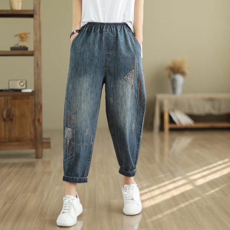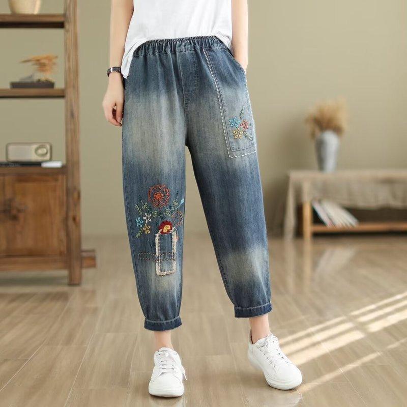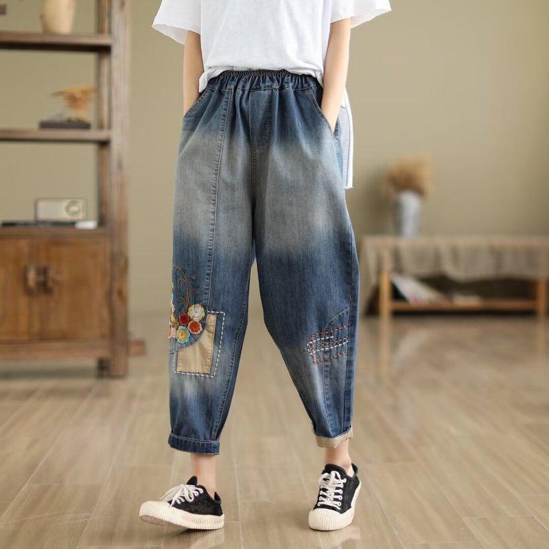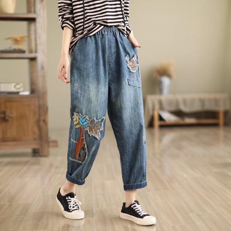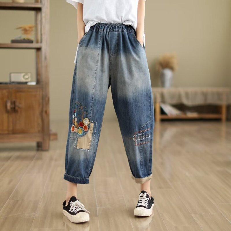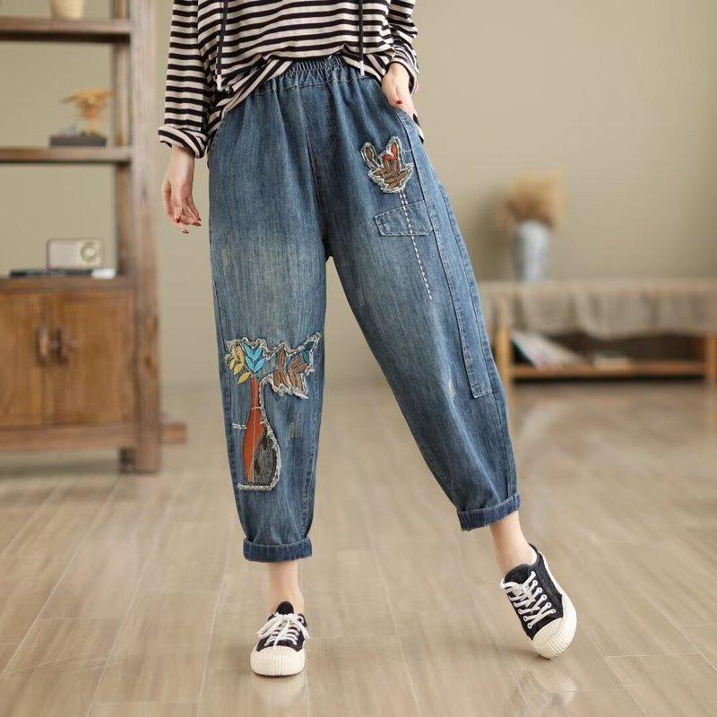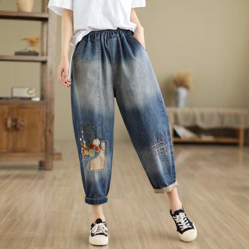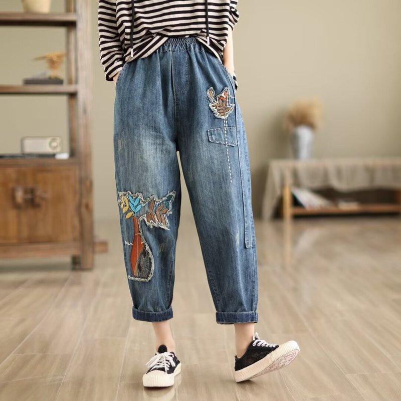 Primavera/Verano 2024 Nuevo jarrón de parche retro bordado pantalones harem sueltos casuales de mezclilla capri para mujer