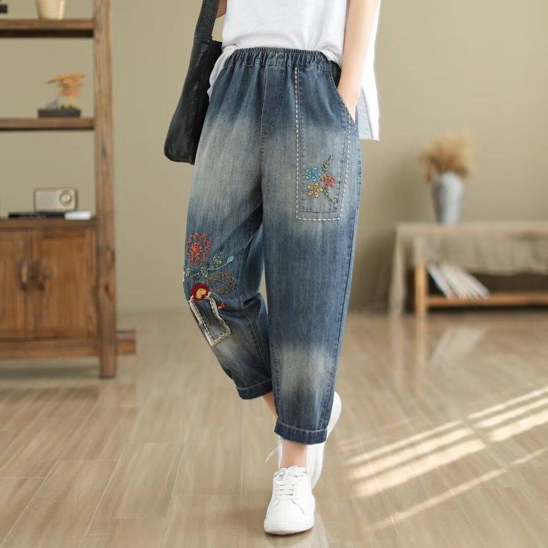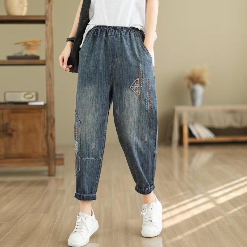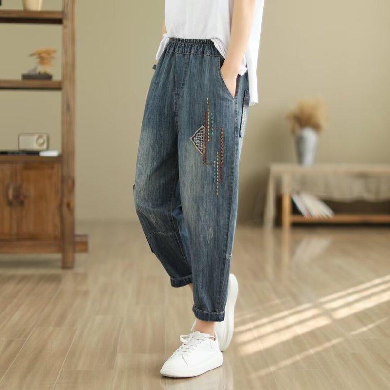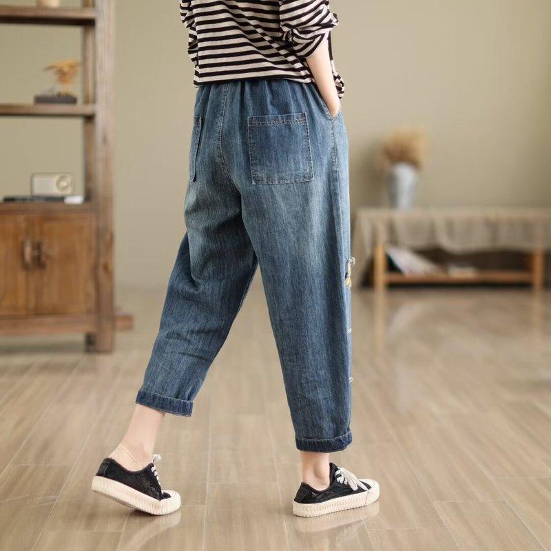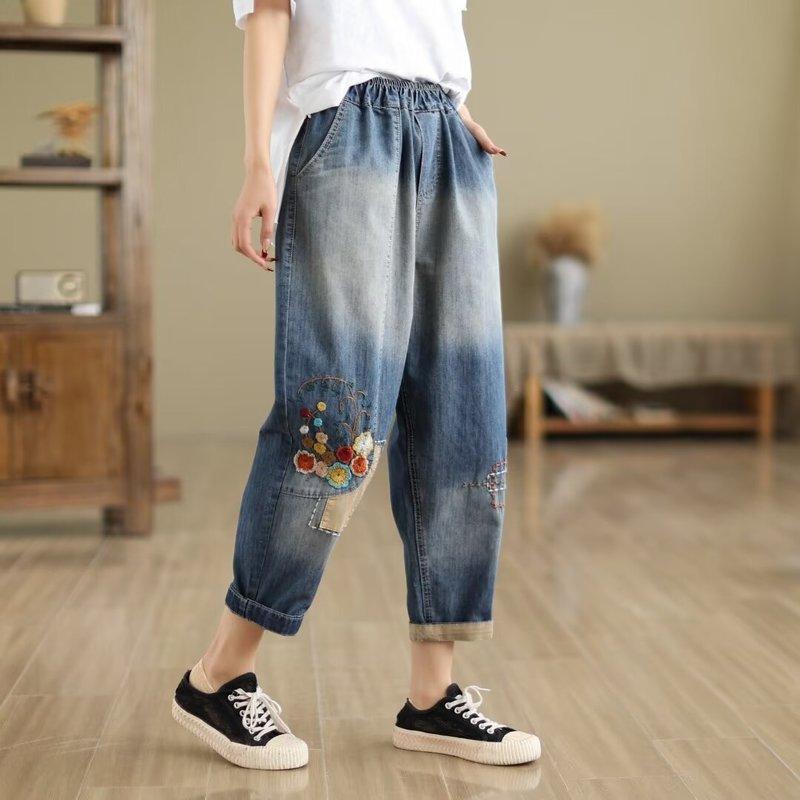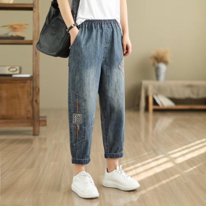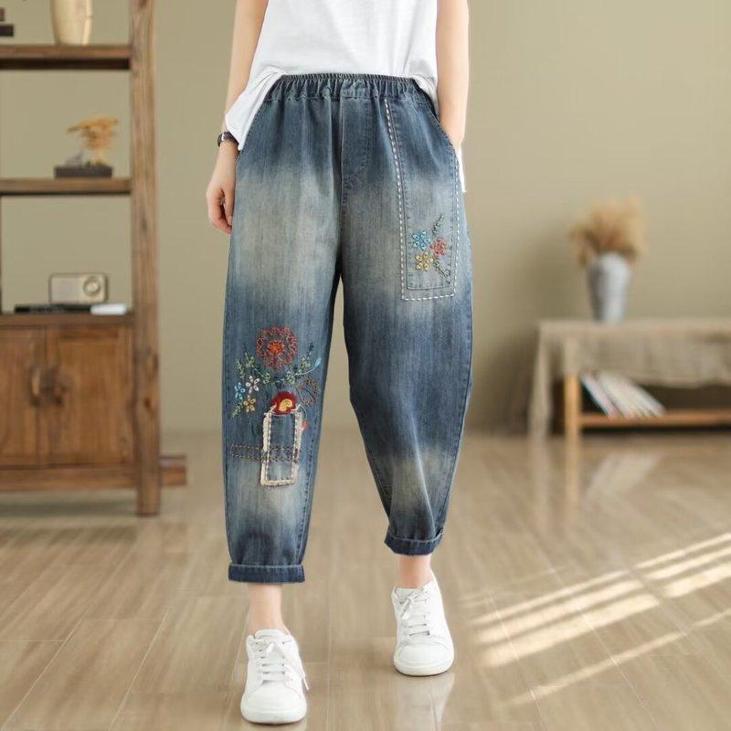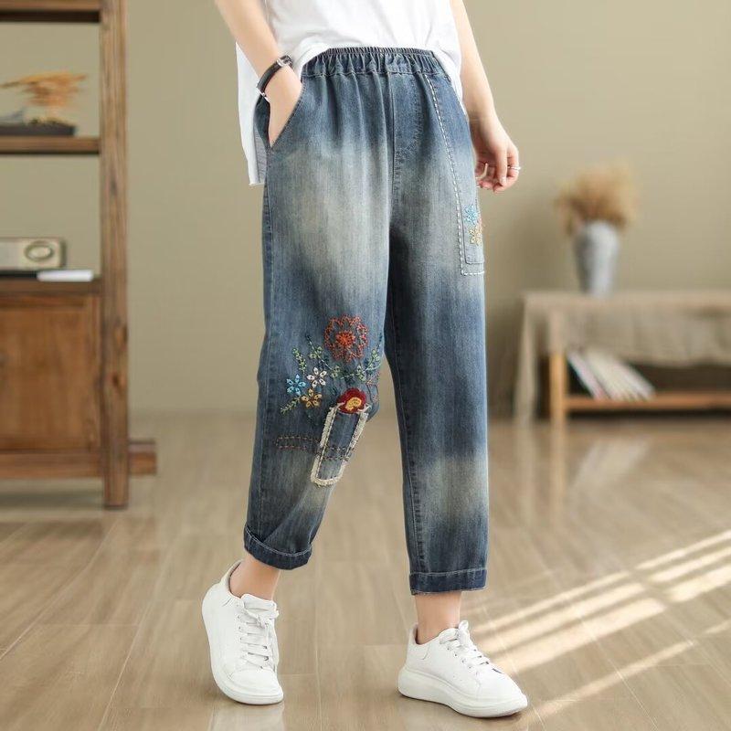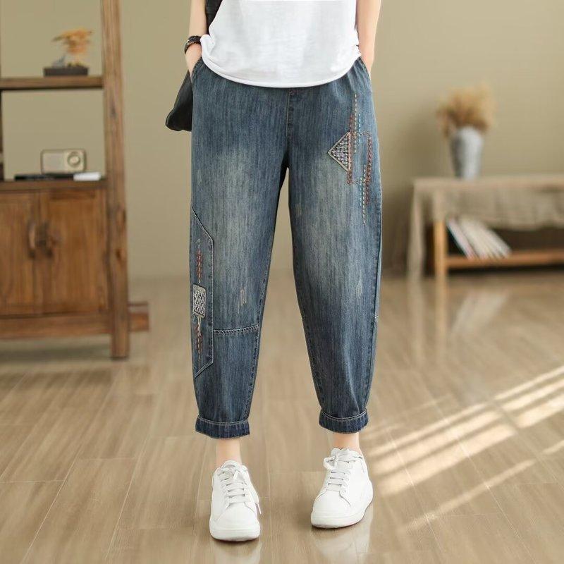 Primavera/Verano 2024 Nuevo jarrón de parche retro bordado pantalones harem sueltos casuales de mezclilla capri para mujer
